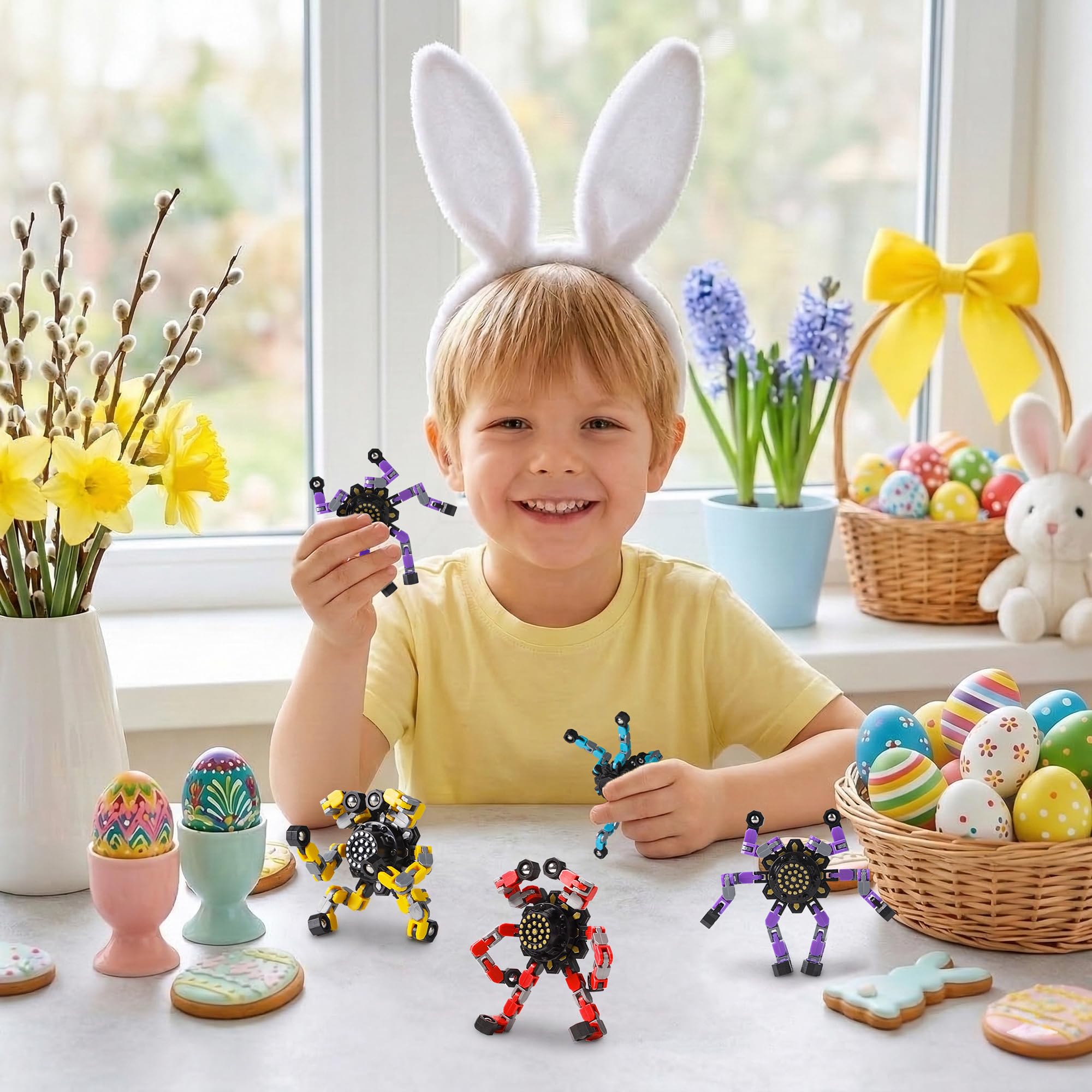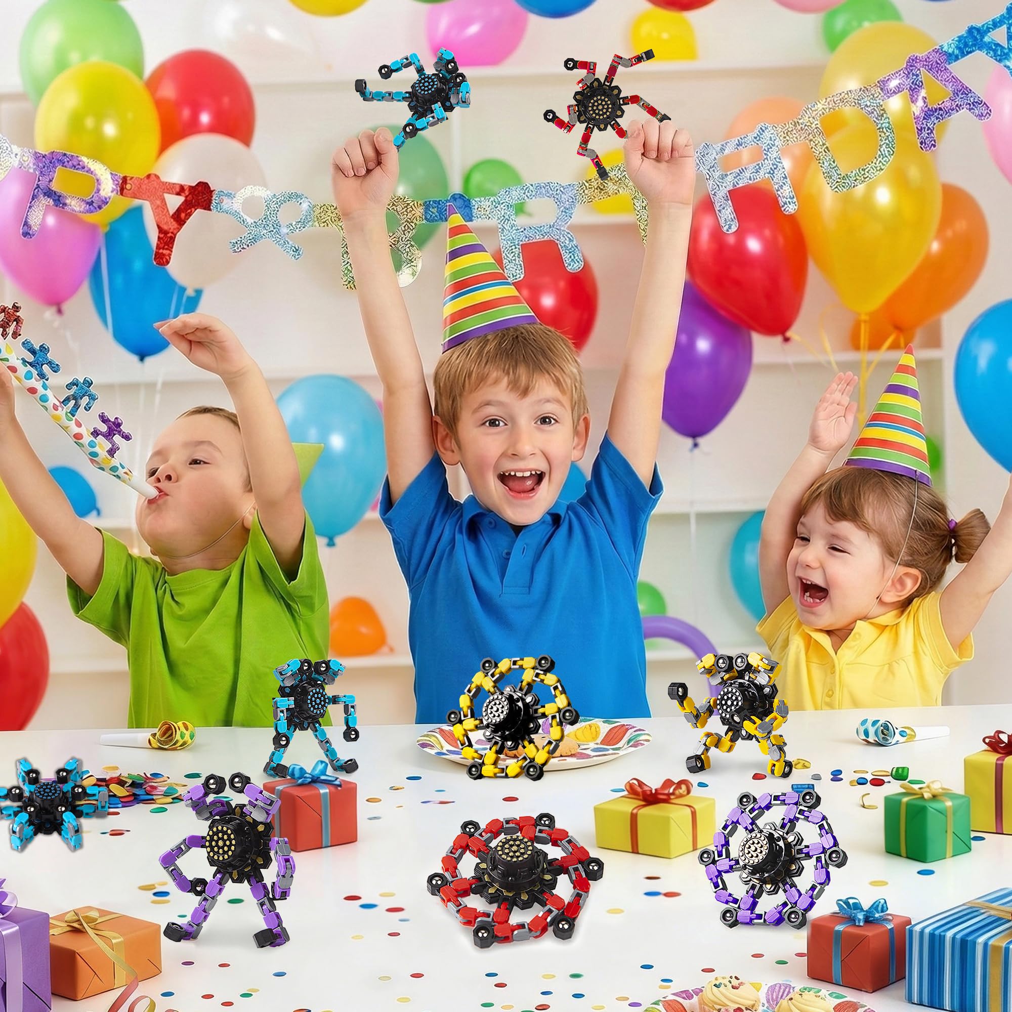 【Transformable Finger Gyros】4 colors (red yellow blue purple) finger spinners included. Each fidget spinner has six deformable chains. Each of the links can pivot and lock into 5 positions, you can create any shapes you want, such as various shapes of spinners, robots and even mobile phone holders. It can also exercise your kid’s hands-on ability, hand-eye coordination and logical thinking ability by changing the shape of the toys