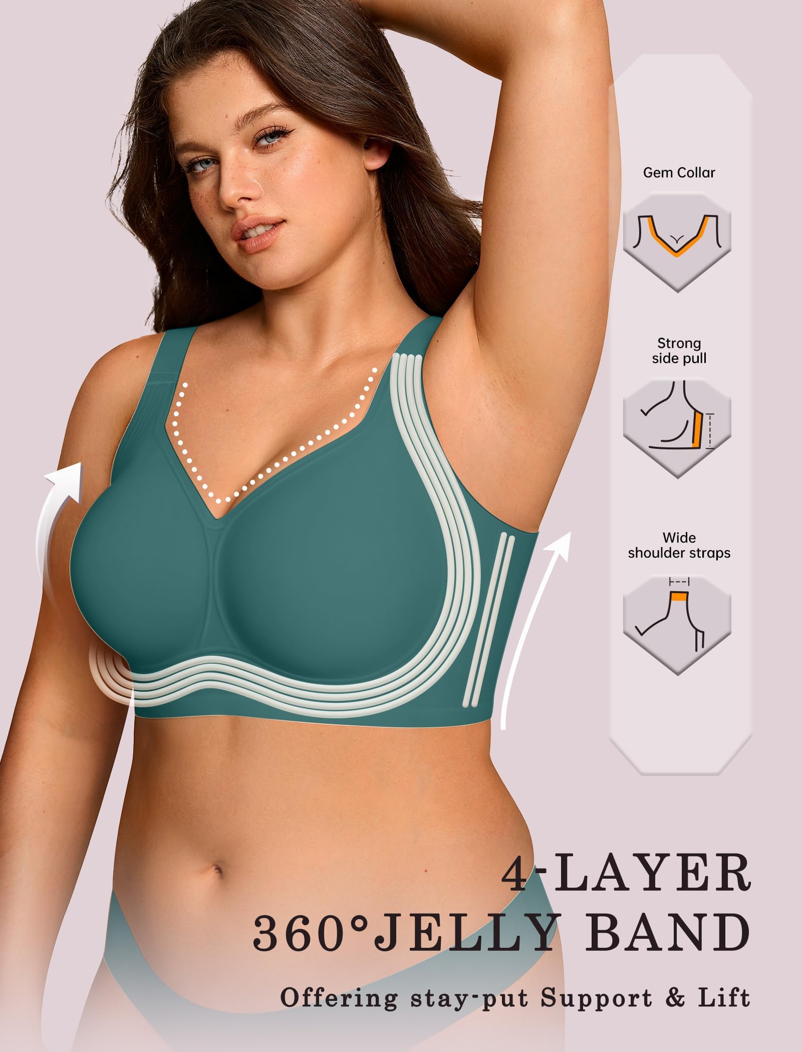 Full Coverage Bras No Underwire - The V neck Bras Designed with no wire to provide a natural relaxed fit while offering great support through 360° jelly strips, ensuring all day comfort. Lightweight bras keep skin cool and dry. The widened elastic band stays securely in place without rolling or shifting, ensuring stability during movement. A perfect combination of freedom and support for everyday wear.