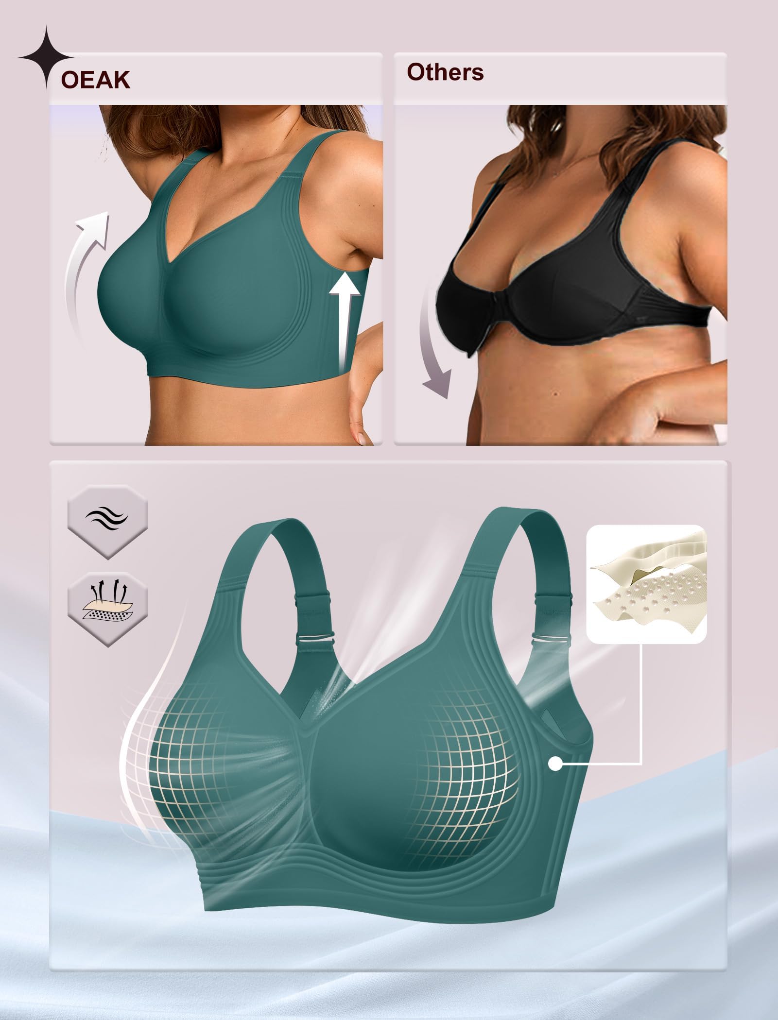Seamless Tshirt Bras - OEAK Full Support Bras for women are perfect for work, lounging, dating, party, dancing or light activities-all day long. They can be worn under any clothing and serve as everyday bras, t-shirt bras, sleep bras, yoga bras, light sports bras, and pregnancy bras. Simply place the bra in a laundry bag before washing to retain its shape and elasticity. With proper care, it will stay as good as new for longer.