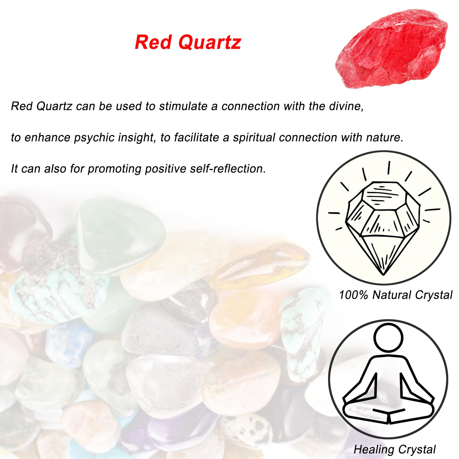 Natural: You will receive 1pcs authentic raw Red Quartz stone. Red Quartz can be used to stimulate a connection with the divine, to enhance psychic insight, to facilitate a spiritual connection with nature. It can also for promoting positive self-reflection.