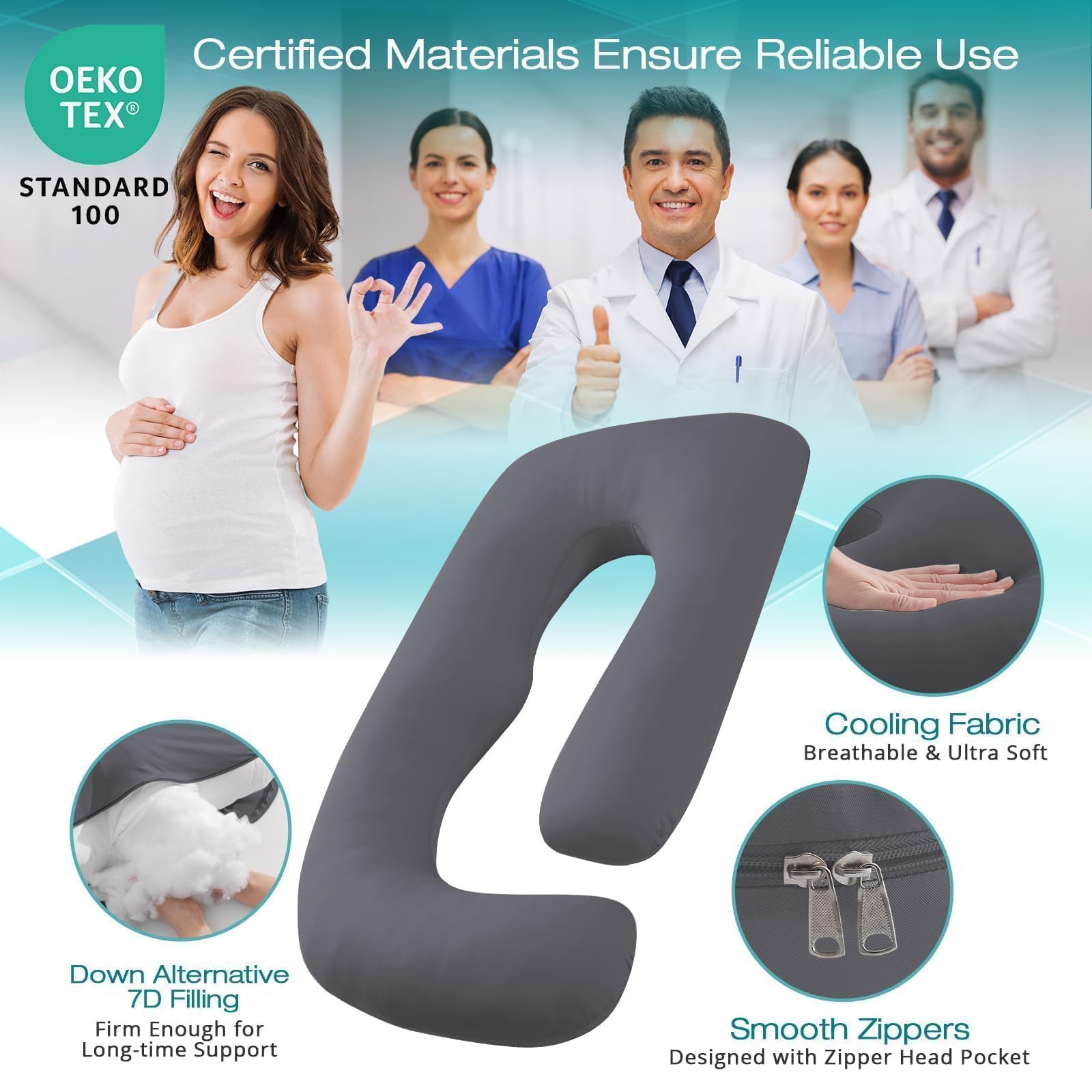 Premium Down Alternative Filling: Our U-shaped full body pillow is filled with 7lbs down-alternative filling. Blended with 40% silicified fiber and 60% polyester fibers, our pregnancy pillow strikes a good balance between support and comfort