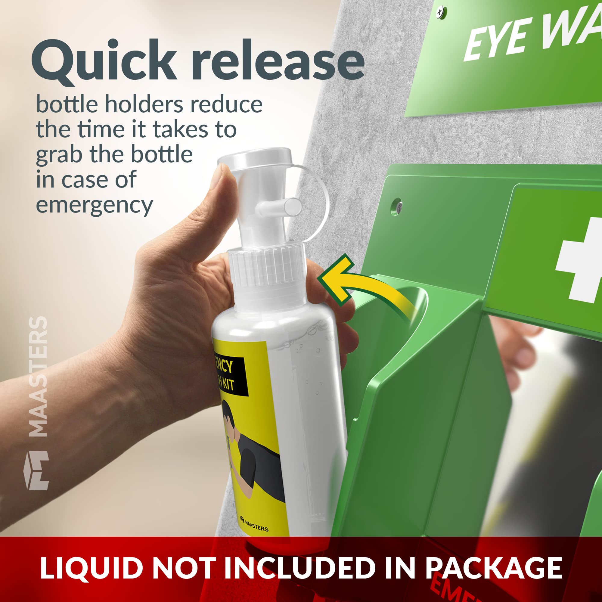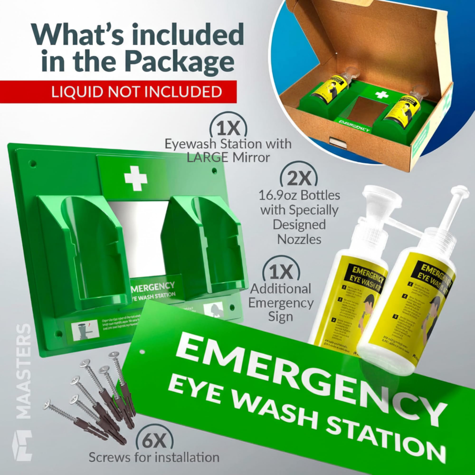 COMPLETE SET of 2: With this double eye washing station set, you get everything (no sterile saline) that a workplace needs. Our eye wash units feature the main station w/mirror, two empty bottles for saline or any eye wash solution, a large green emergency sign, and six screws for wall mounting the entire unit.