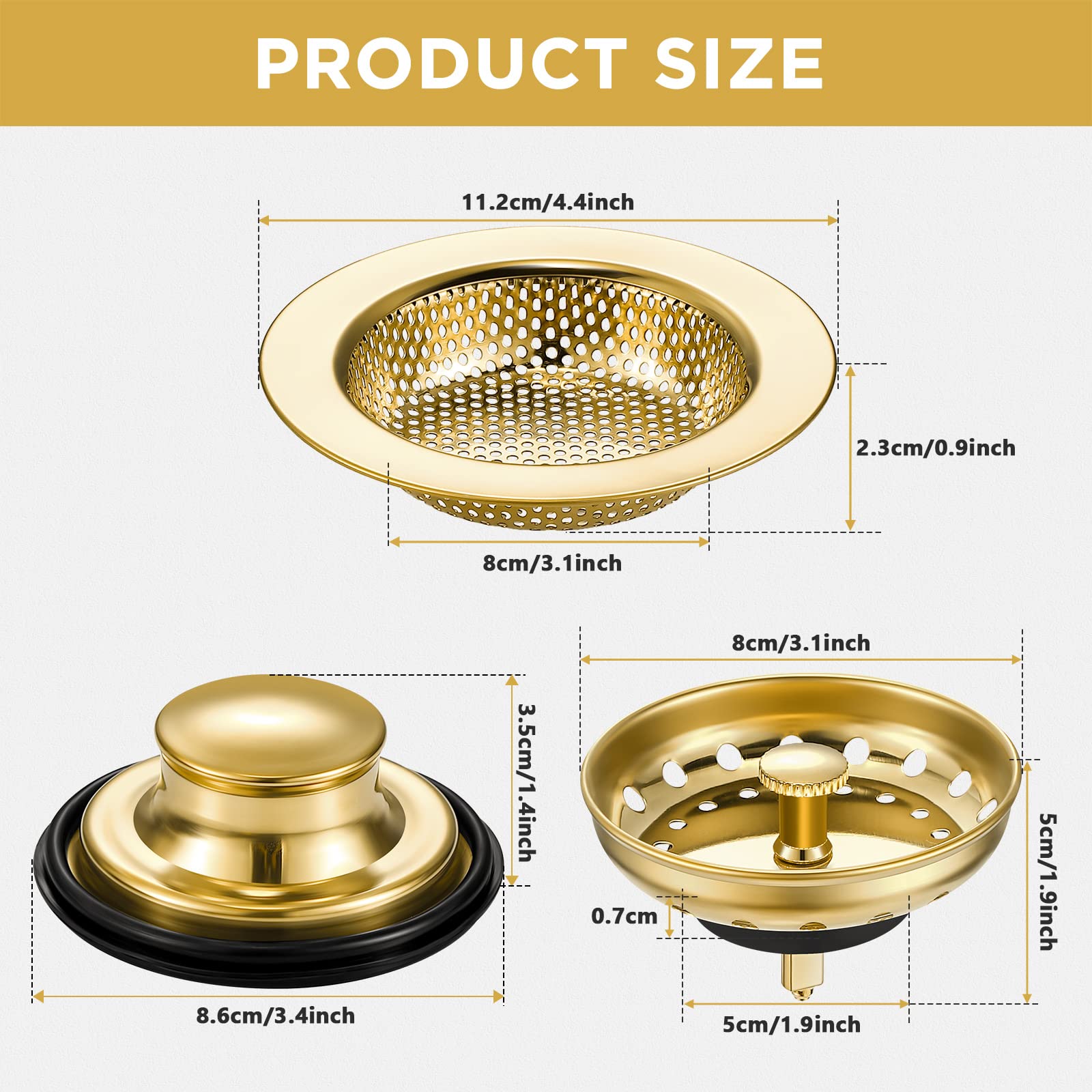 3 Pieces kitchen sink stopper strainer garbage disposal plug, stainless steel universal anti-clogging kitchen sink filter sieve basket strainer, wide rim for kitchen sink drain Safe design: With the anti clogging sink stopper and strainer, your home will be more clean and without bad smell. The sink plug has a flanged design so you can safely lift it without hurting your hands. Easy to clean: Easy wash with warm soapy water to keep the surface finish. Dishwasher safe, save your time and energy. Fit for most sink: Stainless steel sink strainer fits most sink drains and garbage disposals. No equipment or tools are required. A good sealant prevents spatter from returning or food and debris from entering the drain. Specifications:as picture shown Material: stainless steel Size: 4.5 inch, 3.1 inch, 3.4 inch Quantity: 3 Package includes: 1 x Sink basket 1 x Sink stopper for garbage disposals 1 X 2-In-1 Sink drain strainer Note: The strainer fit the sink drains with a narrow rectangular hole in the center, please confirm your sink drain hole size before order.