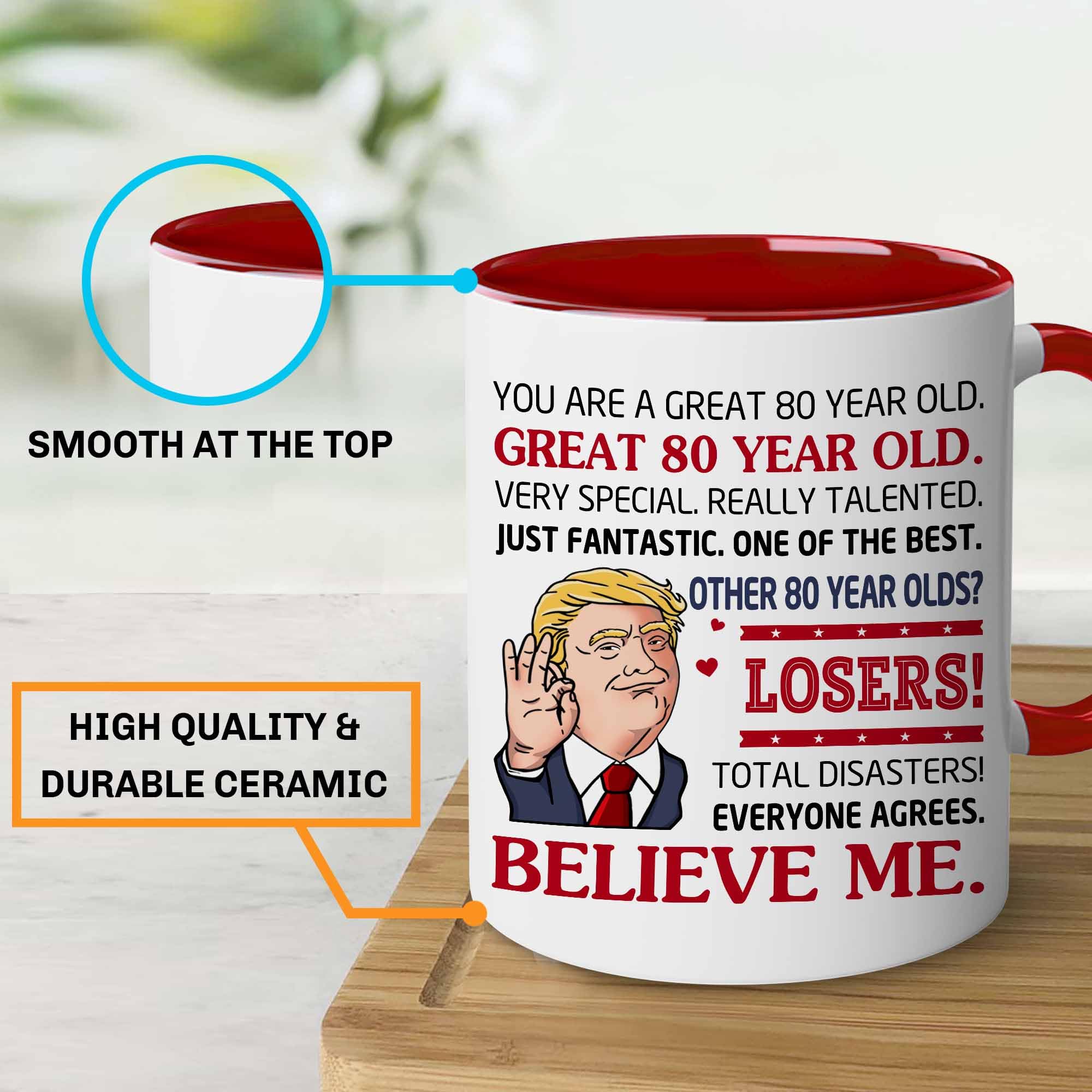 80th Coffee Mug: This 11oz ceramic mug is durable, microwave and dishwasher safe, and designed with a large comfortable handle. Whether for a 80th birthday men celebration or a surprise for your beloved grandma, our mugs are made to last and bring daily joy.