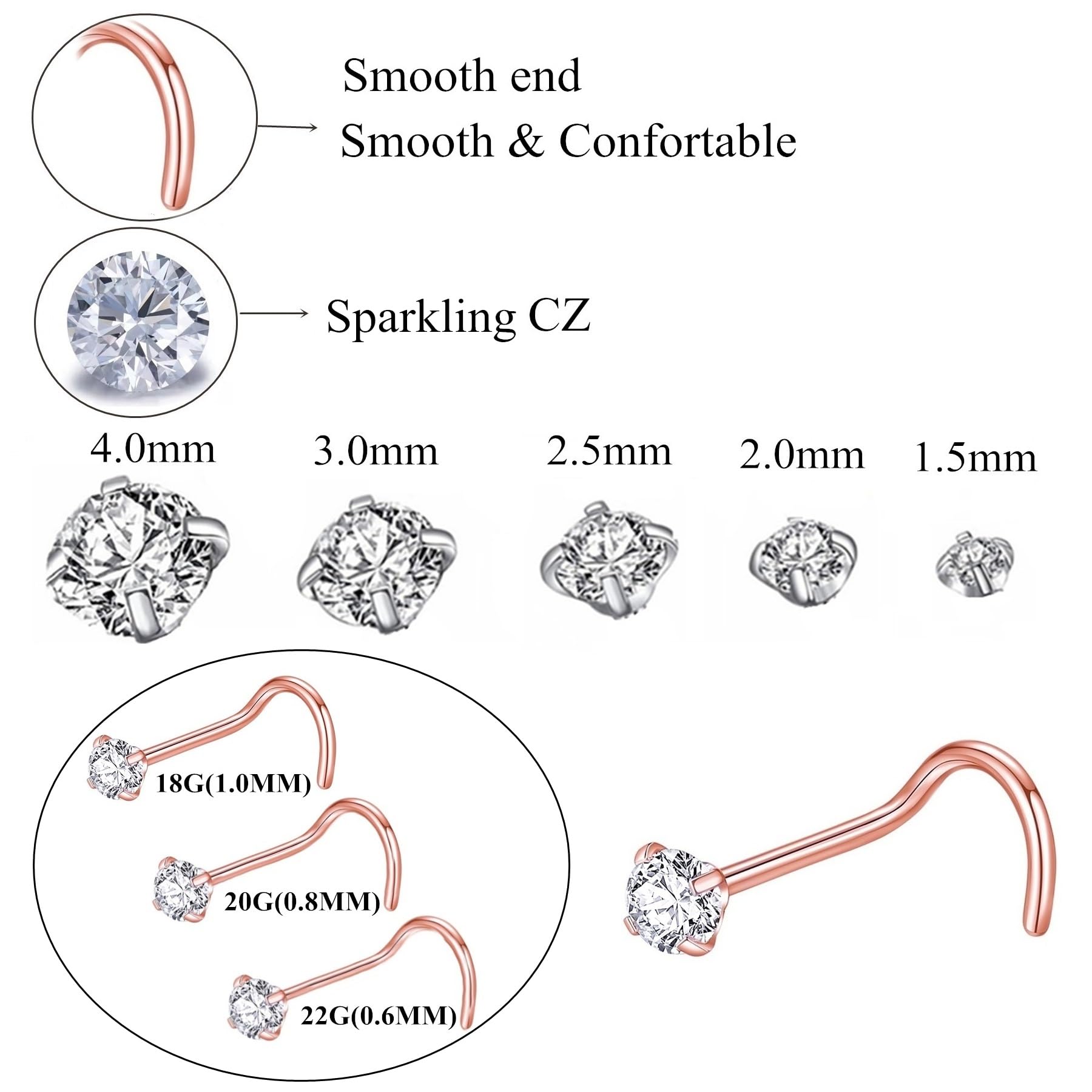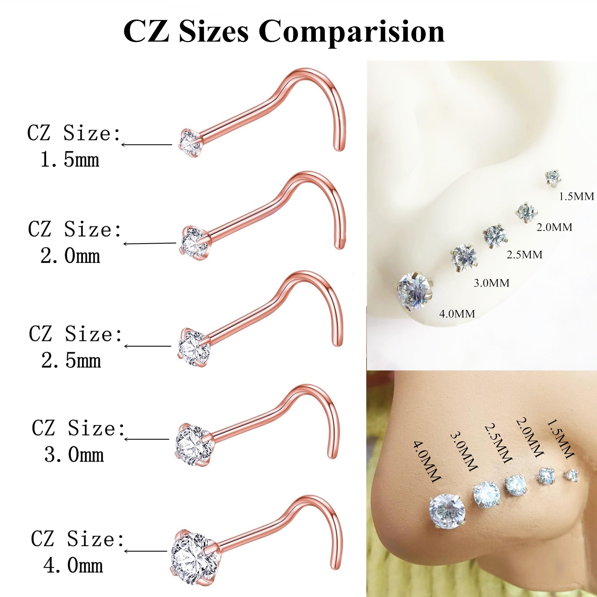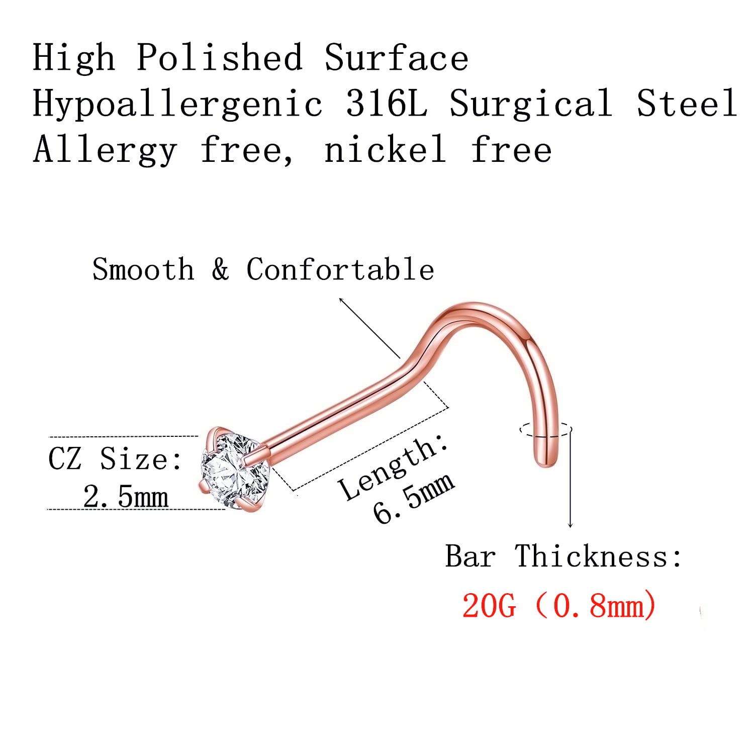 Quantity: 6pcs 2.5mm CZ screw nose rings. This screw nose ring size: Bar thickness: 20 gauge (0.8mm), Pin Length:6.5mm, Prong set cubic zirconia: 2.5mm, These stones a very bright and prong set by hand for accuracy.