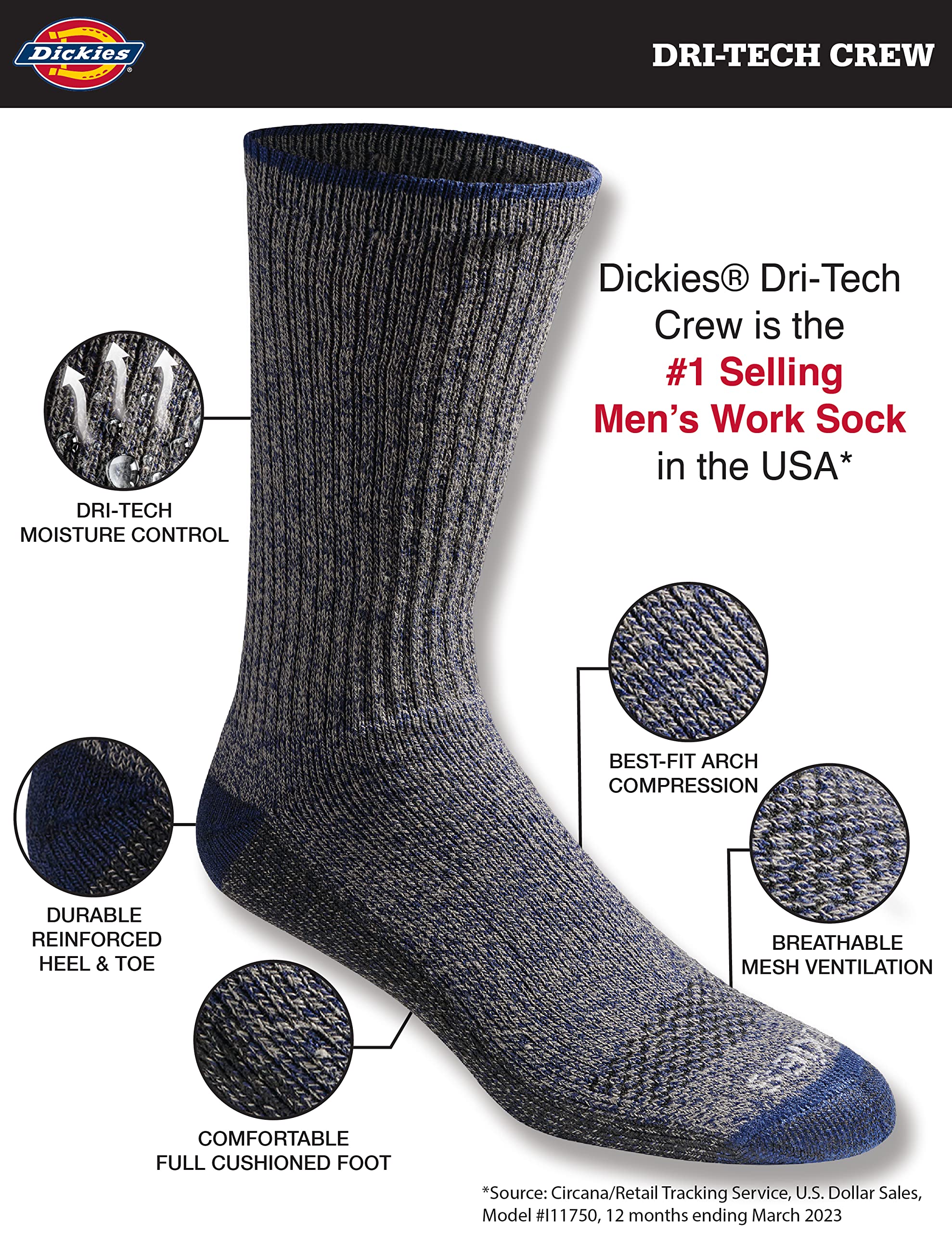 Description Dickies dri-tech comfort 6 Pairs crew with wicking, moisture management fibers keeps feet dry, ventilation channels engineered for air circulation and moisture control, arch compression hugs feet and keeps socks in place, while providing in-step support, Reciprocated heel and toe for superior fit and full cushion comfort