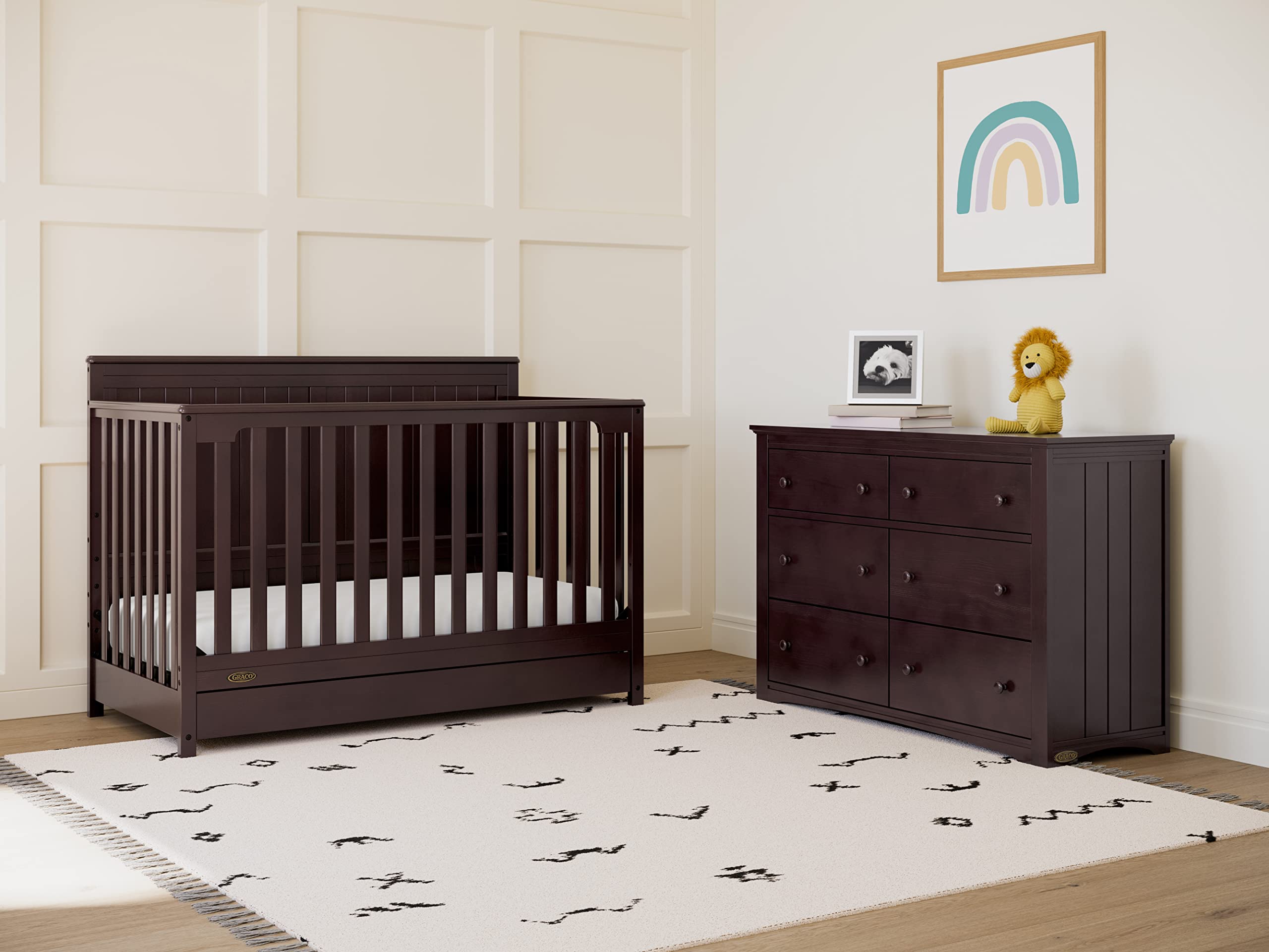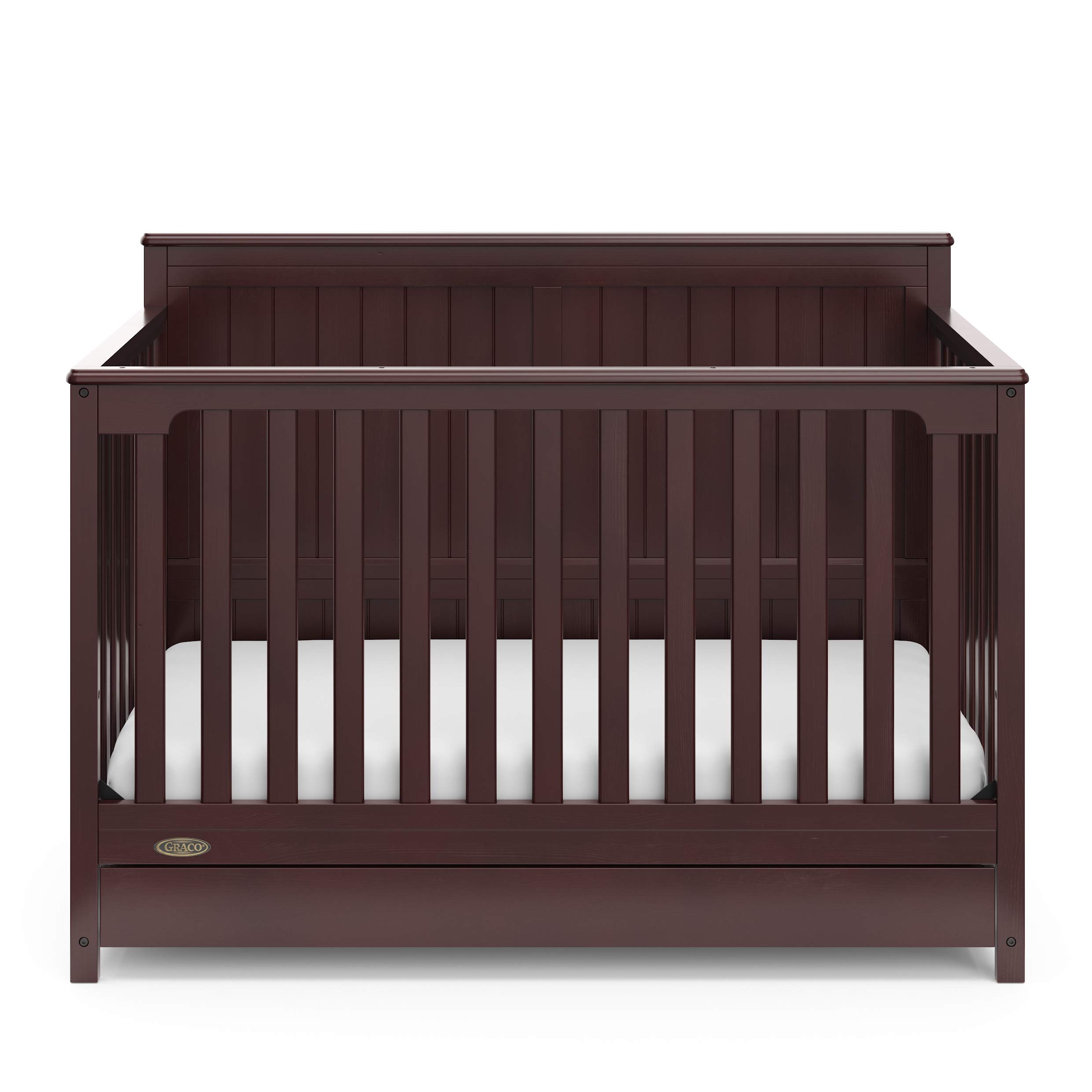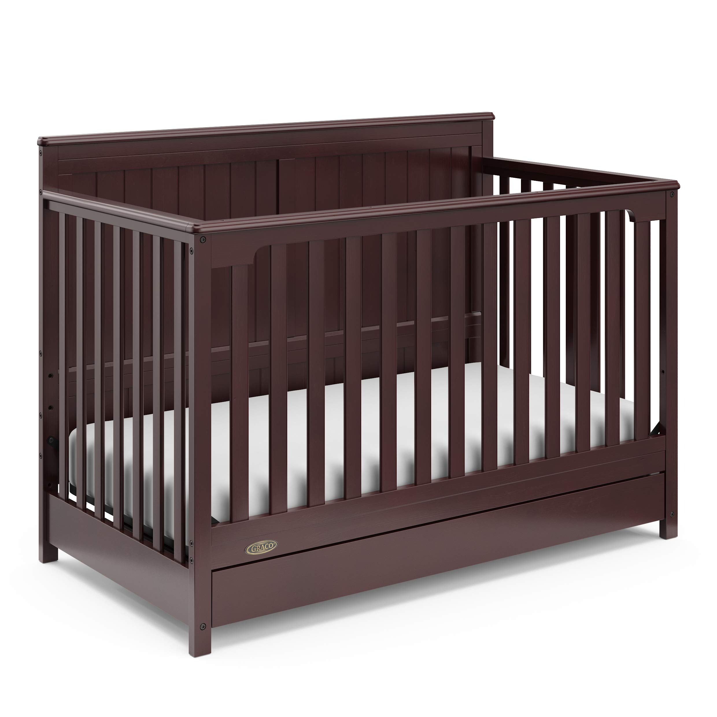 Bring your dream nursery to life with the Graco Hadley 5-in-1 Convertible Crib with Drawer. With its full-panel headboard, full-size under-crib storage drawer, and timeless design, the Hadley is the perfect addition to any nursery. The Hadley is crafted from pine wood, engineered wood, wood composites, and includes Euro drawer glides, and its applied finish has been tested to meet or exceed the applicable ASTM and CPSIA safety standards. Also, the Hadley is Baby Safety Alliance Verified β meaning it has been expert tested by third-party, accredited laboratories to meet or exceed all of the applicable category voluntary and mandatory safety standards. Designed to adapt to your growing baby, the Hadley is equipped with an adjustable mattress support base with 4 different height options, so the mattress support baseβs position can be lowered as your child grows [please note, this crib may only be used until your child can easily climb out or is taller than 35 inches (89 cm)]. To support your childβs journey from babyhood to toddlerhood and beyond, the Hadley can be converted from a crib to a toddler bed [compatible Graco Toddler Safety Guardrail (Slats) β 01350-30 Series sold separately)], daybed, and full-size bed with headboard and optional footboard (compatible full-size bed conversion kit sold separately). The Hadley is designed to accommodate any standard full-size crib & toddler mattress (mattress sold separately β we recommend any Graco crib mattress). Graco is the proud recipient of the Parent Tested Parent Approved (PTPA) Seal of Approval for nursery and childrenβs bedroom furniture, and the 2021-2023 Women's Choice Award for 9 out of 10 Recommended Baby & Kids Furniture. Backed by a 1-year limited manufacturerβs warranty. Assembly required. Mattress, guardrail kit, and full-size bed conversion kit each sold separately.