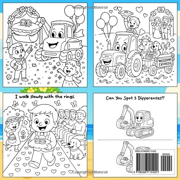 💎 He’s got the rings—and this book has his back. Color-along steps and epic vehicles show him how to shine down the aisle. This fun gift turns nerves into smiles and “I’ve got this!” pride.💎 Step-by-Step Ring Bearer Guide (while coloring!) – Ten clear “what to do” coloring pages—line up, walk down the aisle, carry the pillow or box, give the rings, smile for photos—each paired with a simple sentence to read and a scene to color. He practices the job as he colors, so the big moment feels easy. Vehicles + Weddings – Excavator ring bearer, a fire truck with a ribbon, bulldozers lifting the ring pillow, police cars protecting the ring bearer, monster trucks jumping at the wedding, tractors bringing farm animals to the wedding, diggers, limos, sports cars, and more—every page mixes wedding fun with the vehicles boys love. Personalization Pages & Keepsakes – Wedding details, a special message page from the bride and groom, a Ring Bearer Pledge to sign, an official certificate, and more—so he feels proud. Engaging Ring Bearer Activities – Mazes (“find the rings”), spot-the-difference wedding scenes, and finish-the-picture pages. Kid-Friendly Design – Bold outlines for easy coloring; single-sided pages to prevent bleed-through—for boys ages 2–10. 👉 Grab your copy now and give the ring bearer a gift that says, “You’ve got this!” Teach, entertain, and celebrate your ring bearer with trucks, vehicles, and tons of fun—perfect as a wedding gift, ring bearer proposal, or rehearsal surprise for boys who love vehicles and trucks.