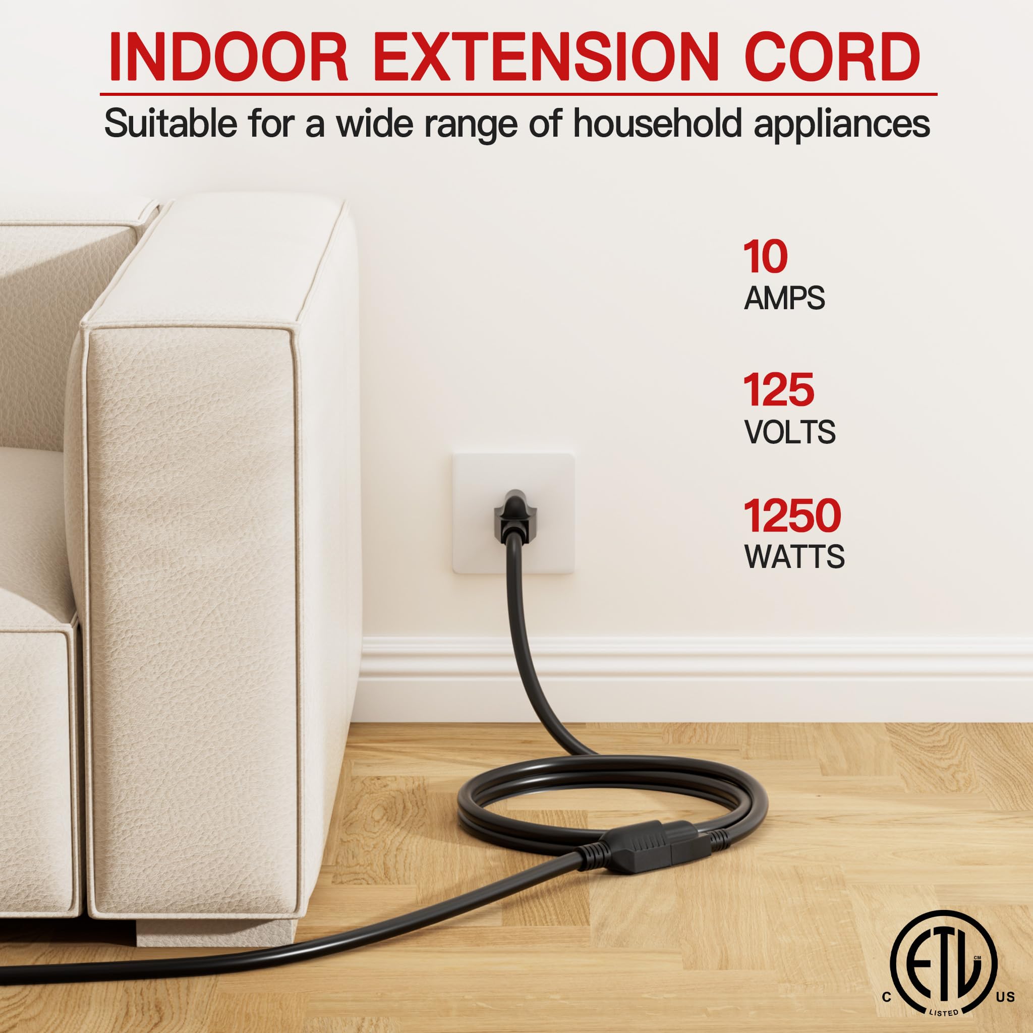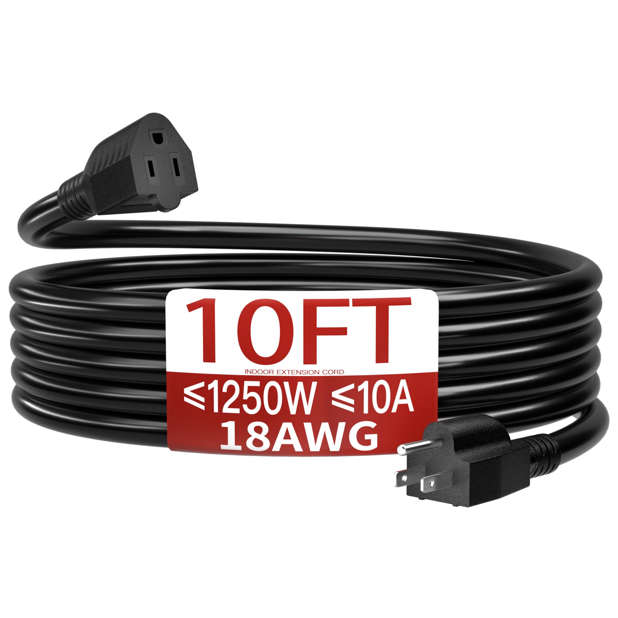 ETL Listed and Trusted: 10 ft extension cord rated 10 Amps, 1250 Watts and 125 VAC; male NEMA 5-15P and female NEMA 5-15R; it is ETL/cETL Listed; ensuring its compliance with strict safety standards; each black extension cord 10ft passes a 1500V high voltage test before leaving the factory to ensure safety; reliability and efficiency indoor extension cord are capable of meeting most electrical needs
