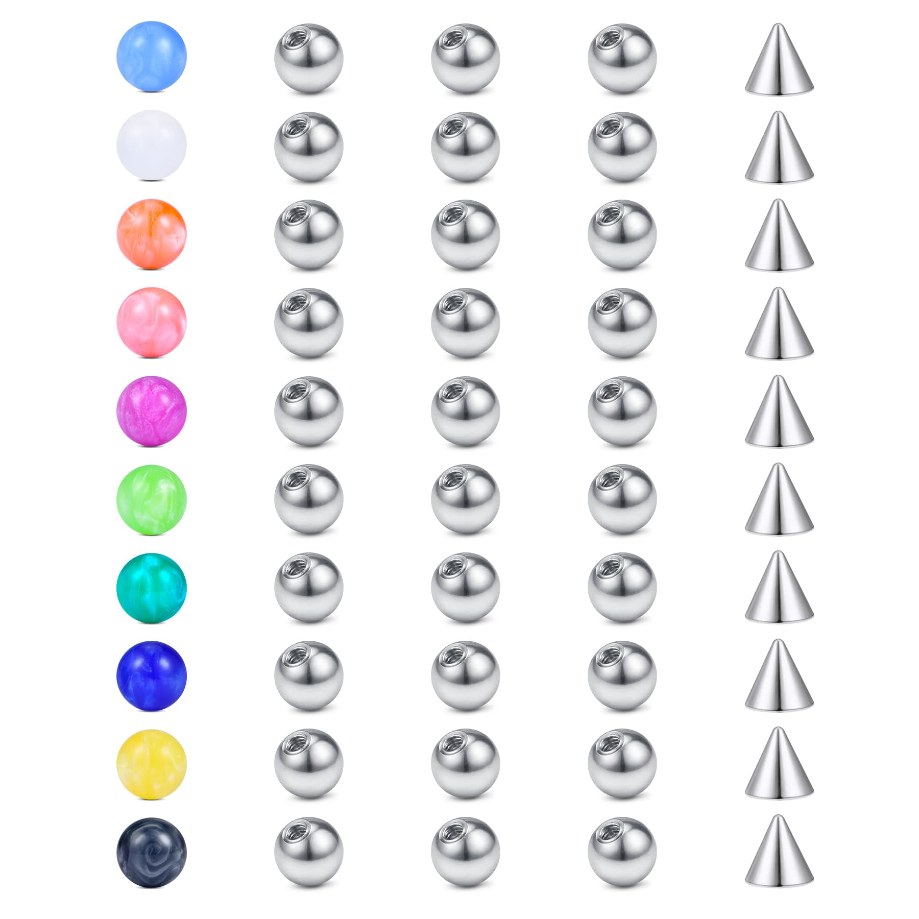Package including -- 40pcs Stainless Steel Externally Threaded Replacement Balls, 10pcs Colorful Plastic Piercing Balls