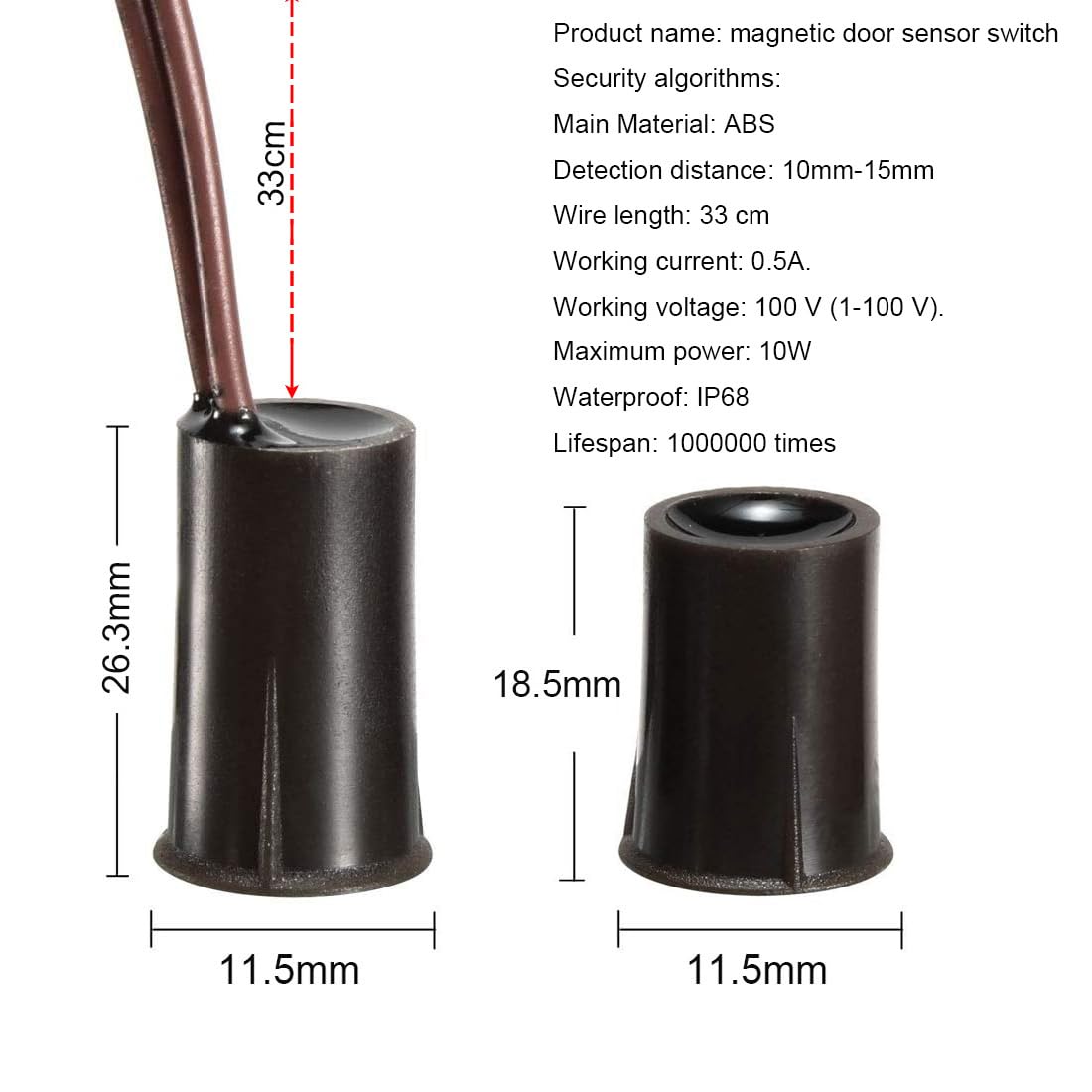 Product Package 6 x magnetic door detector. Recessed Security Window Door Contact Sensor with Alarm Wire, Magnetic Switch, Magnetic Door Sensor, Magnetic Switch Normally Closed Product name: magnetic door sensor switch Normally Closed: Close Magnet - Connect Circuit, Remote Magnet - Cut Circuit Product colour: Brown Main Material: ABS Detection distance: 10mm-15mm Wire length: 33 cm Working current: 0.5A. Working voltage: 100 V (1-100 V). Maximum power: 10W Lifespan: 1000000 times