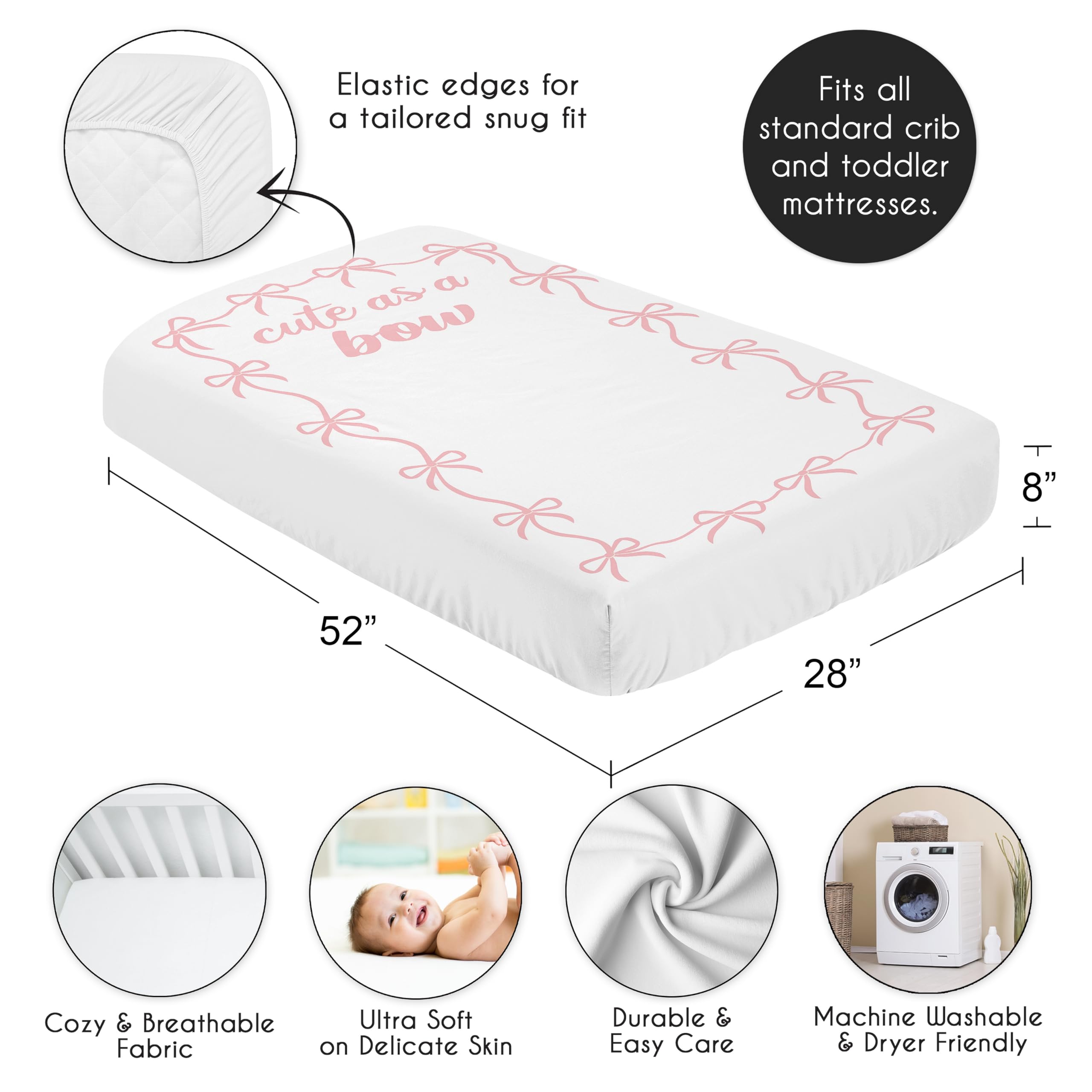 SNUG FIT: Includes (1) Fitted Crib Sheet 52in. x 28in. x 8in. Our newborn standard crib sheets fit snugly, with premium elastic sewn around the entire bottom edge for a secure fit on most standard sized cribs and toddler beds, to reduce shifting and bunching. This brushed microfiber crib sheet features an exclusive design of a rose, blush pink and white elegance, classic bow, princess, dancer, ballerina, ballet, bow print and is gentle on delicate skin to foster a soothing sleep environment.