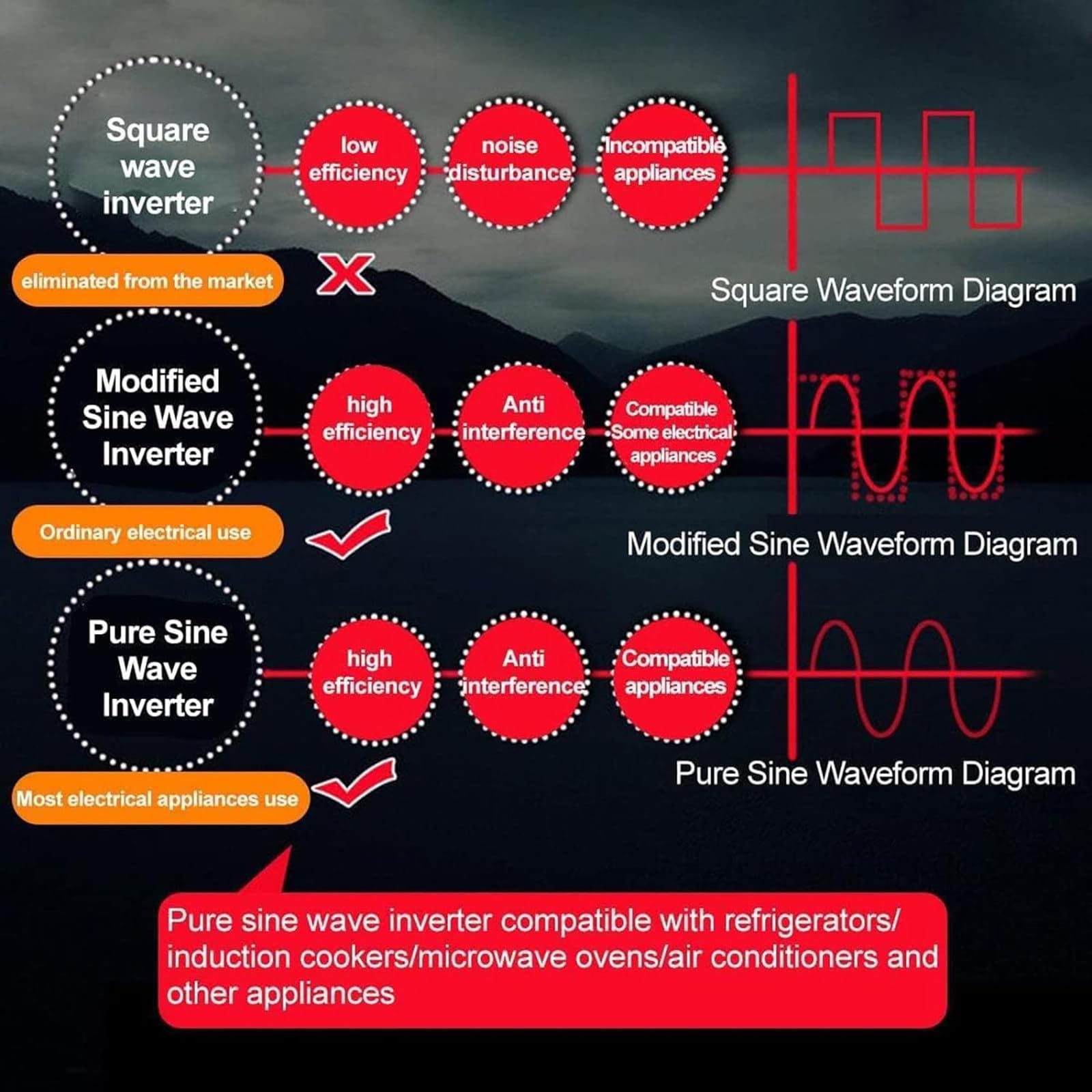 【Pure sine wave inverter】This is a true pure sine wave inverter,stable and efficient. It can convert 12V/24V/48V DC to 110V/220V AC. Can be used in emergency, camping,car,home,RV, solar.(Solar panels plus wind power generation power 100-20000W can be used)