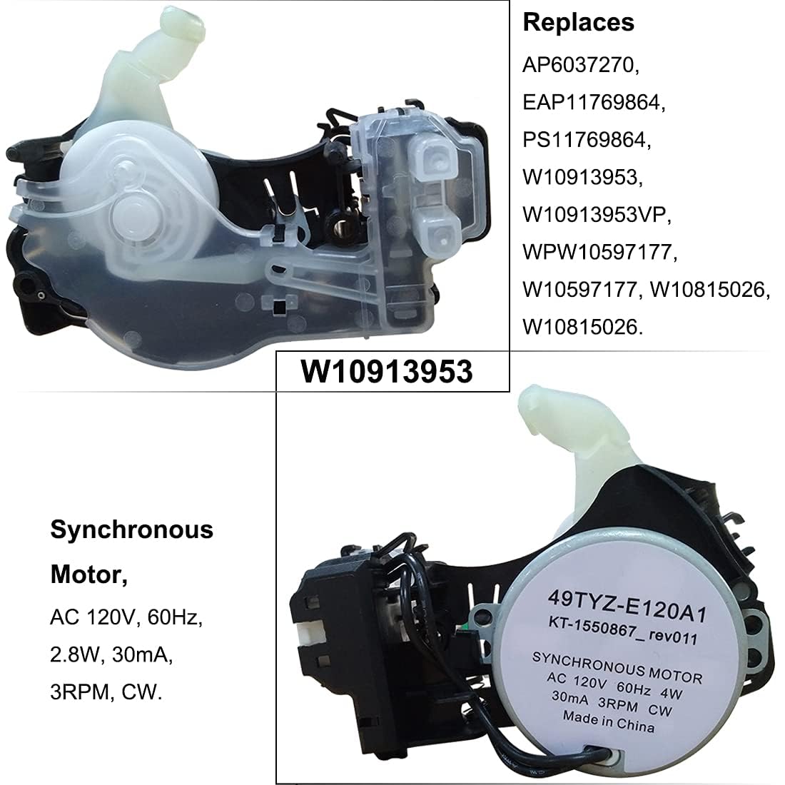 【Replace Part Numbers】The W11481722 W10913953 washer shift actuator is compatible with various brands such as Whirlpool, Kenmore, Maytag, Crosley, and Amana washers. It can replace 49TYZ-E120A1, PS11769864, W10815026, W10913953VP, AP6037270, W10815026, WPW10597177, and more, ensuring applicability for most washing machines.