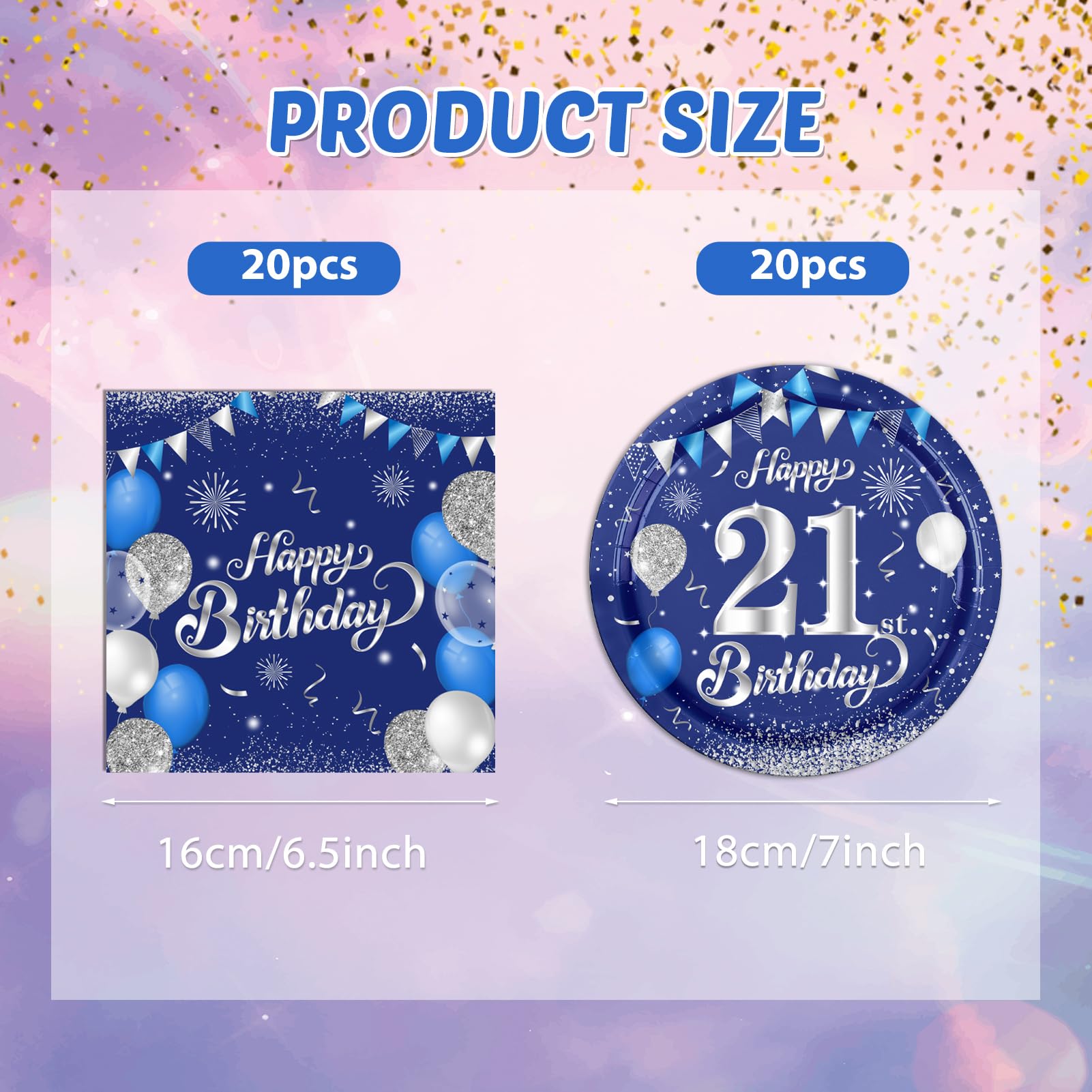 What Will You Get: Our 21th birthday decorations include 20 pieces blue party plates, 20 pieces blue party napkins .Enough quantity and good size is enough for your daily use and party changes.