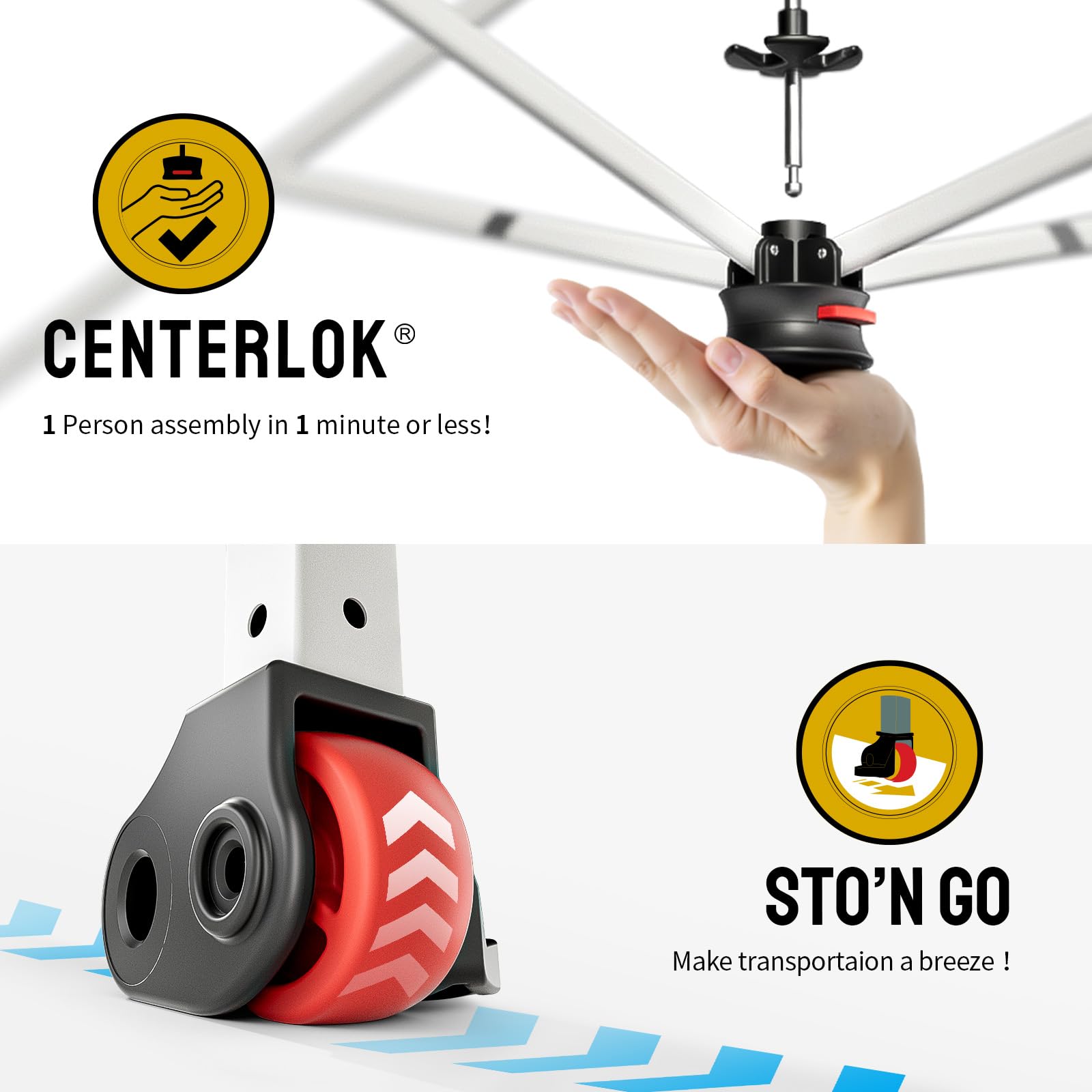 STO’ N GO SYSTEM - Our lift-free storage and transport system makes it easy to collapse the party tent, cover it with the bag, and roll it away. The 10x10 tents can be stored with the fabric attached, with a specialized pocket for 4 sandbags, 8 stakes, and 4 guy ropes. Integrated wheels in the feet allow easy movement even when the instant shelter tent is set up, by simply lifting the side without wheels.