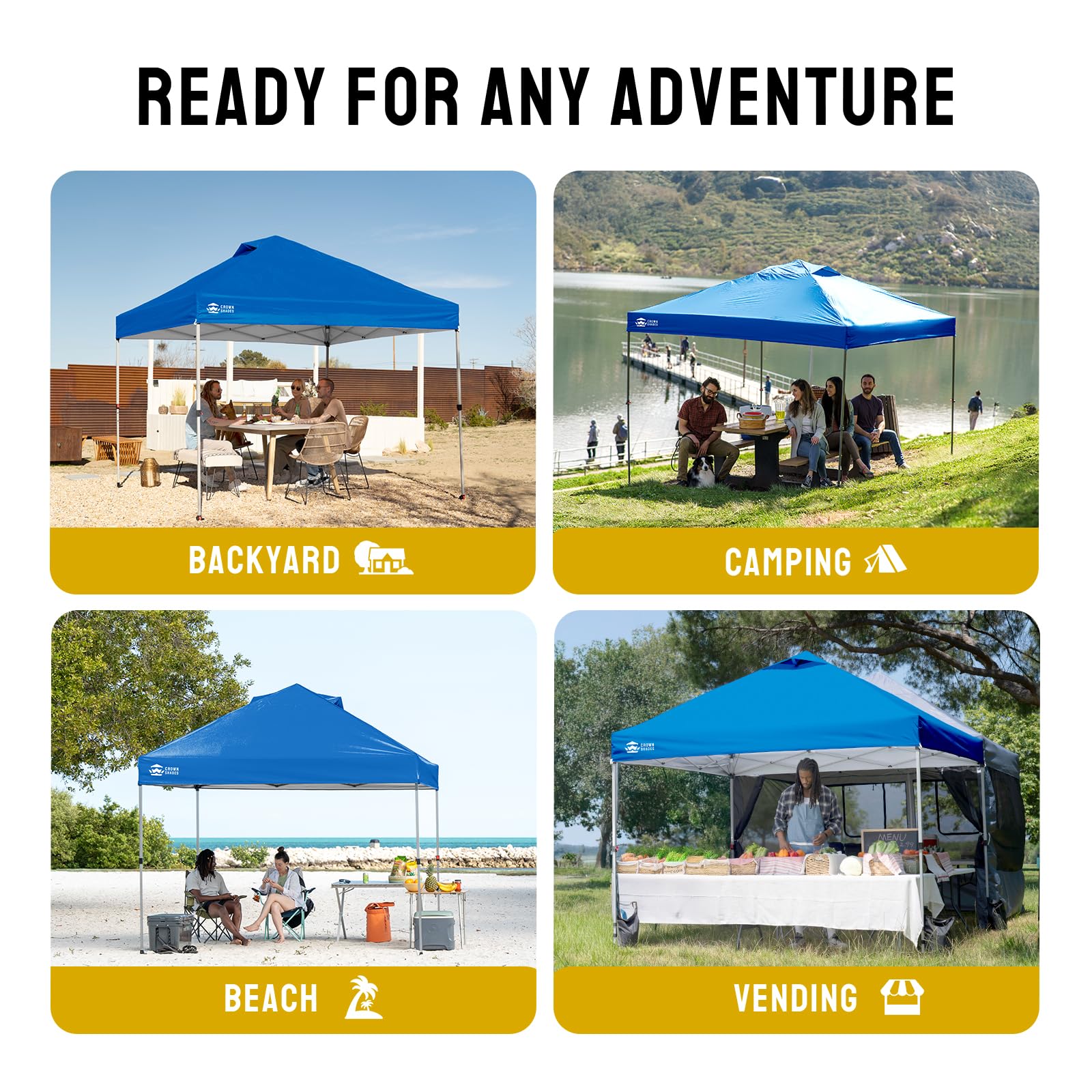 ONE BUTTON EASY SET UP - Our 10x10 pop up canopy tent features patented one push center lock tech. With just a single push, the central hub locks the poles in place. Designed for the next generation, this outdoor canopy for patio can be set up by two people in seconds without any tools. Three adjustable height settings with soft, pinch-free buttons ensure convenience and safety, making it perfect for camping, beach outings, craft fairs, tailgating, farmer markets, outdoor BBQs, and more