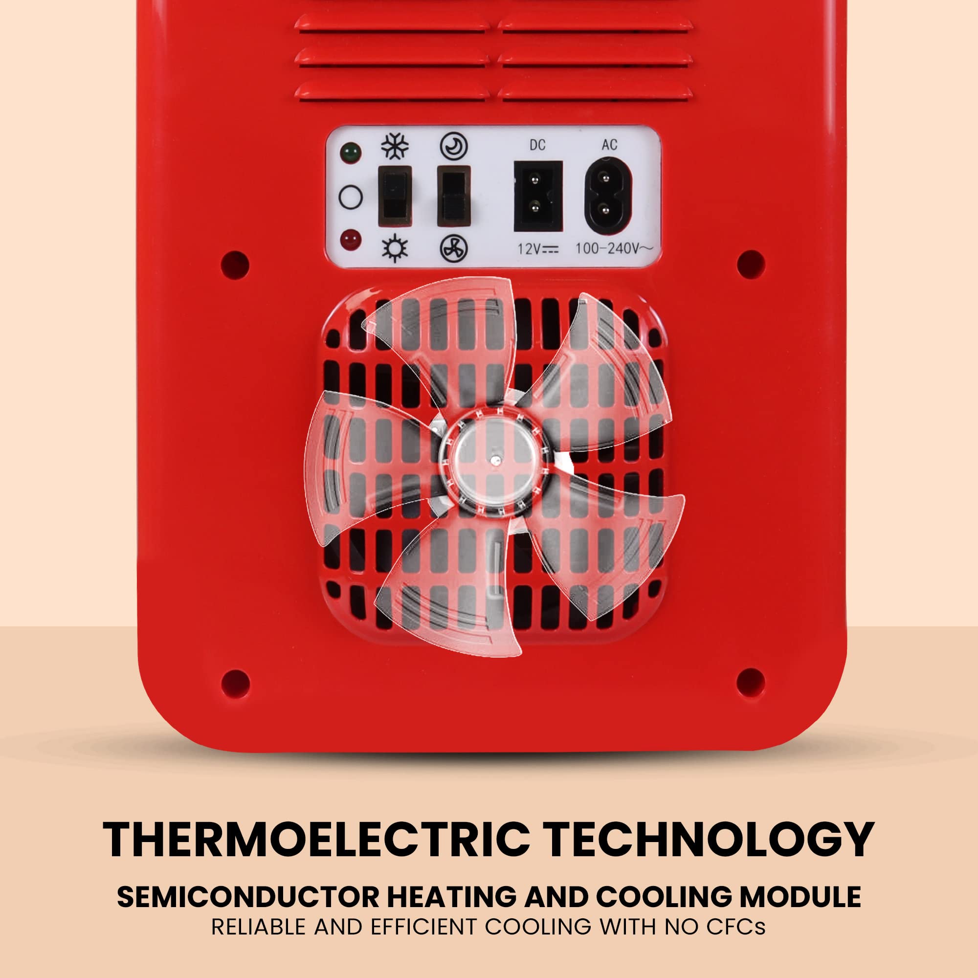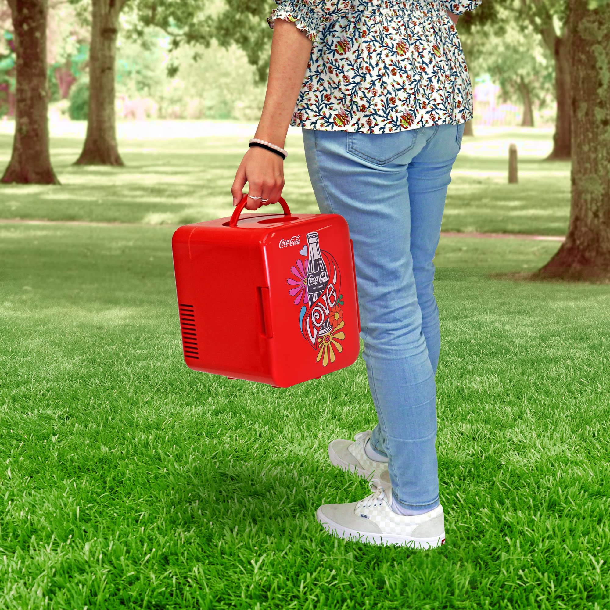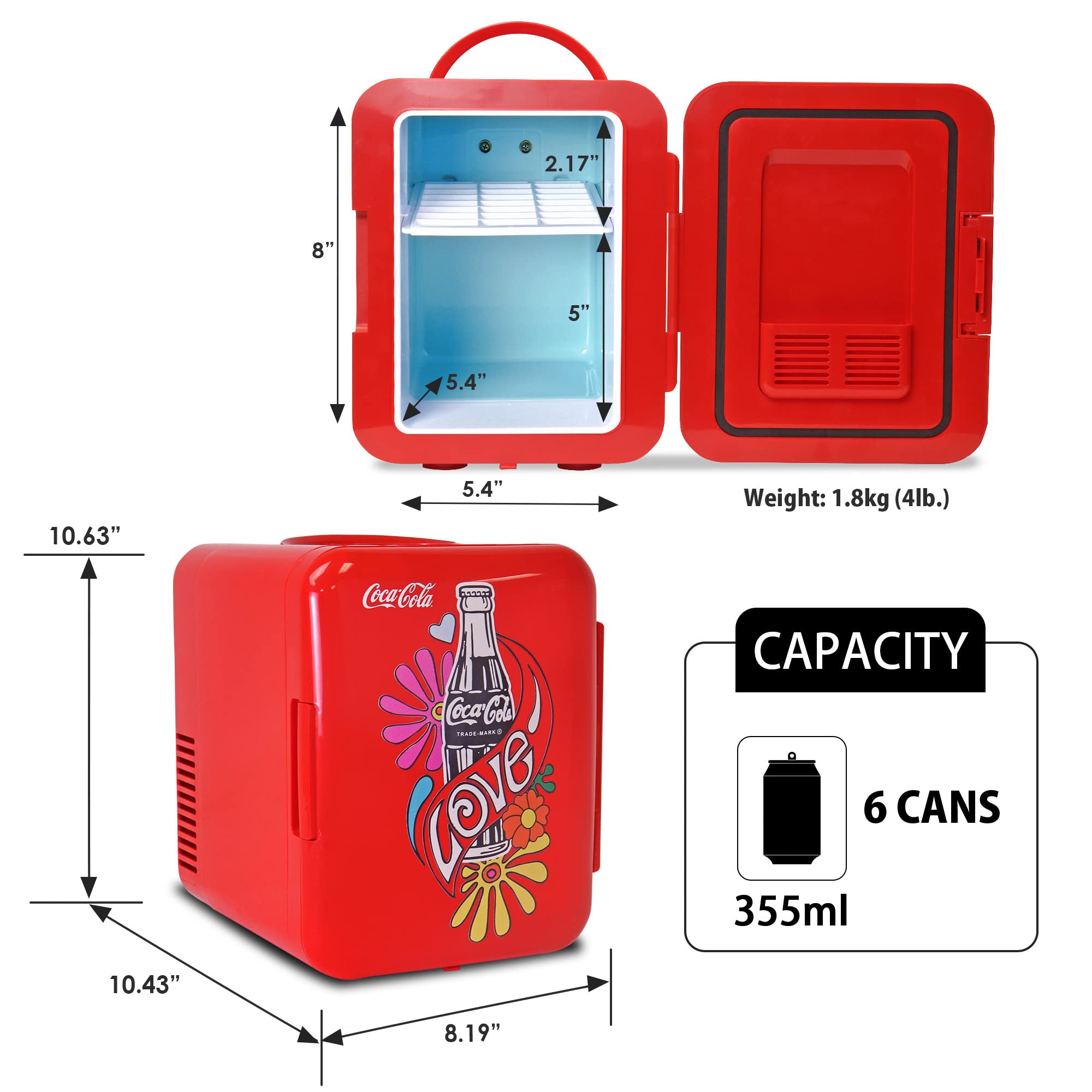 JOIN THE CELEBRATION This personal mini fridge with rounded retro refrigerator silhouette, official Coca-Cola graphics and groovy 1970s style artwork celebrates the 50th anniversary of the iconic “I’d like to buy the world a Coke!” ad SILENT NIGHTTIME MODE You asked, we listened! Switch to silent mode for nighttime operation with no fan noise CONVENIENT AND PORTABLE Holds six standard cans and fits easily on a desk or shelf plus is 12V DC/110V AC capable for use at home, dorm, or office or on the go in your truck, boat, trailer, or RV SAFE STORAGE Conveniently and safely store beverages, yogurt, fruit, juice, cheese, breastmilk, cosmetics, medication, baby bottles at home, work or travel