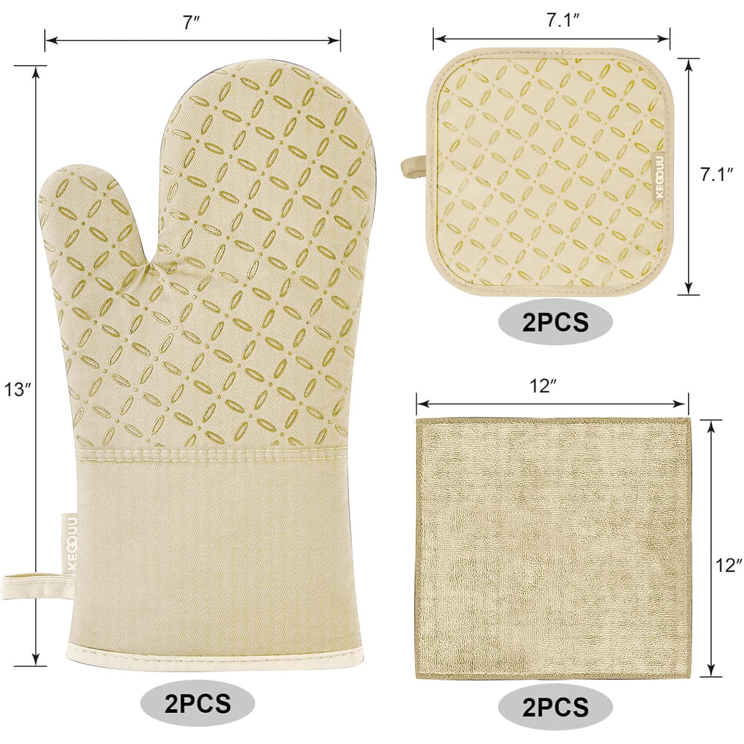 6 PIECE KITCHEN ACCESSORY SETS: Our oven mitts and pot holders set including 2pcs non-slip surface silicone kitchen oven gloves (7X13in), 2pcs pot holders (7X7in) and 2 kitchen towels (12x12in), fit for indoor cooking, baking,BBQ or outdoor grilling. Also the oven mitt set is a perfect ideal kitchen gift for women, men, baker, cooker