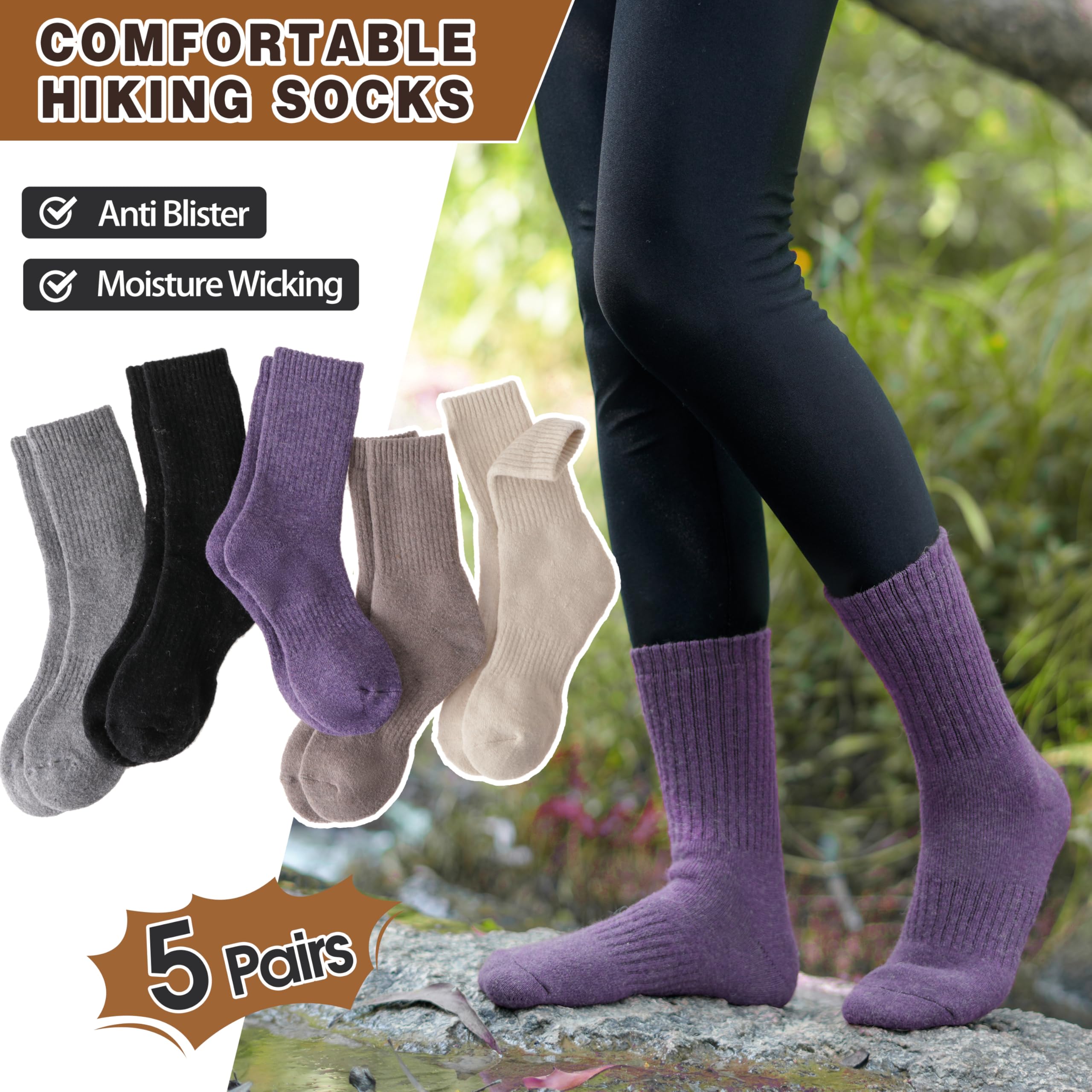 HIGH QUALITY : The womens wool socks for hiking are blend of premium natural wool and cotton. These winter hiking socks for women are heavy, soft, comfortable, breathable, warm, cozy and durable.