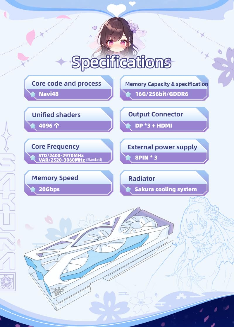 Core Code Name and Process: Navi48 / 4nm Unified Shaders: 4096 Core Frequency: STD/2400-2970MHz, VAR/2520-3060MHz (Default STD Standard Frequency) BIOS: Dual BIOS Switch (STD/VAR) Video Memory Frequency: 2518MHz Video Memory Speed: 20Gbps Video Memory Capacity and Specification: 16G/256bit/GDDR6 OS Features: Windows 10/11 64-bit Bus Interface: PCI-Express 5.0 x16 Output Interface: 3 * DisplayPort + HDMI External Power Supply: 3 * 8PIN Size: 330*136*68mm (Including the Baffle)