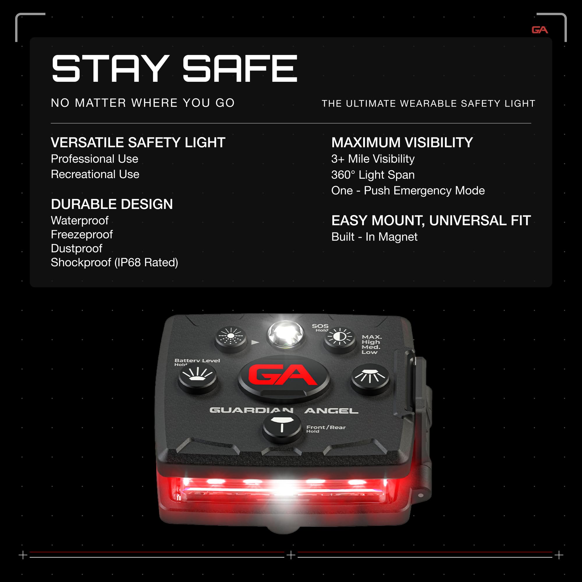 ๐ ๐ฎ๐ ๐ถ๐บ๐๐บ ๐ฉ๐ถ๐๐ถ๐ฏ๐ถ๐น๐ถ๐๐: With 14 high-output LEDs, the Guardian Angel Micro Series keeps you visible from up to 3+ miles, which exceeds USCG navigation light requirements. With 360ยฐ lighting, others can see you from all sides. Four brightness settings, multiple flash patterns, steady burn option and Emergency Mode, ensure others can see you when needed. This device features 6 green LEDs on the front, 6 red LEDs on the rear, a single white work light, and a white top light.