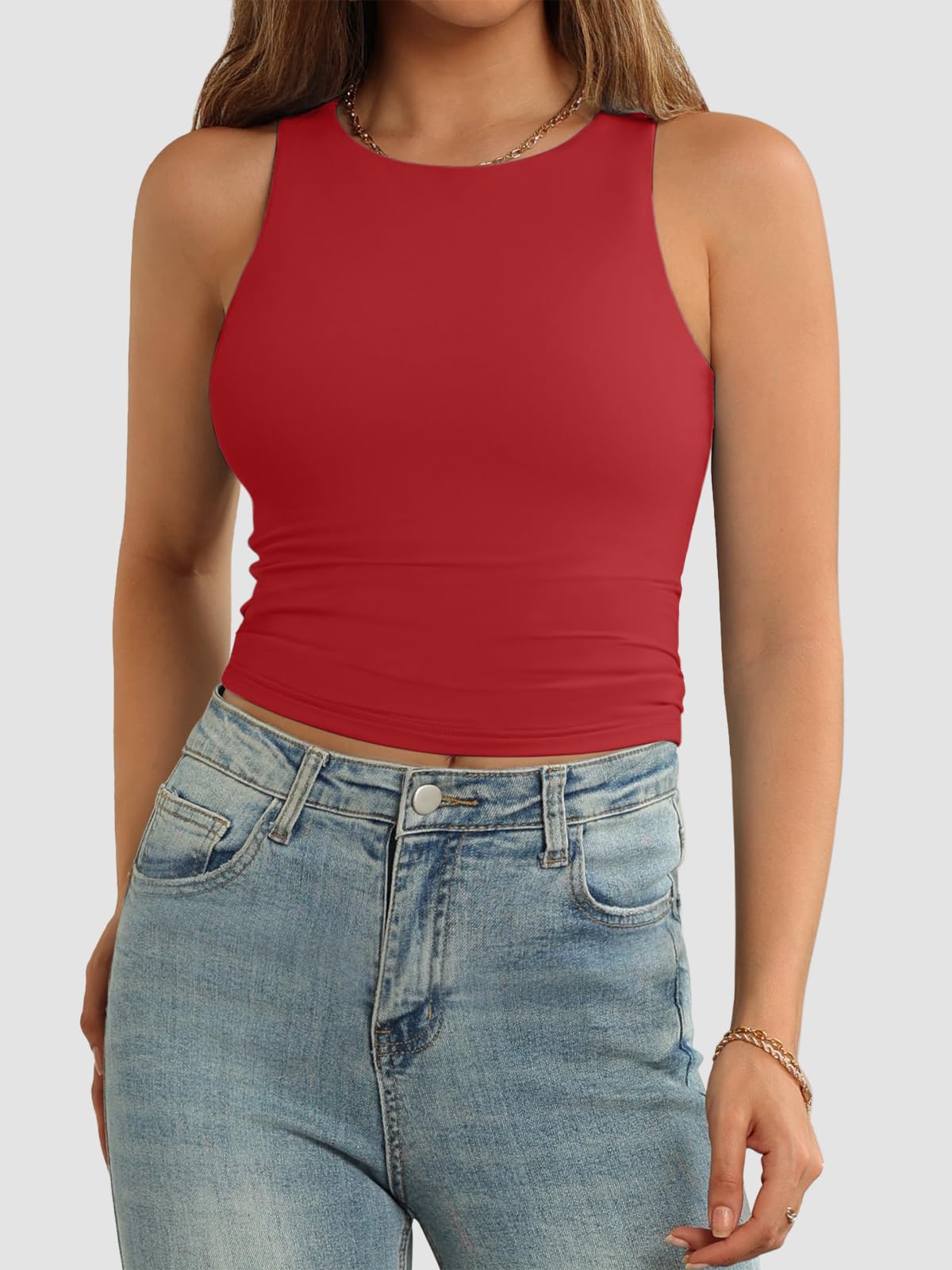 Fashion Design: Double layer of this crop top can wear without bra,and the material also good for work out sports,high neck design and crop top style,basic,fitted,casual style,crew neck ,sleeveless, slim fit