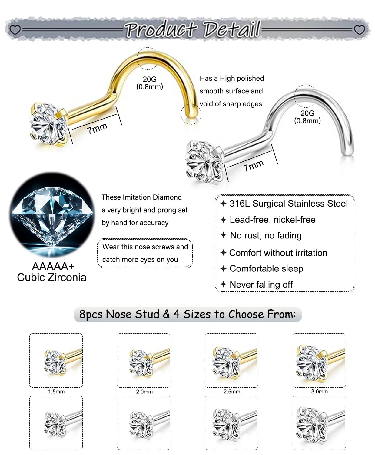 Multiple Size Sets: 8pcs nose studs in a set, All Gauge--20G(0.8mm); Pin Length: 7mm; Cubic Zirconia Size: 1.5/2/2.5/3mm. 20 gauge studs earrings perforation size suitable for most people