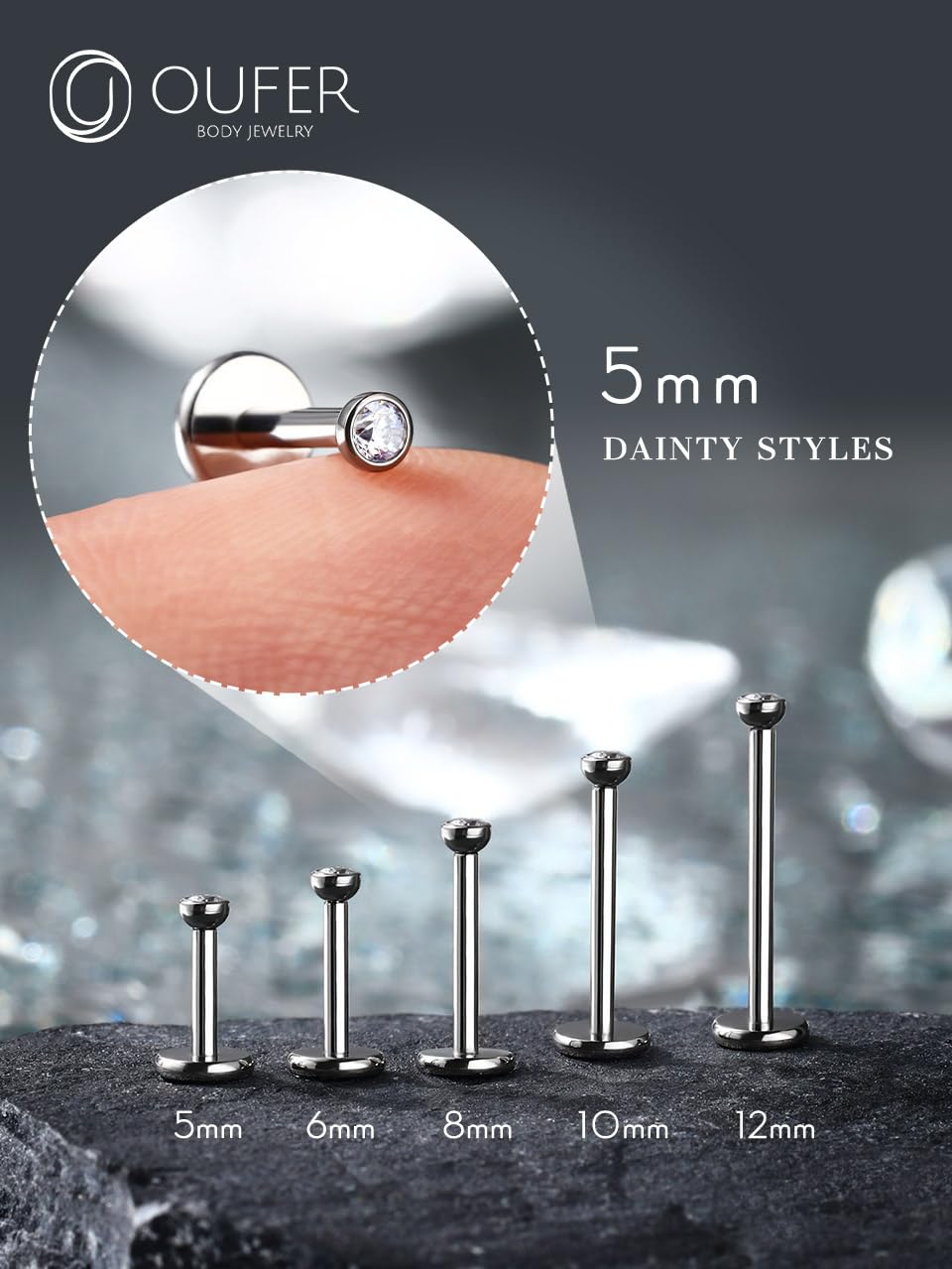 【Standard Flat Back Studs Size】: Gauge = 18g(1.0mm), bar length = 5mm(13/64''), diameter of CZ = 2mm. The flat back studs are normal and standard size for helix cartilage labret piercing jewelry.