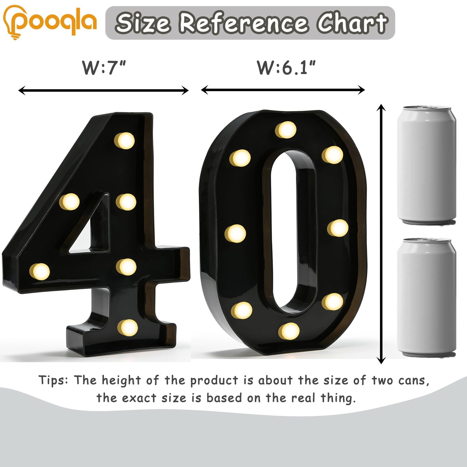 Appropriate Size: Our light up number is a reasonable size, which measure 8.86 inches in height and 1.77 inches in thickness. Detailed dimensions are shown in the pictures. Each marquee number sign requires 2 AA batteries, not included