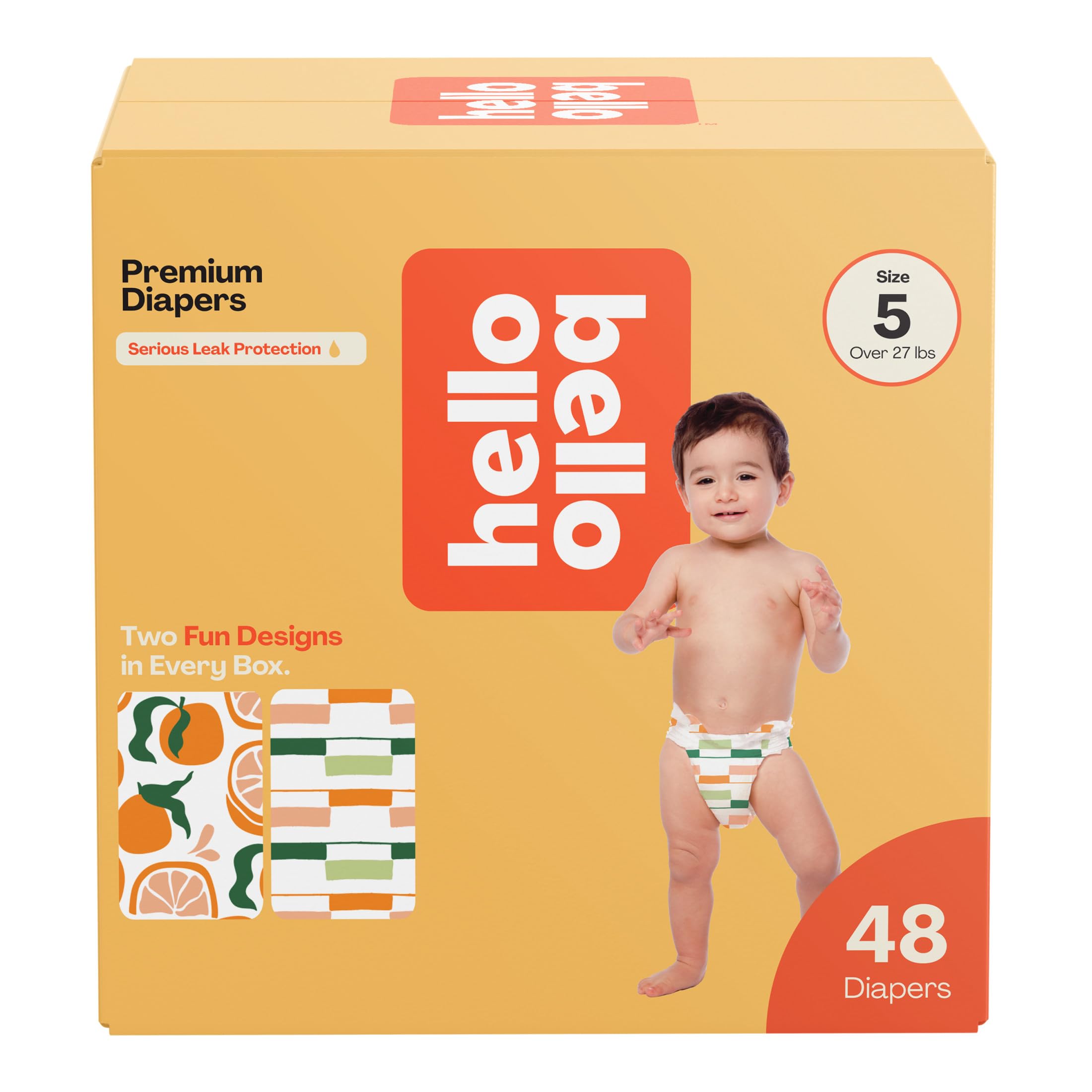 Hello Bello Premium Baby Diapers, Toddler Size 5, 48 Count - Hello Bello Premium Baby Diapers are designed by parents, so we know first-hand that preventing leaks and blowouts is a must. Been there, done that, don't want to deal with it. We also wanted to create a diaper with ingredients we could be proud of, that was soft on sensitive skin, and was made with just as much consideration for the planet we live on as the babies we love - all at an affordable price. So that's just what we did. Featuring premium, thick leg cuffs for serious leak protection and an advanced core that quickly wicks away moisture to help minimize conditions that lead to irritation. These diapers stay snug when soiled, reducing sag and keeping a secure and comfy fit. Includes (1) 48ct club box of diapers in main squeeze & zesties for the resties for infants and toddlers (Size 5).