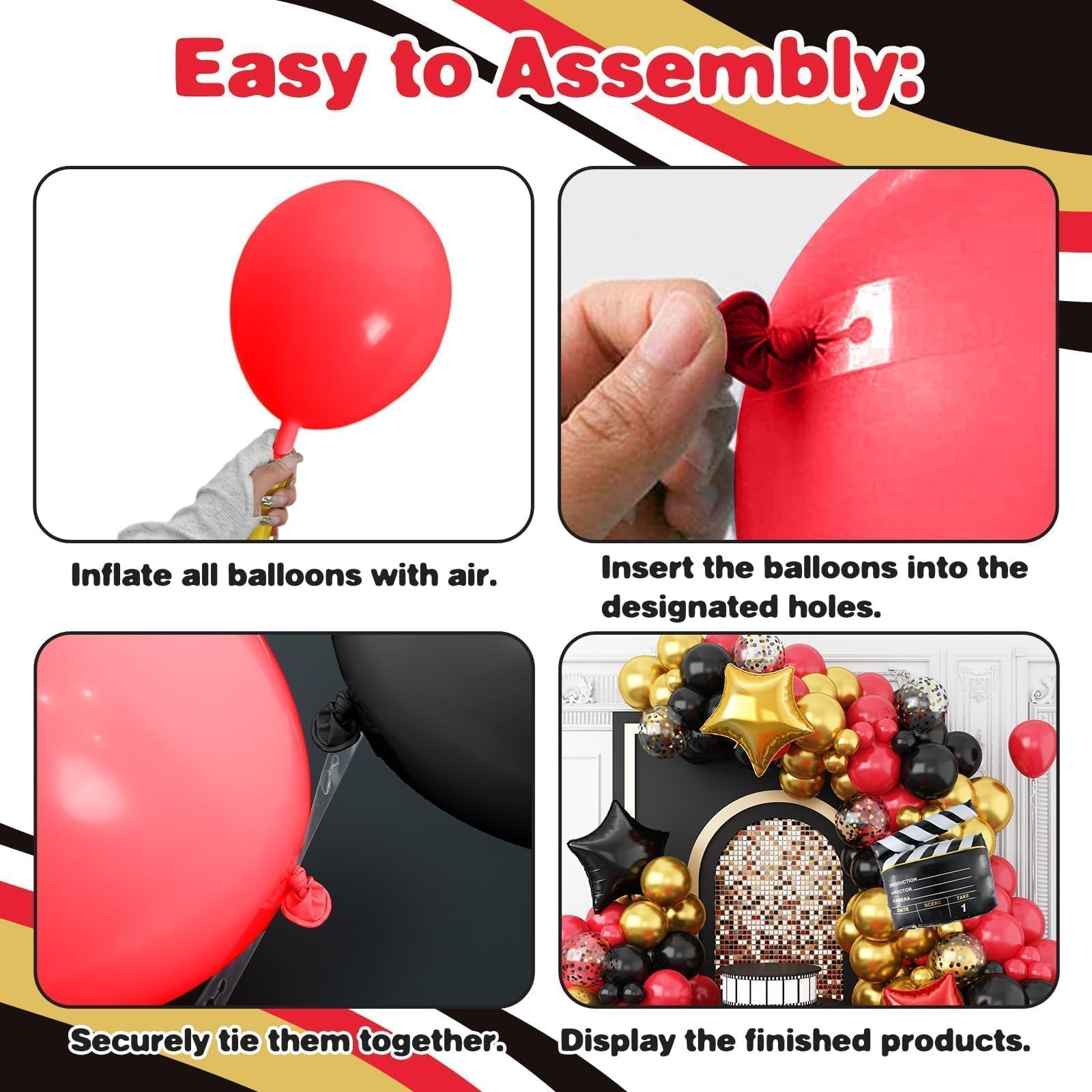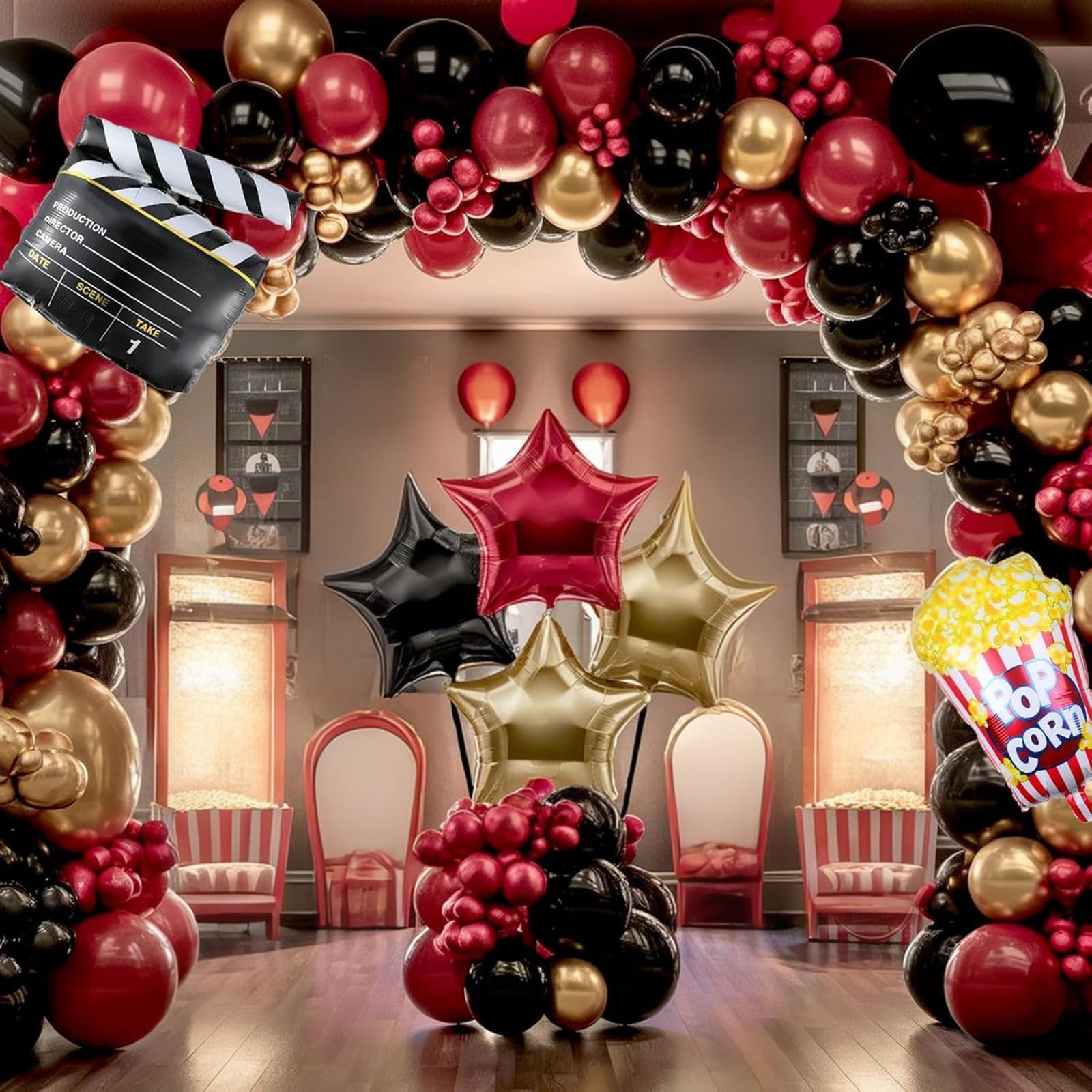 Balloons Arch Kit Set: Package includes - 45pcs 10" red, black, metallic gold balloons, 50pcs red, black, metallic gold balloons, 10pcs black and gold confetti balloons, 1pc red star foil balloon, 1pc gold star foil balloon, 1pc black star foil balloon, 1pc film clapboard foil balloon, 1pc pop corn foil balloon, 1pc red ribbon, 5pcs balloon tools(point dispensing, balloon arch strip). Enjoy your celebration with this movie night supplies.