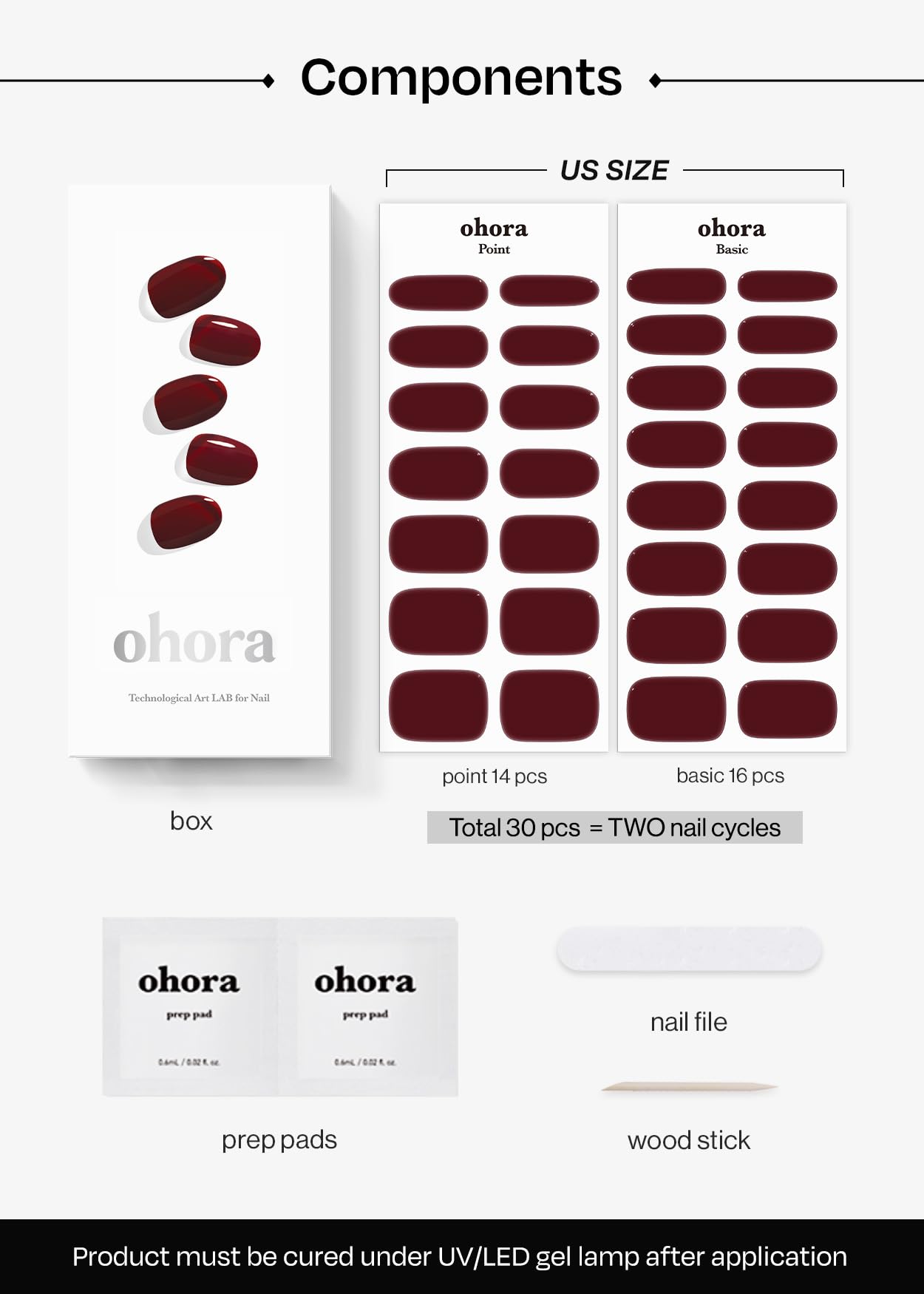 Complete Set of Nail Art Stickers - Each box includes 30 easy-to-use nail wraps (14 accent and 16 solid color) in 15 different sizes. It also comes with 2 prep pads, 1 nail file, and 1 wooden stick.