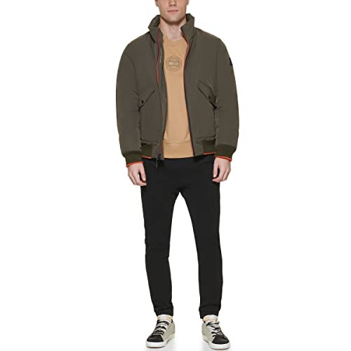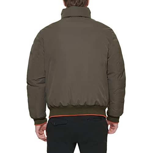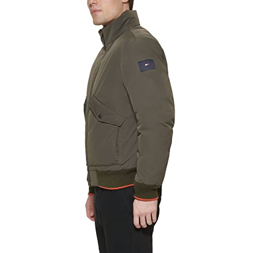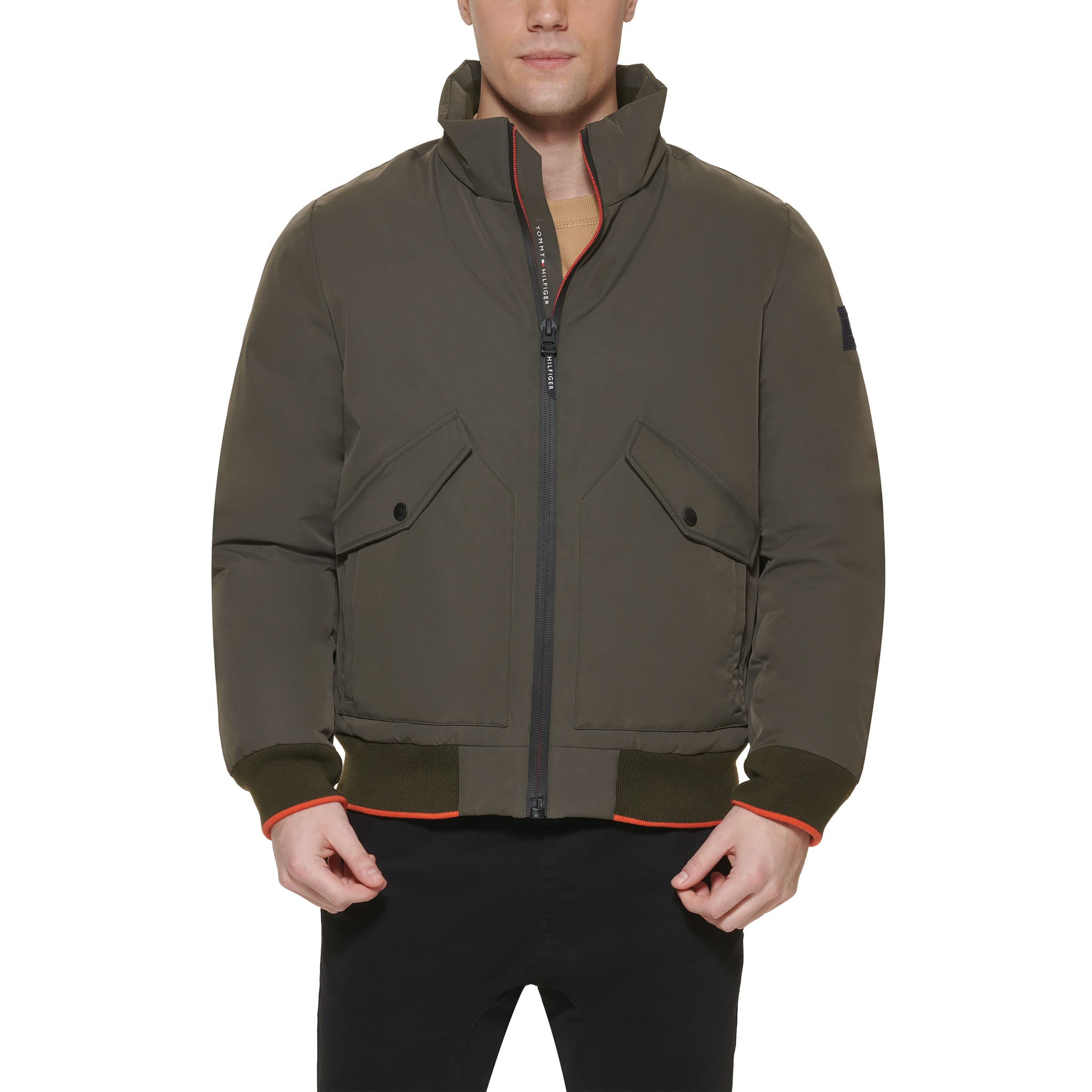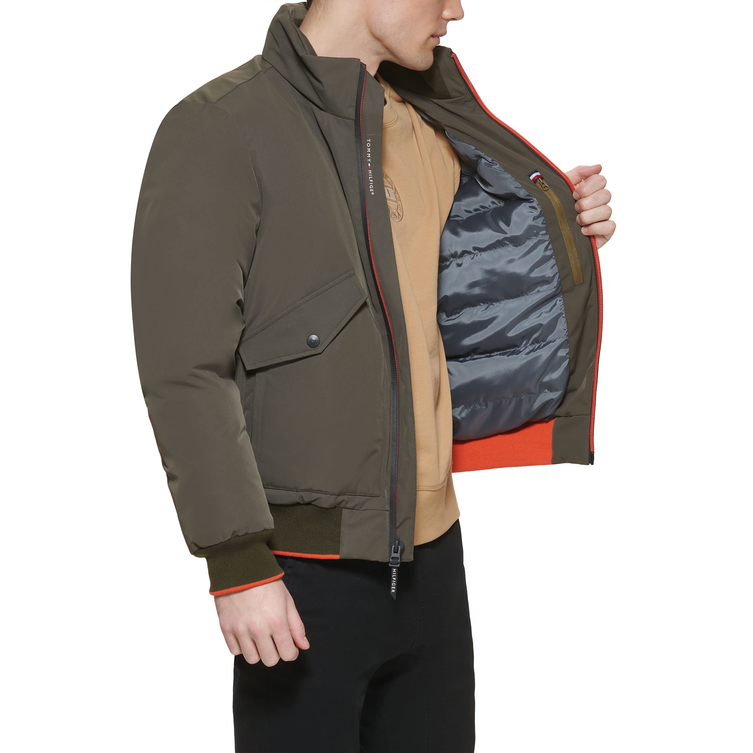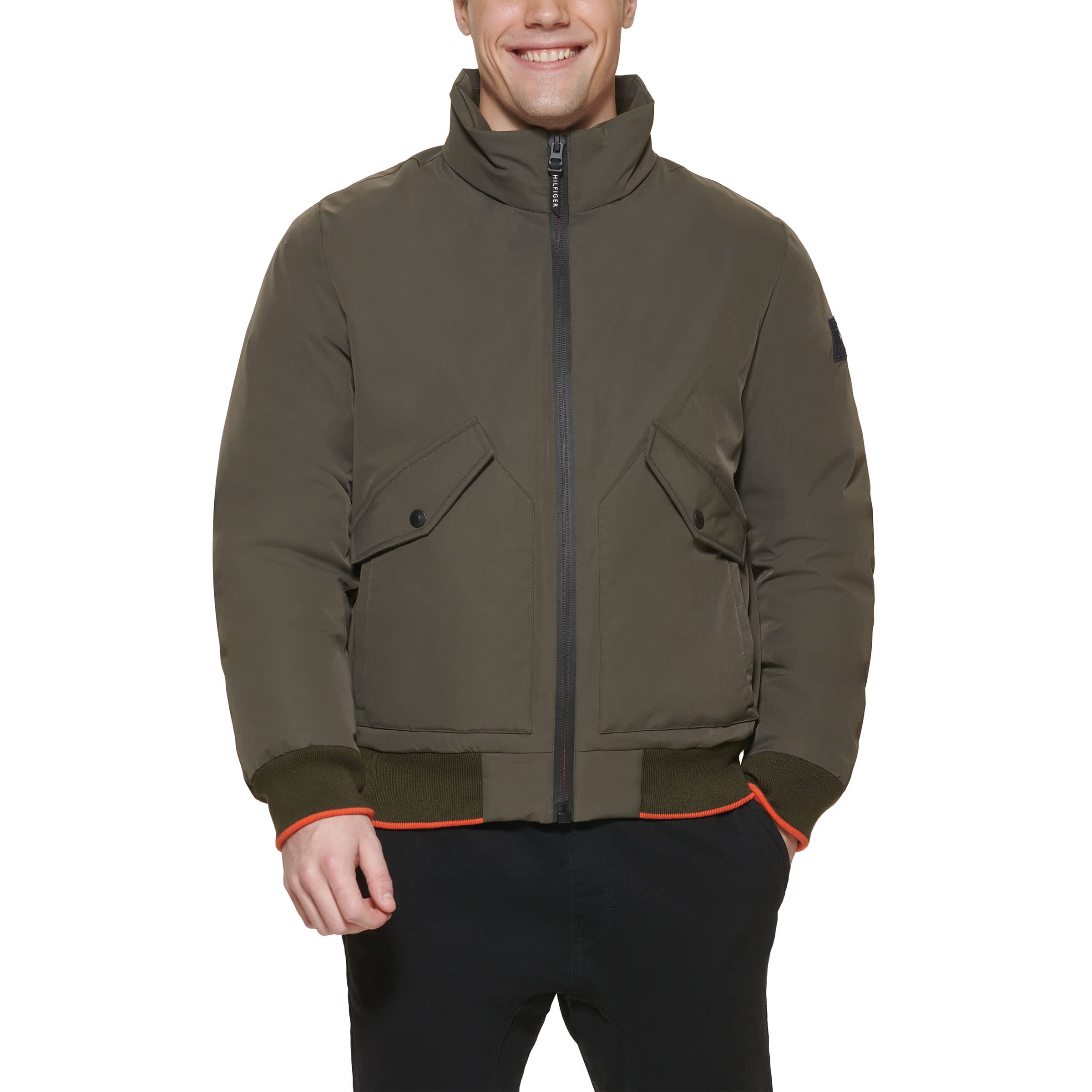 Description Stay sleek, stylish and warm with Tommy Hilfiger's Flex Stretch Performance Bomber. This outer jacket is designed with a stand collar, soft rib knit cuffs and hem, and quilted interior lining.