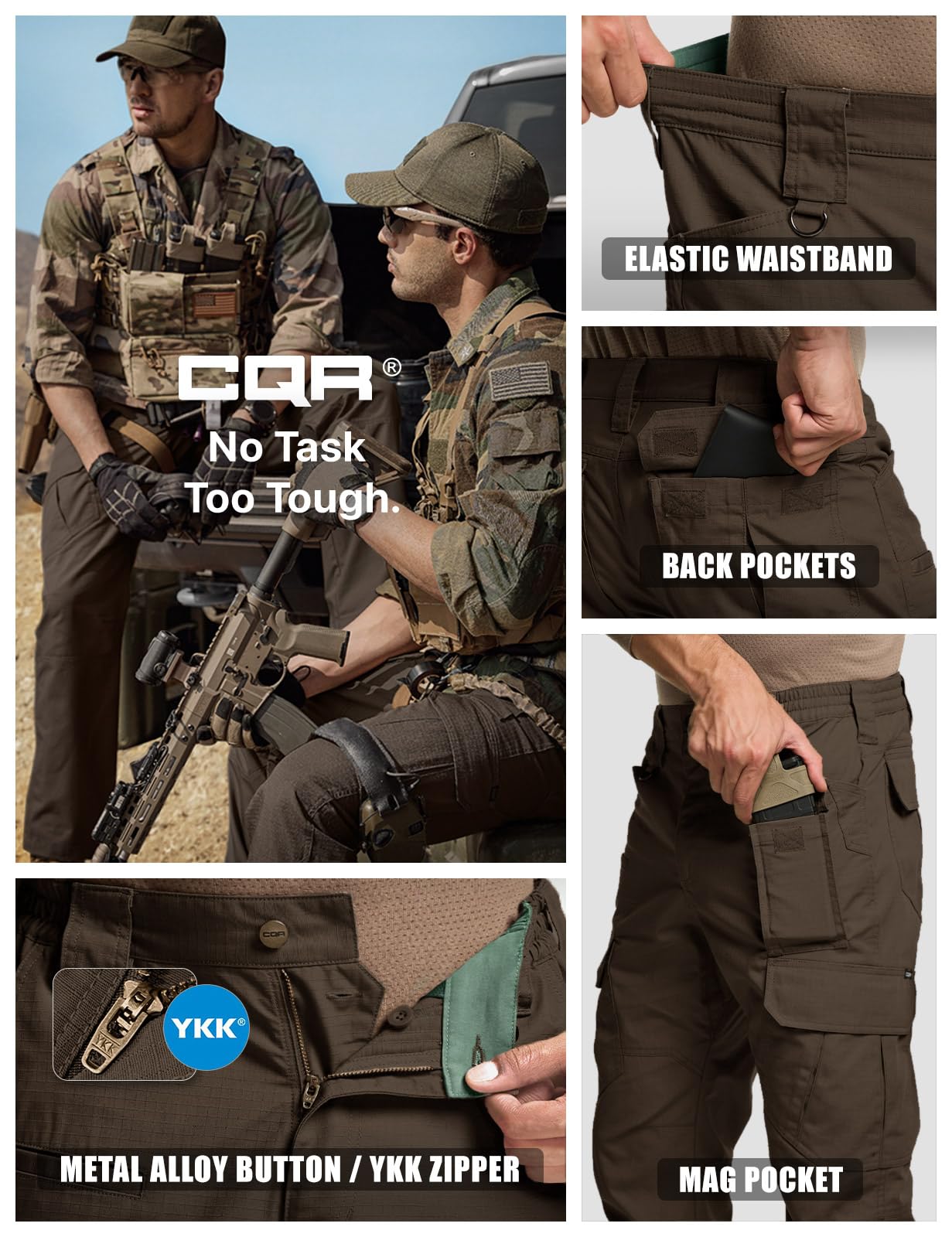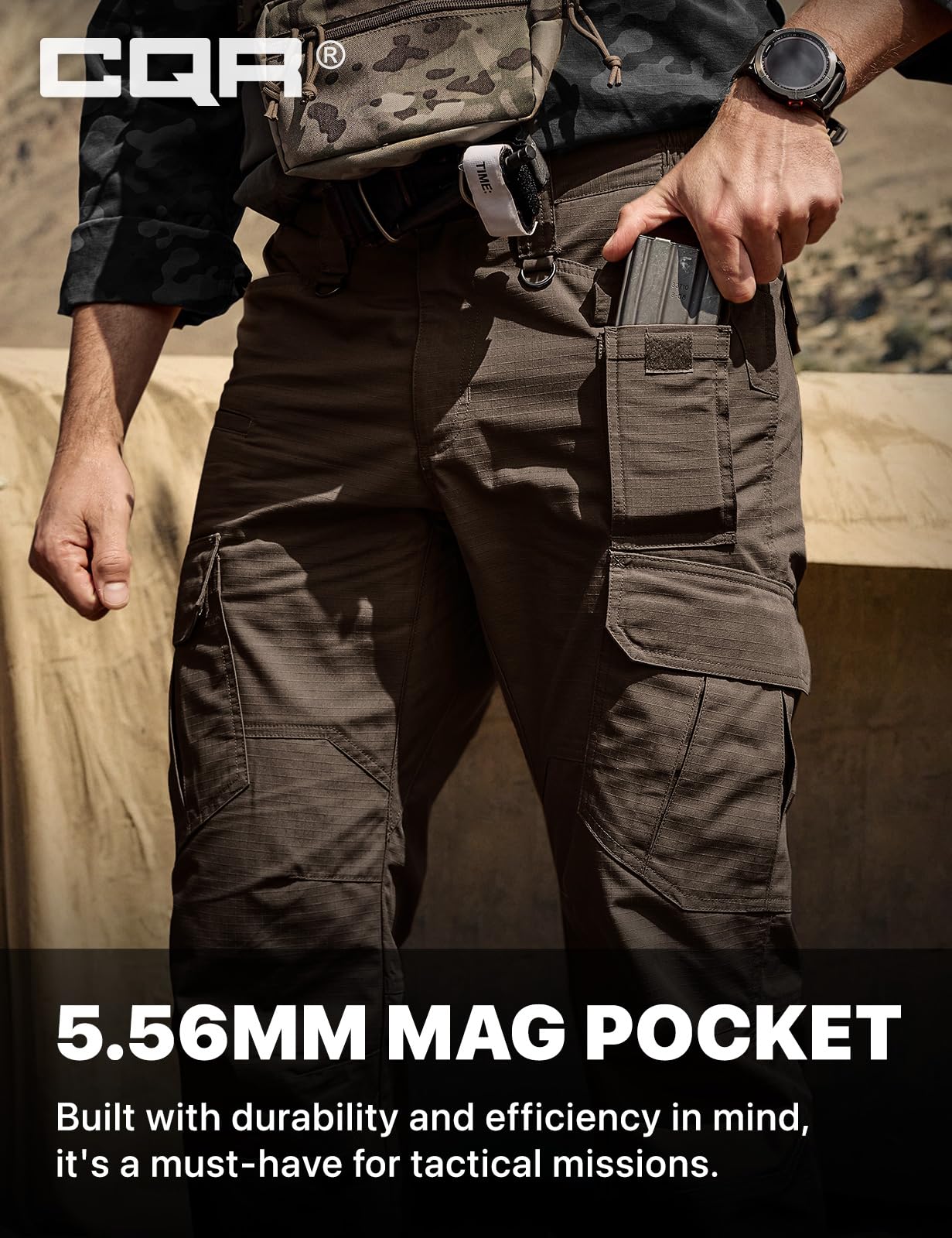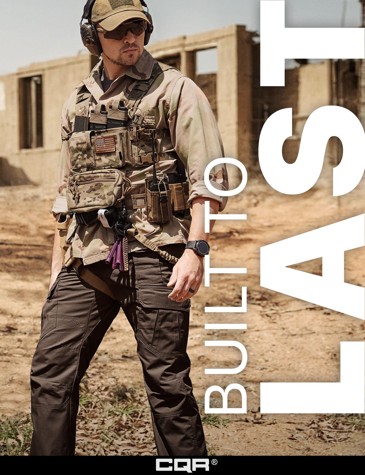 Description CQR Men's Tactical Pants Series Suitable for tactical, combat, military training, fishing, climbing, hiking, motorcycling, and outdoor activities *** Exclusive Tactical Belt is NOT included *** Materials Mix of Polyester & Cotton (Ripstop Fabric) is breathable, wrinkle-free, comfortable Duratex Ripstop Fabric Ripstop fabric has excellent durability and has water-resistant and stain-resistant Elastic Waistband Side waistband is to make a secure fit and support the active movement Tactical Layout Multi-purpose cargo pockets allow carrying various tools and equipment without having to hold them in your hands Button and Zipper Closure High-strength and high-density the Metal Alloy Button and Zipper along with a durable mounted stopper