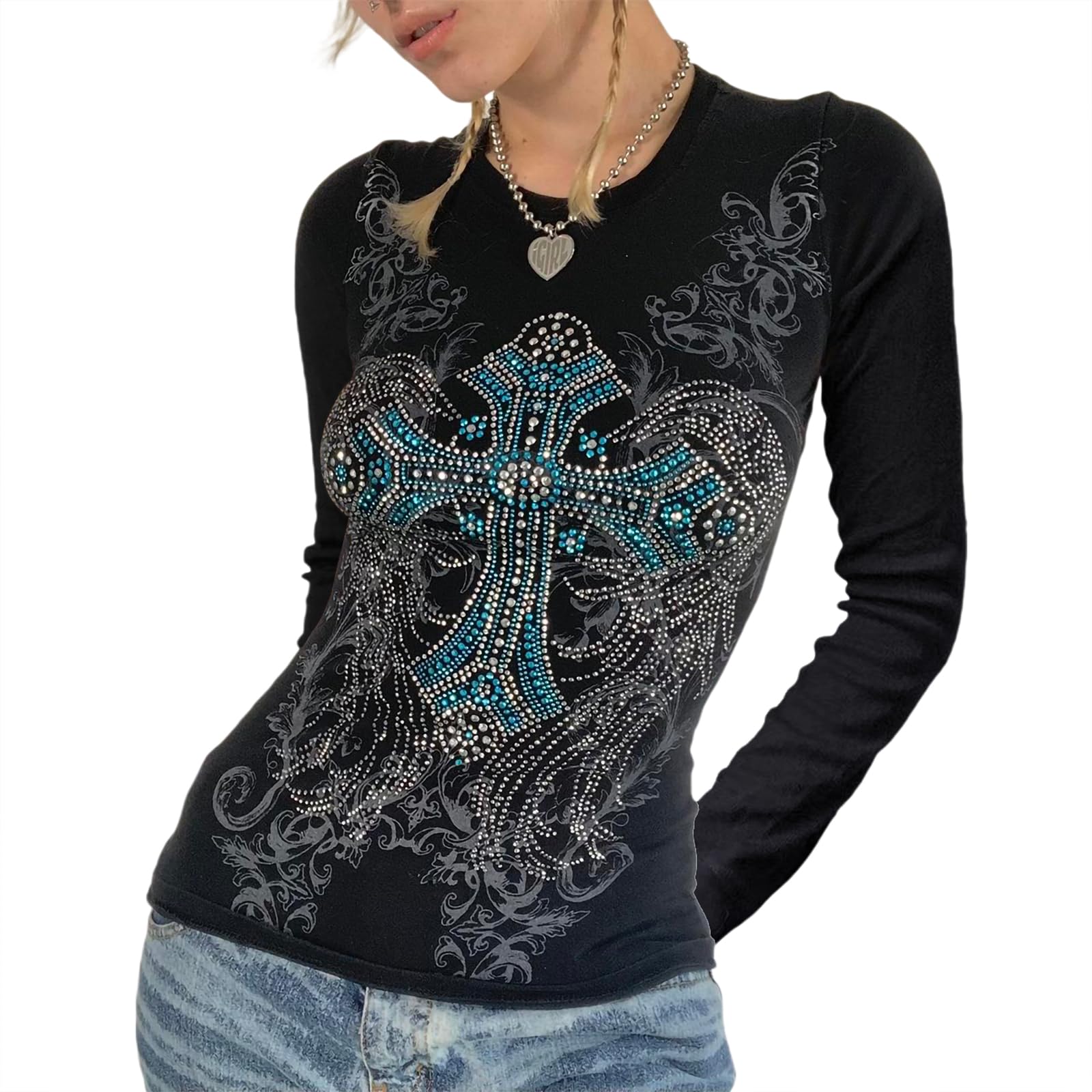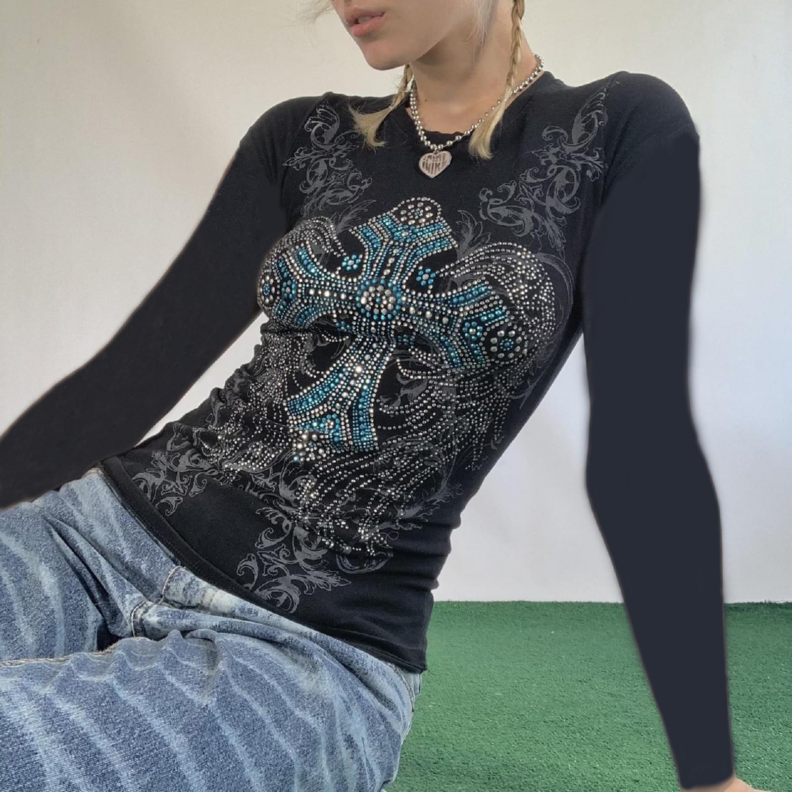 Features: Women y2k tops fairy grunge shirts, long sleeve, crew neck/ v neck, rhinestone deco, vintage graphic print, butterfly print, cropped or normal length, slim fit blouse tops, tight shirts for women, ribbed y2k tops, y2k goth aesthetic clothing, trendy teens 90s egirl Harajuku gothic clothes fall streetwear.