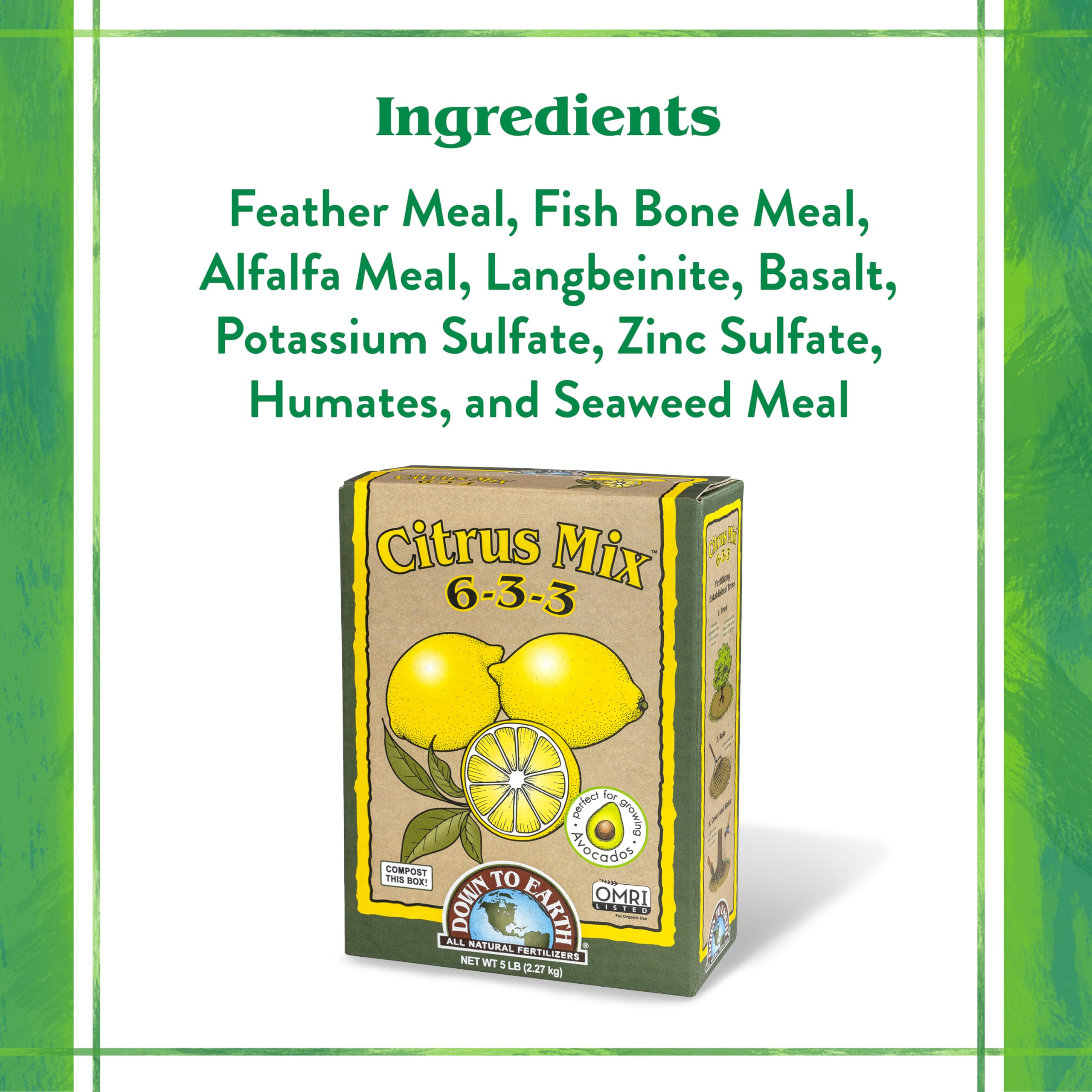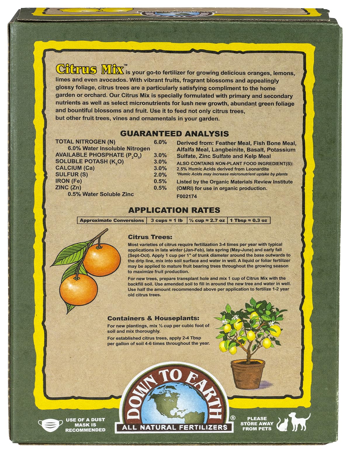 Down To Earth Citrus Mix is a five pound box of all natural fertilizer with 6-3-3 formula and is listed by the Organic Materials Review Institute (OMRI) for use in organic production