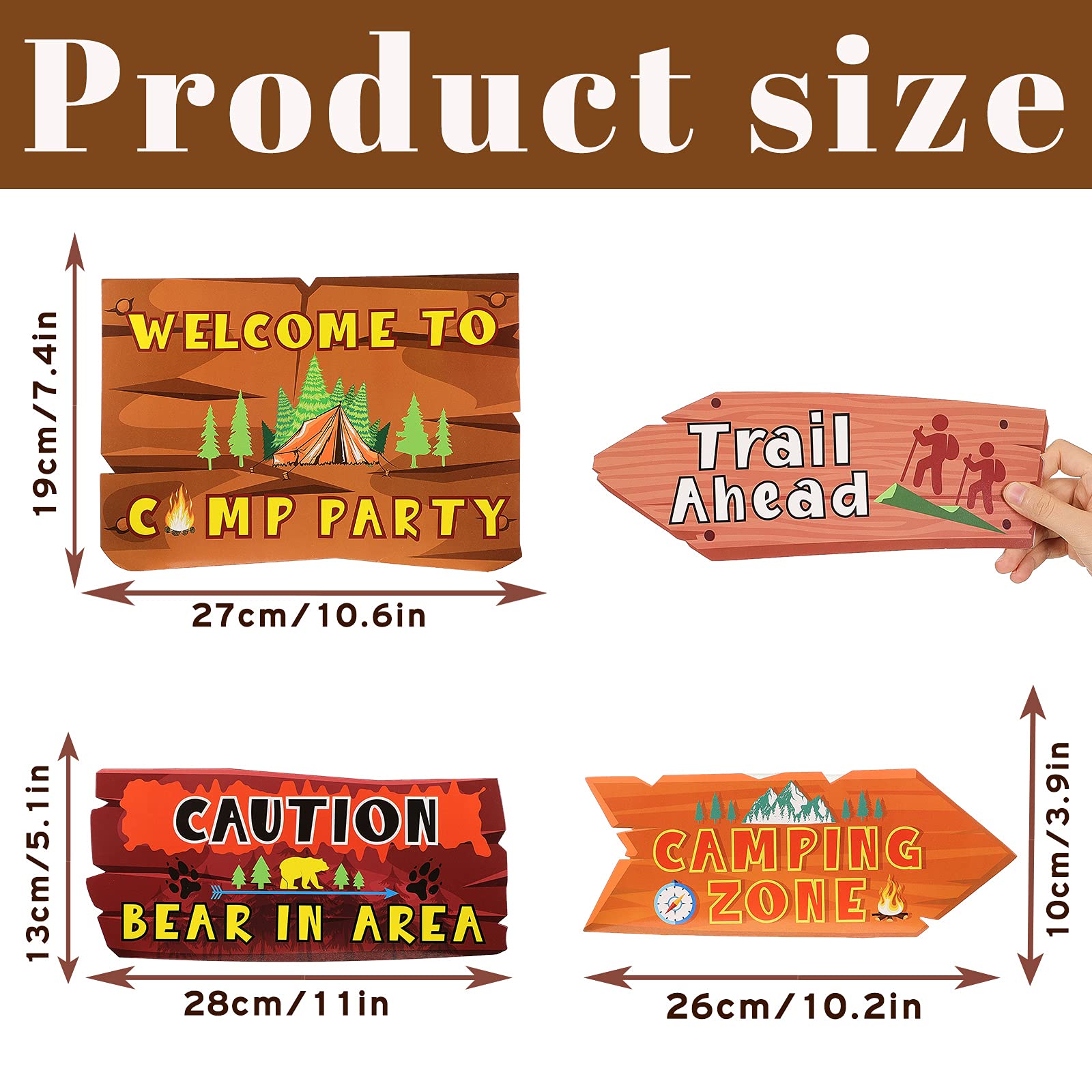 Proper size: the camping party signs are designed in different sizes, from 10.6 x 3.9 inches to 10.7 x 5.1 inches, adding an asymmetrical beauty to the interior decoration in your house; They take on chic and attractive looks to satisfy your various demands, adding a nice touch to your house
