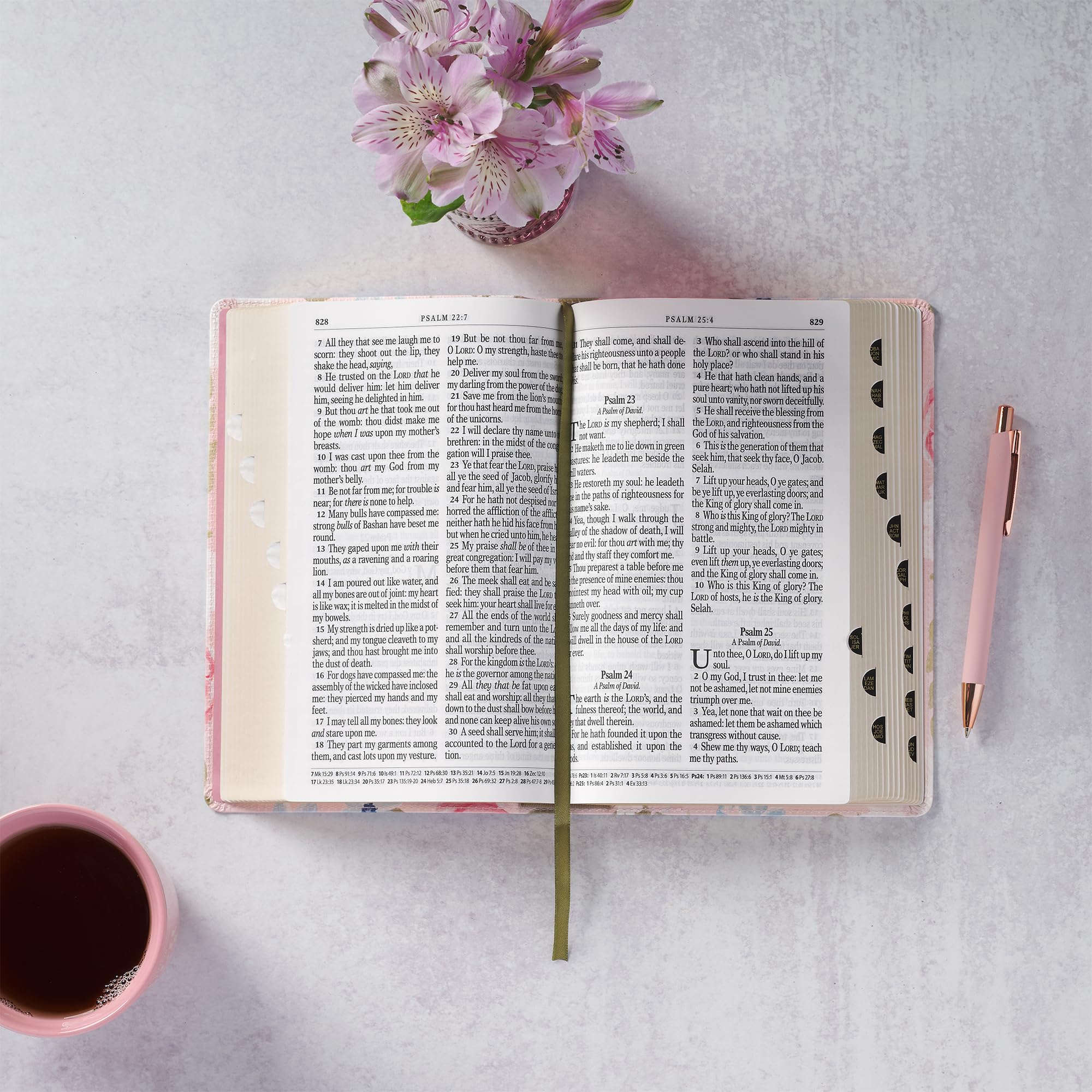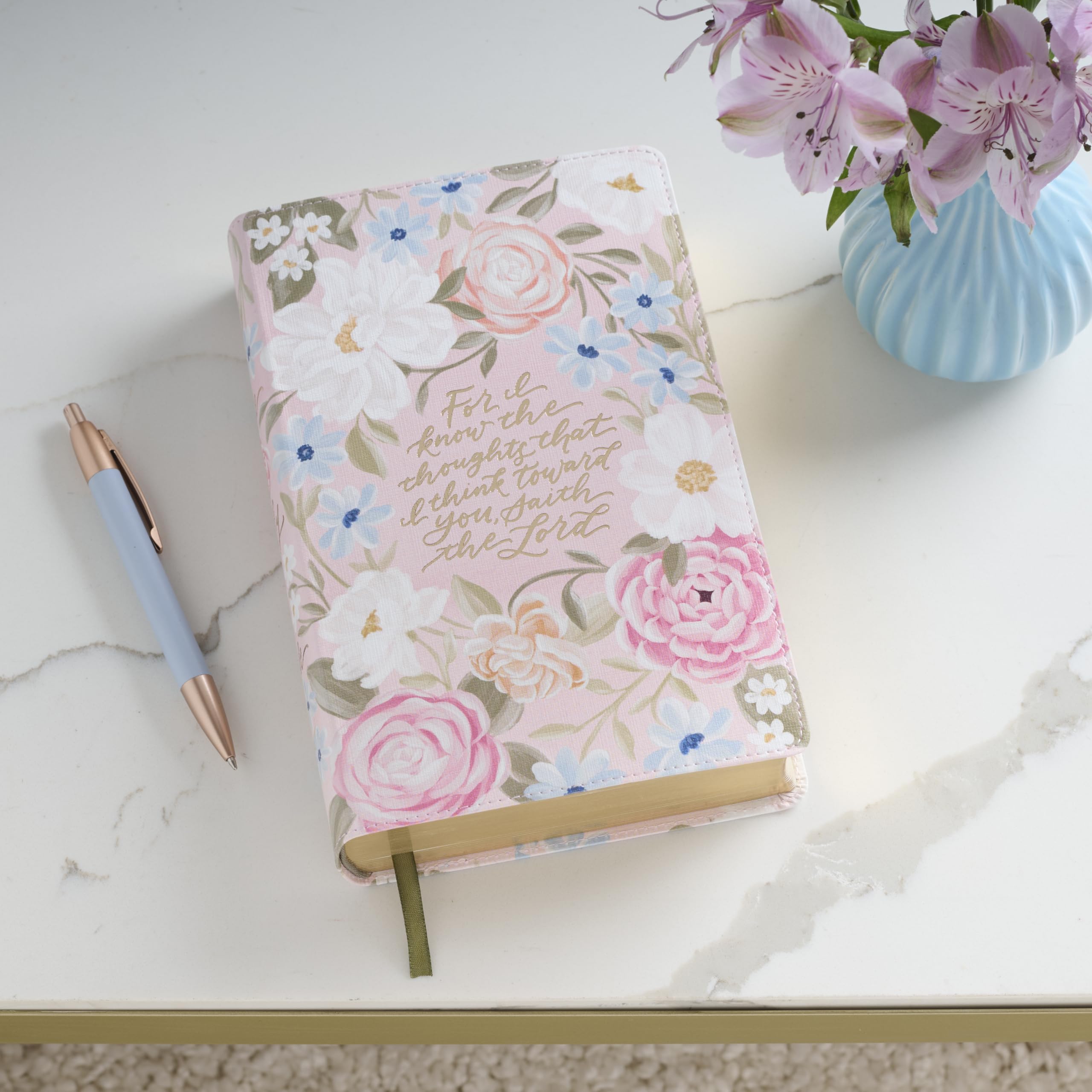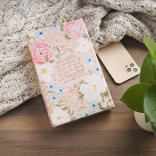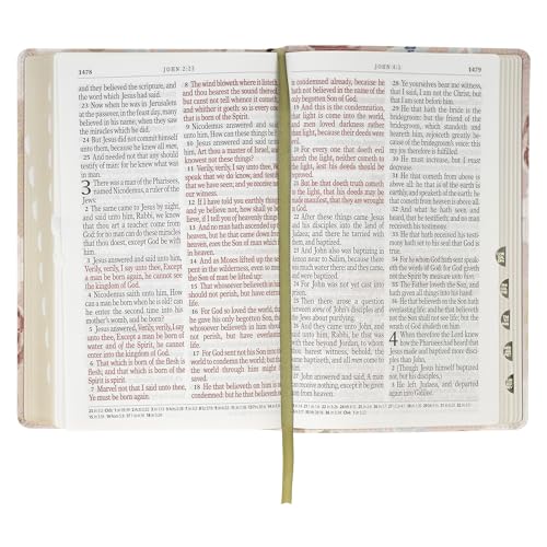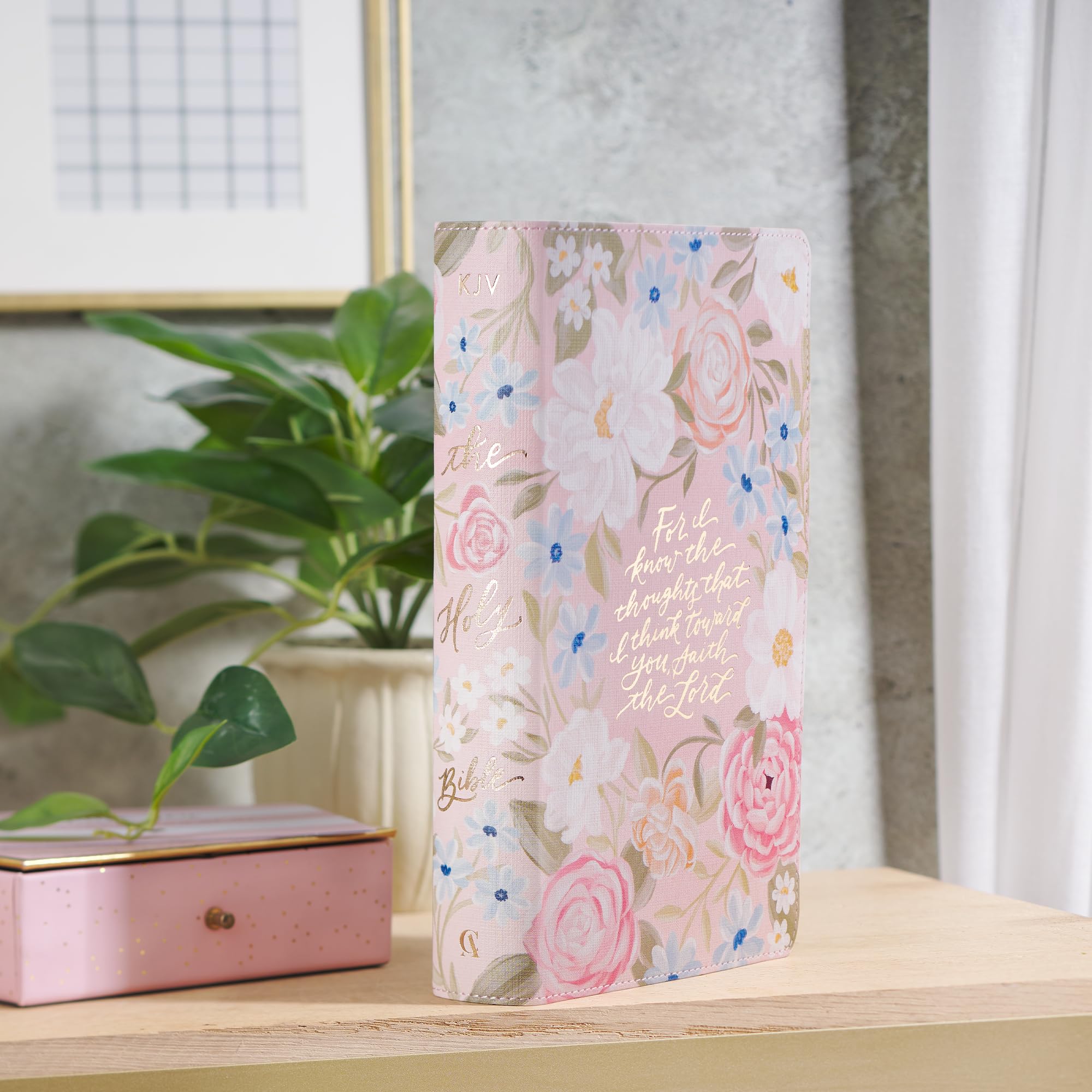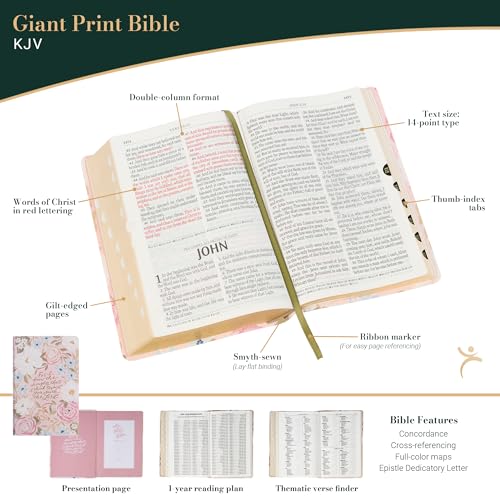 The Pink Floral Faux Leather Giant Print Standard-Size King James Version Bible with Thumb Index invites women to immerse themselves in Scripture with a design that radiates beauty and faith. The flexcover Bible's cover features the artwork of artist Allison Loveall. Blooms with soft pink and white roses, accented by delicate blue forget-me-nots and lush green leaves, are set against a subtle blush background. At the heart of the design, a hand-lettered verse in shimmering rose gold foil starts on the front cover and continues on the back. For I know the thoughts that I think toward you, saith the Lord, Thoughts of peace and not of evil, to give you an expected end. Jeremiah 29:11 The title is hand-lettered and accented with rose gold foil on the spine, while the translation name is displayed in matching rose gold foil at the top of the spine. The Holy Bible KJV The smooth faux leather cover is finished with sturdy pink topstitching and is constructed to hold up to daily use. Beautiful gold gilt-edged pages protect against dust and moisture and add a soft, elegant shine. Within its pages, the text is presented in a clear 14-point font, arranged in a double-column format for comfortable reading, especially for women seeking relief from eyestrain. Navigation is effortless with a contrasting green satin ribbon marker, thumb indexing for quick access to each book, and a thematic Scripture verse finder. Study tools enhance the experience. These tools include a concordance, the words of Christ in red ink, cross-referencing, and eight full-color maps that bring biblical landscapes to life. A one-year reading plan in the back makes it easy for women to follow a structured path through the Bible. The front presentation page leaves room for a personal note, perfect for marking special occasions and milestones. This King James Version Bible was written in eighteenth-century English, which women have loved for its beautiful poetic use of language and its accuracy for more than 400 years. The spelling and grammar are true to the time it was written and connect the reader to the sacred truths inside. Tucked inside a full-color cardstock sleeve, the Pink Floral Faux Leather Giant Print Standard-Size King James Version Bible with Thumb Index makes a sweet gift for a young lady's graduation, a new home blessing, or an Easter celebration. Its lovely floral design and well-thought-out features will inspire her daily moments with Scripture, and the Pink Floral Faux Leather Giant Print Standard-Size King James Version Bible with Thumb Index will become a special part of her faith journey. Printed floral design Pink faux leather Rose gold foiled verse For I know the thoughts that I think toward you, saith the Lord Thoughts of peace and not of evil, to give you an expected end. Jeremiah 29:11 Allison Loveall Design Rose gold-foiled spine title Classic King James Version Flexcover Standard size Thumb index 1802 gilt-edged pages Lay-flat spine Satin ribbon marker Double-column format Words of Christ in red ink Thematic Scripture verse finder One-year Bible reading plan Concordance Cross-referencing 8 full-color maps Presentation page Giant print 14-point type Packaged in a full-color cardstock sleeve Size: 8.9" x 5.7" x 1.7" (226 x 145 x 43mm)