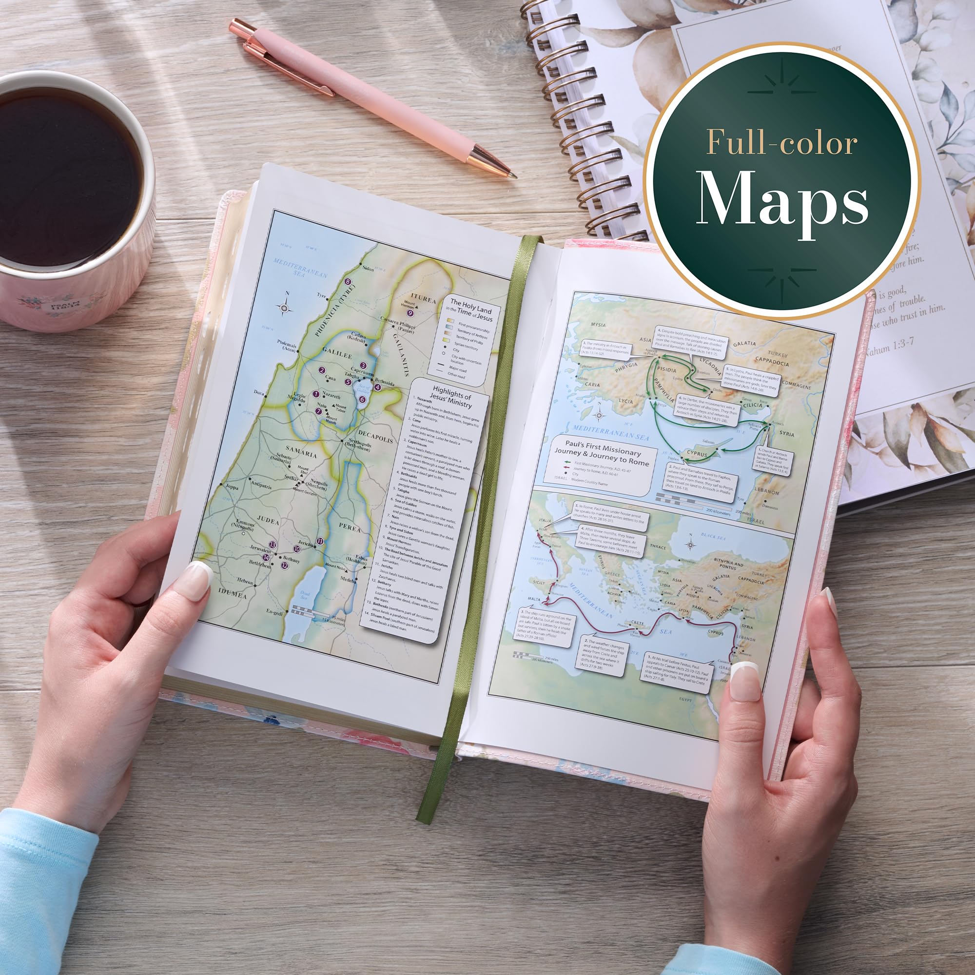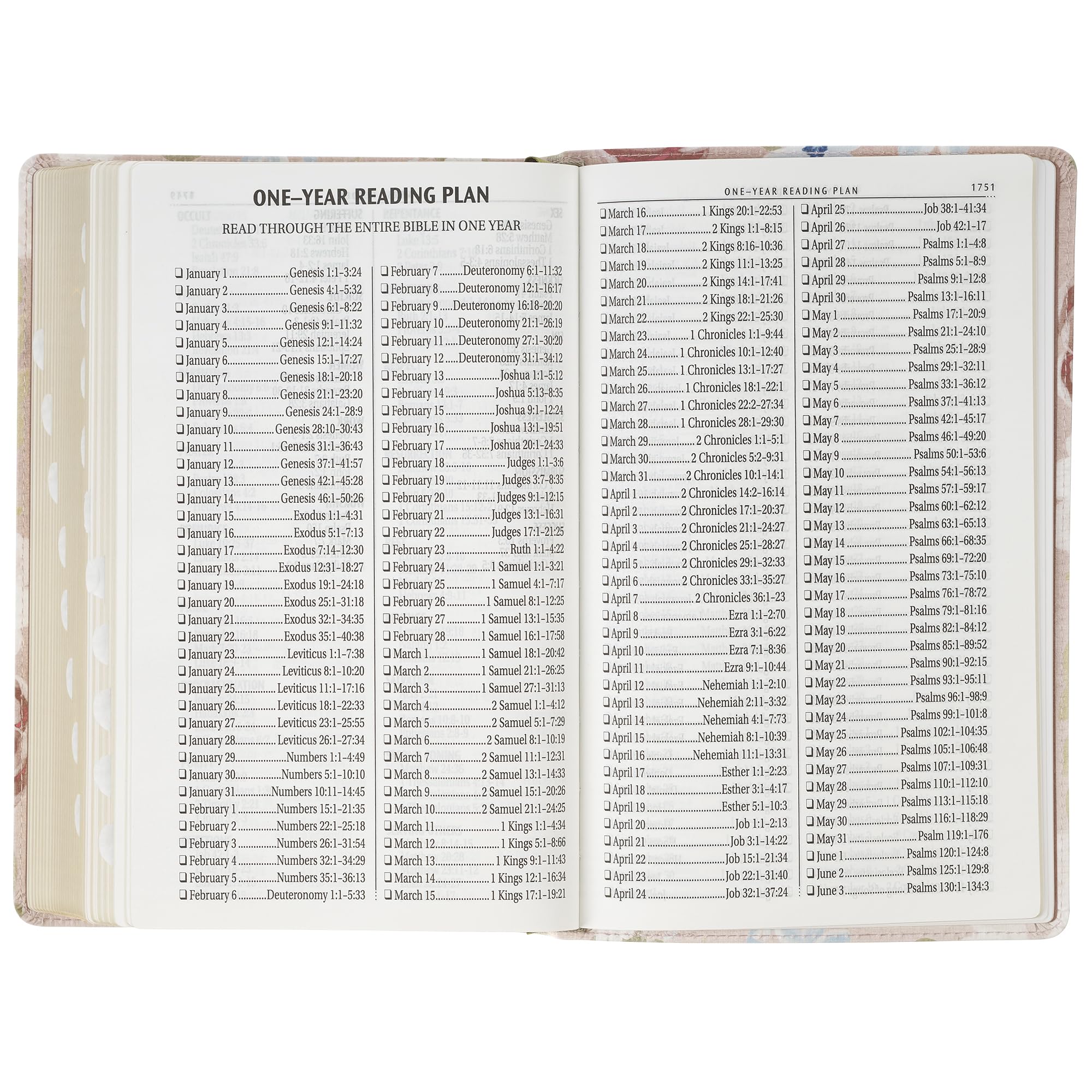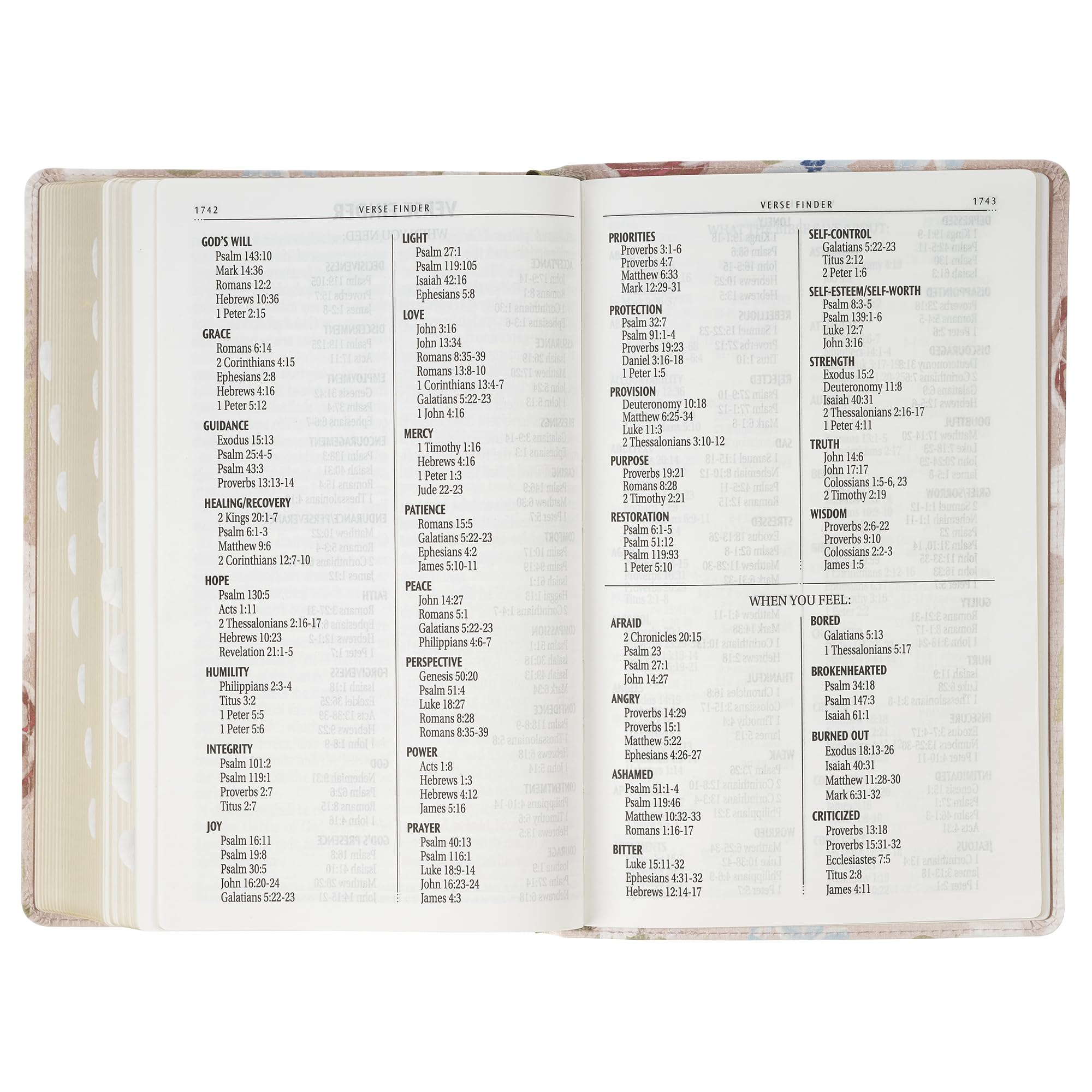 The Pink Floral Faux Leather Giant Print Standard-Size King James Version Bible with Thumb Index invites women to immerse themselves in Scripture with a design that radiates beauty and faith. The flexcover Bible's cover features the artwork of artist Allison Loveall. Blooms with soft pink and white roses, accented by delicate blue forget-me-nots and lush green leaves, are set against a subtle blush background. At the heart of the design, a hand-lettered verse in shimmering rose gold foil starts on the front cover and continues on the back. For I know the thoughts that I think toward you, saith the Lord, Thoughts of peace and not of evil, to give you an expected end. Jeremiah 29:11 The title is hand-lettered and accented with rose gold foil on the spine, while the translation name is displayed in matching rose gold foil at the top of the spine. The Holy Bible KJV The smooth faux leather cover is finished with sturdy pink topstitching and is constructed to hold up to daily use. Beautiful gold gilt-edged pages protect against dust and moisture and add a soft, elegant shine. Within its pages, the text is presented in a clear 14-point font, arranged in a double-column format for comfortable reading, especially for women seeking relief from eyestrain. Navigation is effortless with a contrasting green satin ribbon marker, thumb indexing for quick access to each book, and a thematic Scripture verse finder. Study tools enhance the experience. These tools include a concordance, the words of Christ in red ink, cross-referencing, and eight full-color maps that bring biblical landscapes to life. A one-year reading plan in the back makes it easy for women to follow a structured path through the Bible. The front presentation page leaves room for a personal note, perfect for marking special occasions and milestones. This King James Version Bible was written in eighteenth-century English, which women have loved for its beautiful poetic use of language and its accuracy for more than 400 years. The spelling and grammar are true to the time it was written and connect the reader to the sacred truths inside. Tucked inside a full-color cardstock sleeve, the Pink Floral Faux Leather Giant Print Standard-Size King James Version Bible with Thumb Index makes a sweet gift for a young lady's graduation, a new home blessing, or an Easter celebration. Its lovely floral design and well-thought-out features will inspire her daily moments with Scripture, and the Pink Floral Faux Leather Giant Print Standard-Size King James Version Bible with Thumb Index will become a special part of her faith journey. Printed floral design Pink faux leather Rose gold foiled verse For I know the thoughts that I think toward you, saith the Lord Thoughts of peace and not of evil, to give you an expected end. Jeremiah 29:11 Allison Loveall Design Rose gold-foiled spine title Classic King James Version Flexcover Standard size Thumb index 1802 gilt-edged pages Lay-flat spine Satin ribbon marker Double-column format Words of Christ in red ink Thematic Scripture verse finder One-year Bible reading plan Concordance Cross-referencing 8 full-color maps Presentation page Giant print 14-point type Packaged in a full-color cardstock sleeve Size: 8.9" x 5.7" x 1.7" (226 x 145 x 43mm)