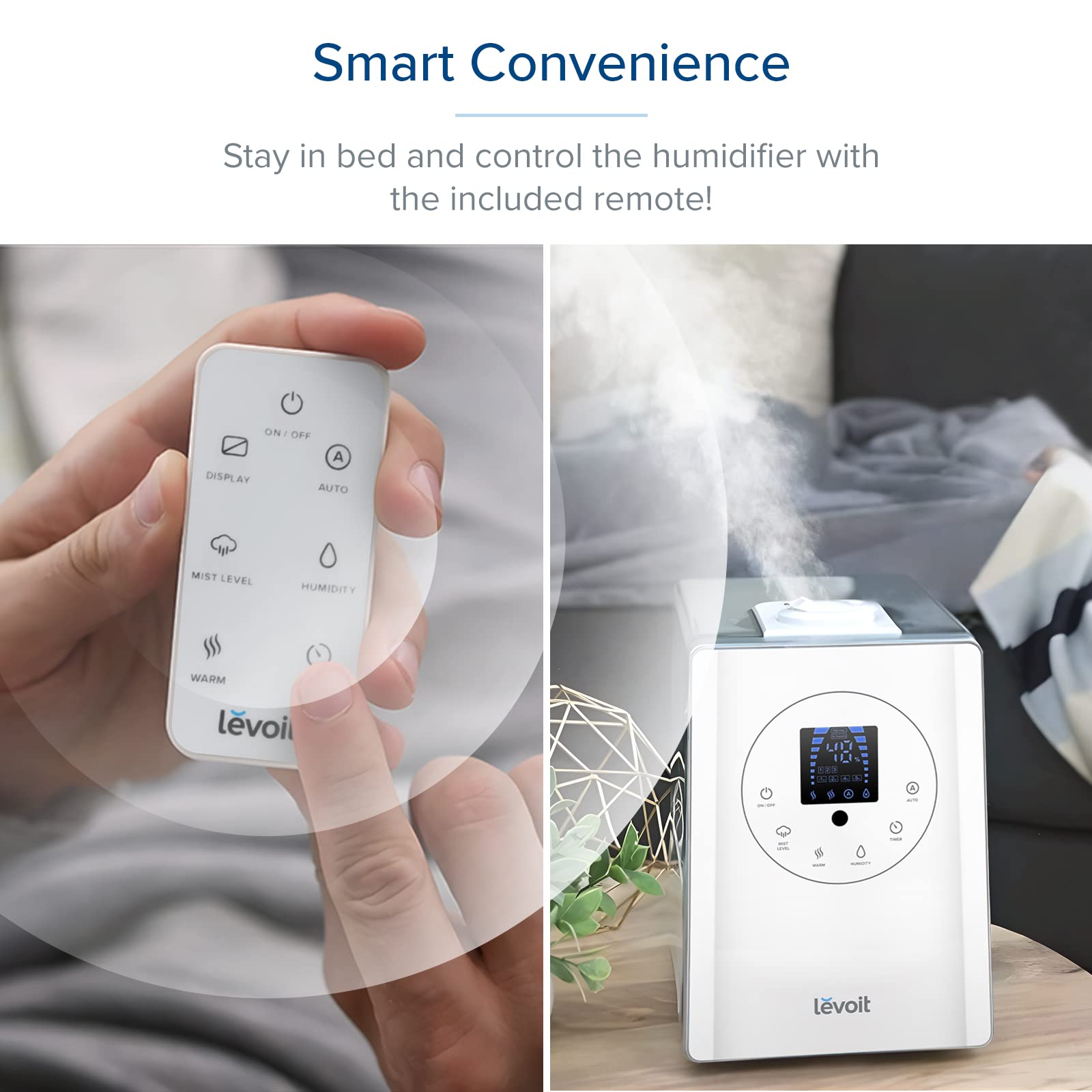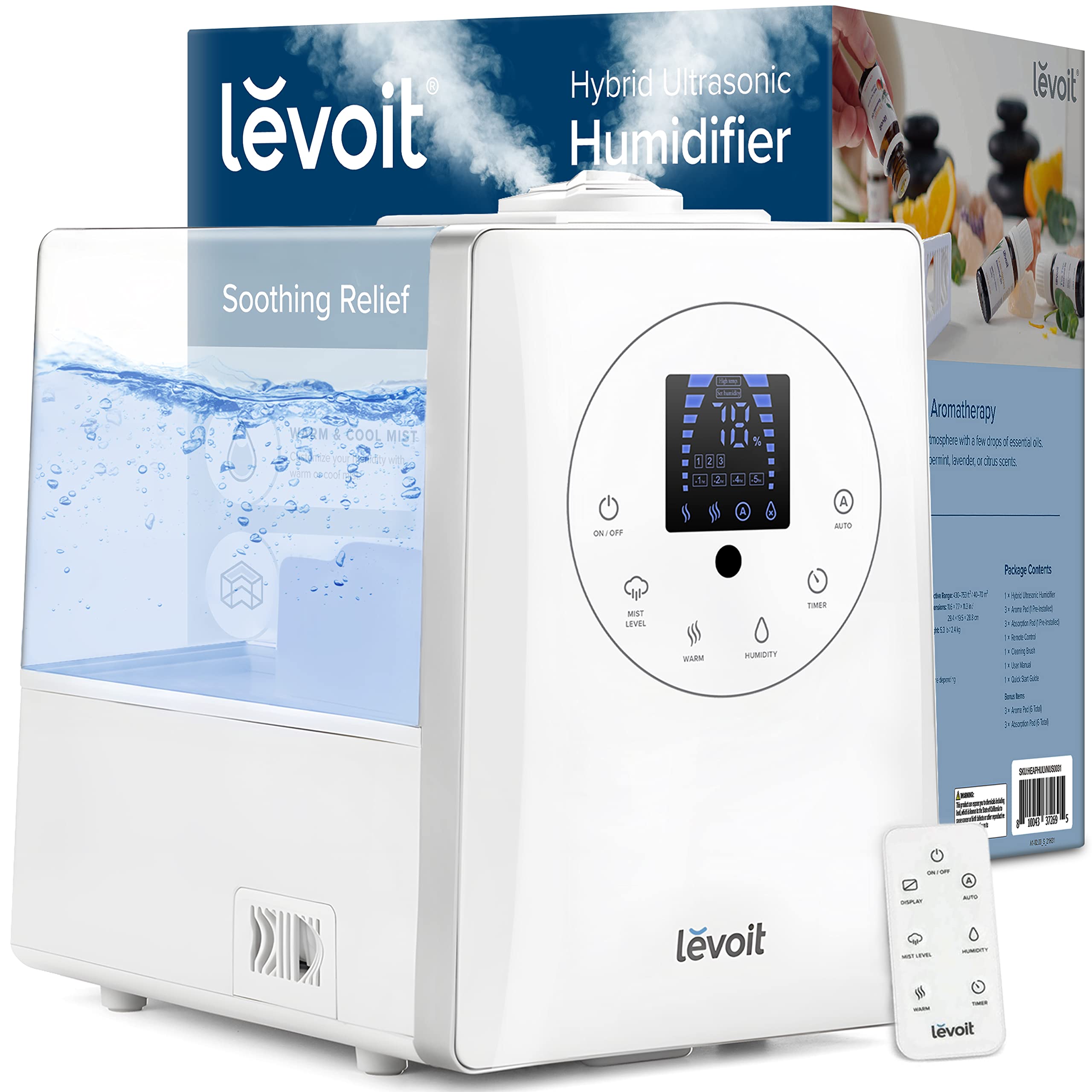 Warm and cool mist ultrasonic humidifier disperse warm and cool mist throughout your living spaces to create a soothing atmosphere at home with the LEVOIT Hybrid Ultrasonic Humidifier. Got a cold or the flu? The warm, soothing mist helps you relieve from cold,flu,and mineral dust around your living spaces. If you have trouble sleeping at night, the cool mist will alleviate congestion or a cough by keeping your throat and nasal passages hydrated. Moisturize your skin and reduce static electricity in your home with the cool mist function. Technical Specifications: Voltage: AC 120V / 60Hz Rated Power: 280W Water Tank Capacity: 6L (1. 59 gals) Max Cool Moisture Capacity: 300ml/h Max Warm Moisture Capacity: 500ml/h Running Time: 50 hours Package Included: 1 x Hybrid Ultrasonic Humidifier 1 x Remote Control 1 x Cleaning Brush 3 x Aroma Pads (1 pre-installed) 3 x Absorption Pads (1 pre-installed) 1 x User Manual Note: Use distilled water or filtered water instead of tap water, use tap water might leave white dust and grow mold. DO NOT put the humidifier on the wooden floor or wooden furniture directly unless a towel is placed on the wooden surface. Use caution when setting the warm mist function, the mist being diffused is hot. Clean once a week to prevent buildups and extend product lifetime. The minimum amount of water needed for the humidifier to function is 2cups (480ml). It is recommended to place the humidifier on elevated-level surfaces such as desktops, tables, or nightstands.