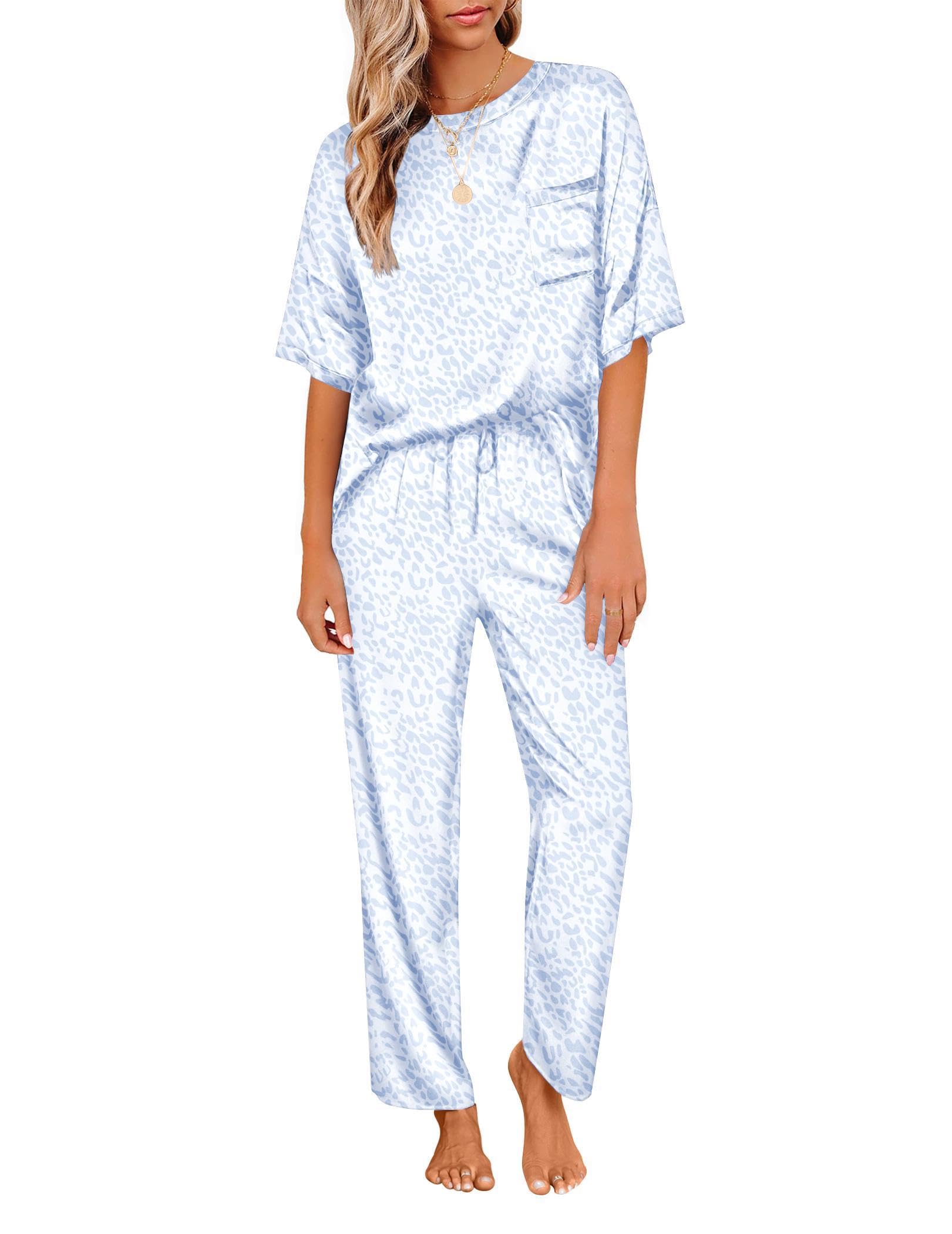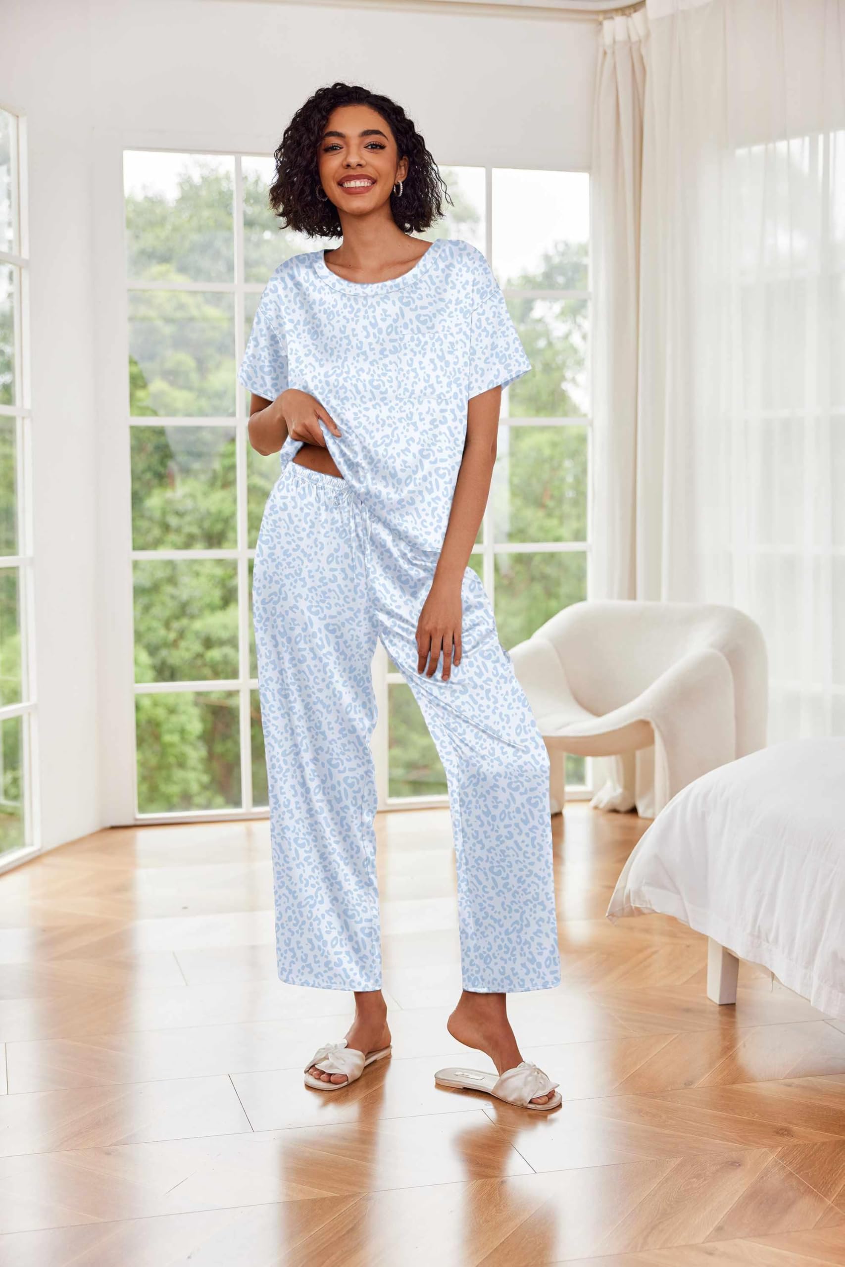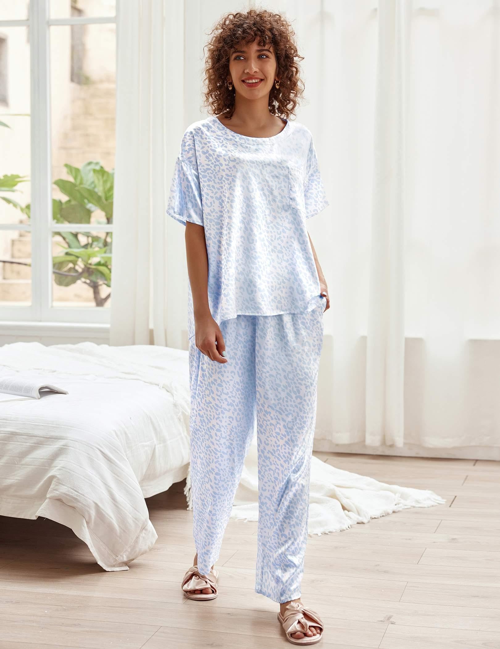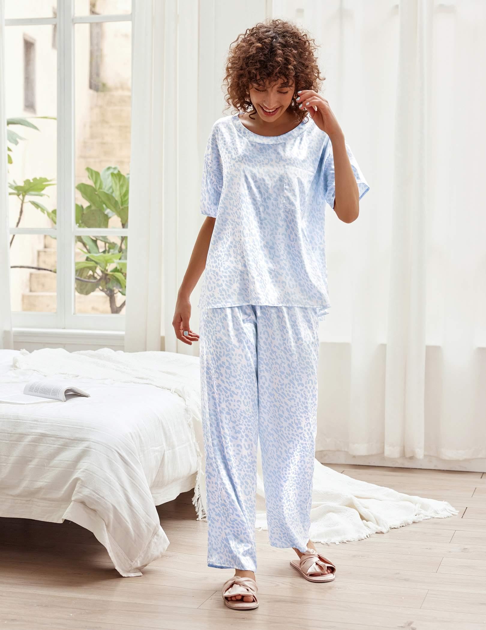 A lightweight two-piece pajama set featuring a pullover tee top and long pants. Soft satin silky fabric, comfy to wear.