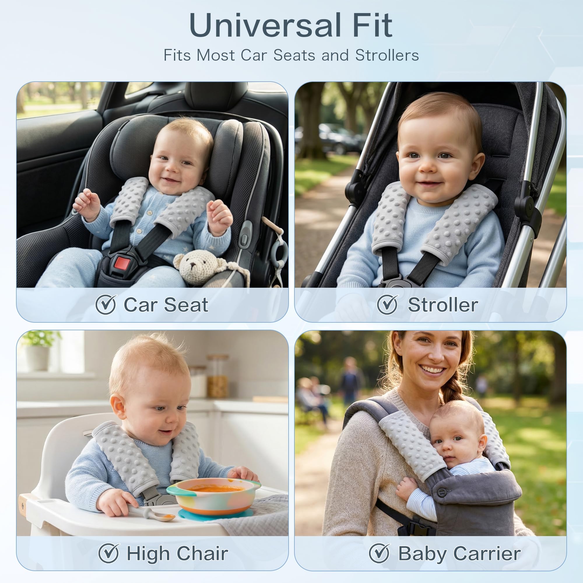 【Multiple Use】: Our car seat strap protectors are perfectly suitful for all the car seats, strollers, pushchairs and infant carriers etc