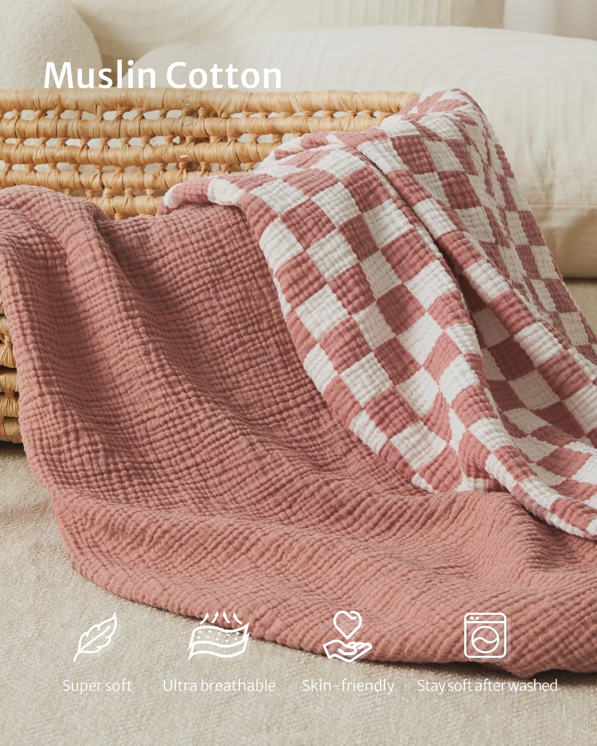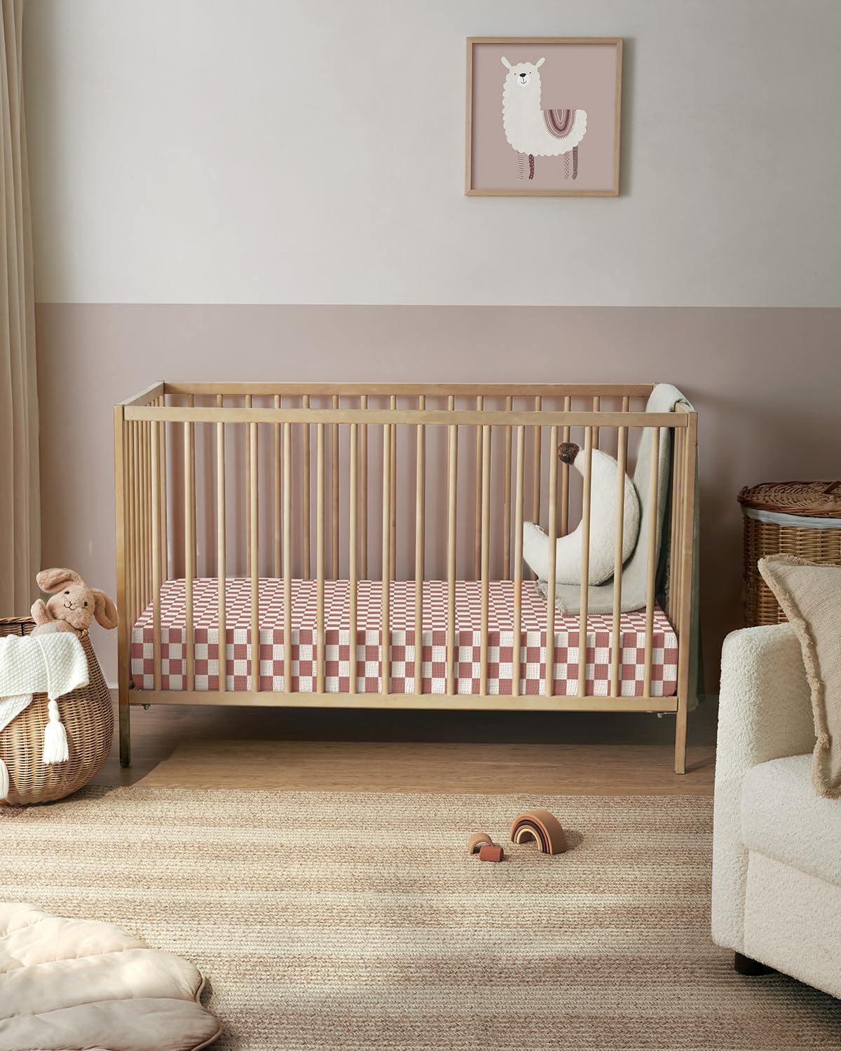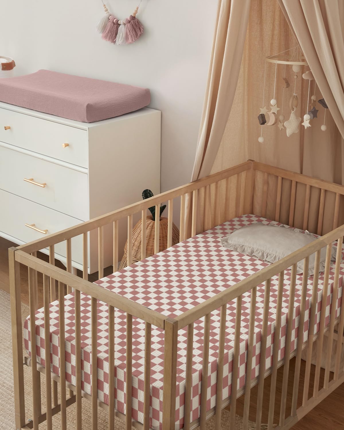 Blissful Diary Muslin Crib Sheets for Girl Boy, Boho Neutral Soft Cotton Baby Sheet for 52''x28'' Standard Crib Mattress, 2 Pack(Dusty Pink Checkboard & Dusty Pink)