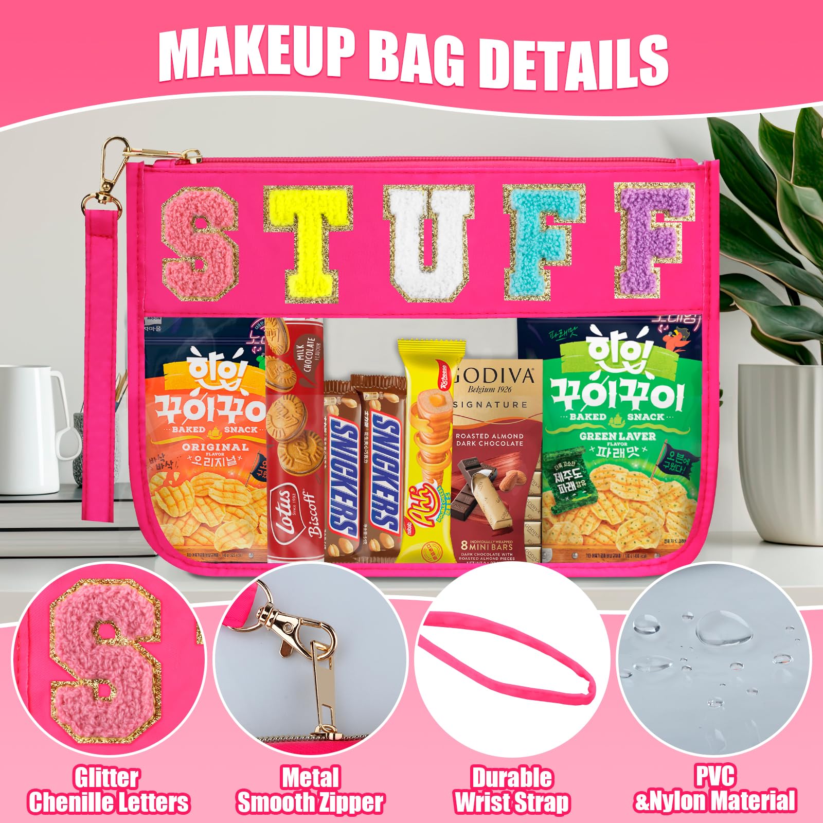 Stylish Duo: This stuff bag set includes a large chenille-lettered 'STUFF' bag and a compact makeup pouch, perfect for organizing and toting your essentials.
