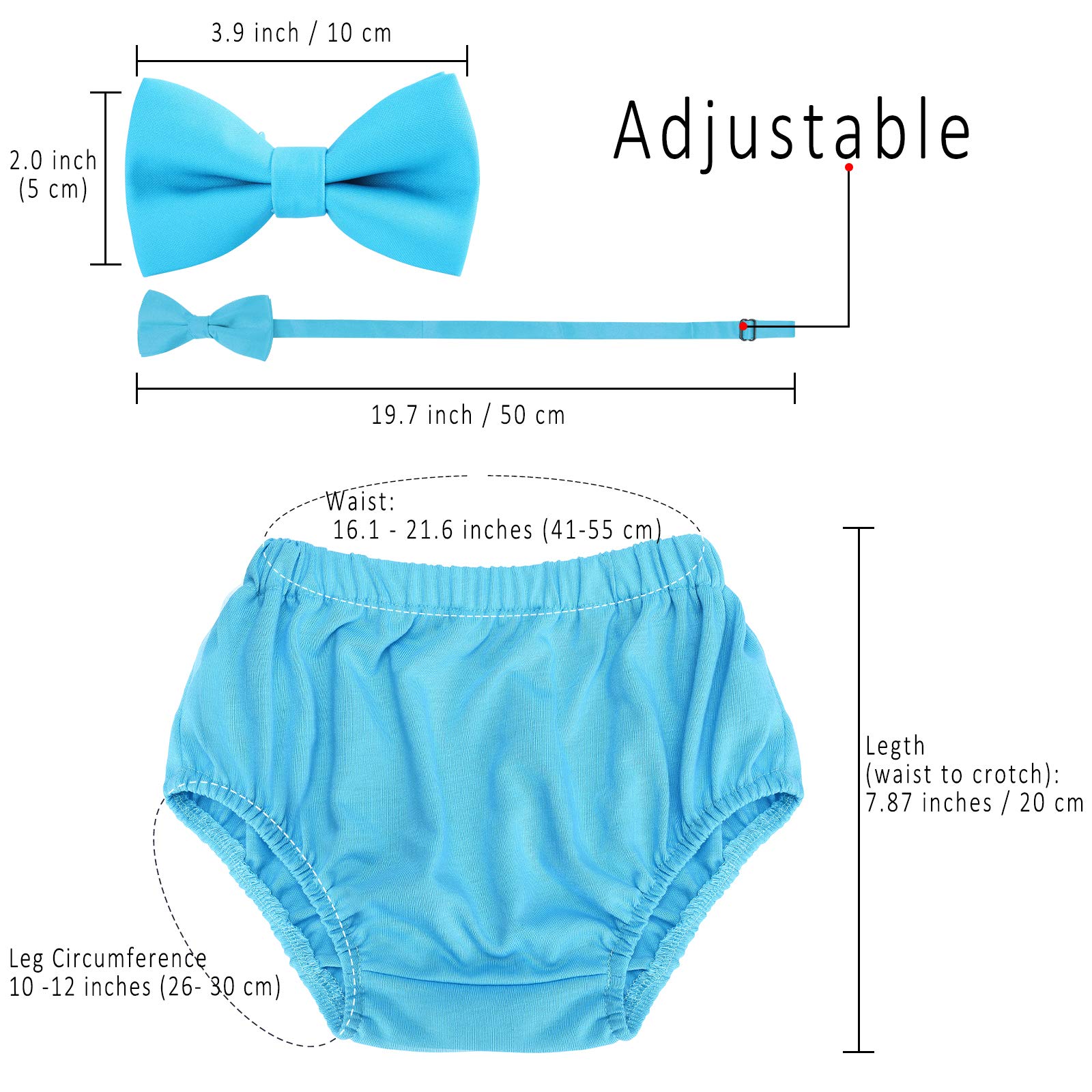 【Size】: Cake pants:waist: 16.1-21.6"/41-55cm, length (waist to crotch): 7.87"/20cm. Suspenders:max length: 25.0"/63.5cm. Bowtie: the 2 * 4'',circumference: 12-17.7"/30-45cm. Crown: 7 x 8CM, 2.7" x 3.1"