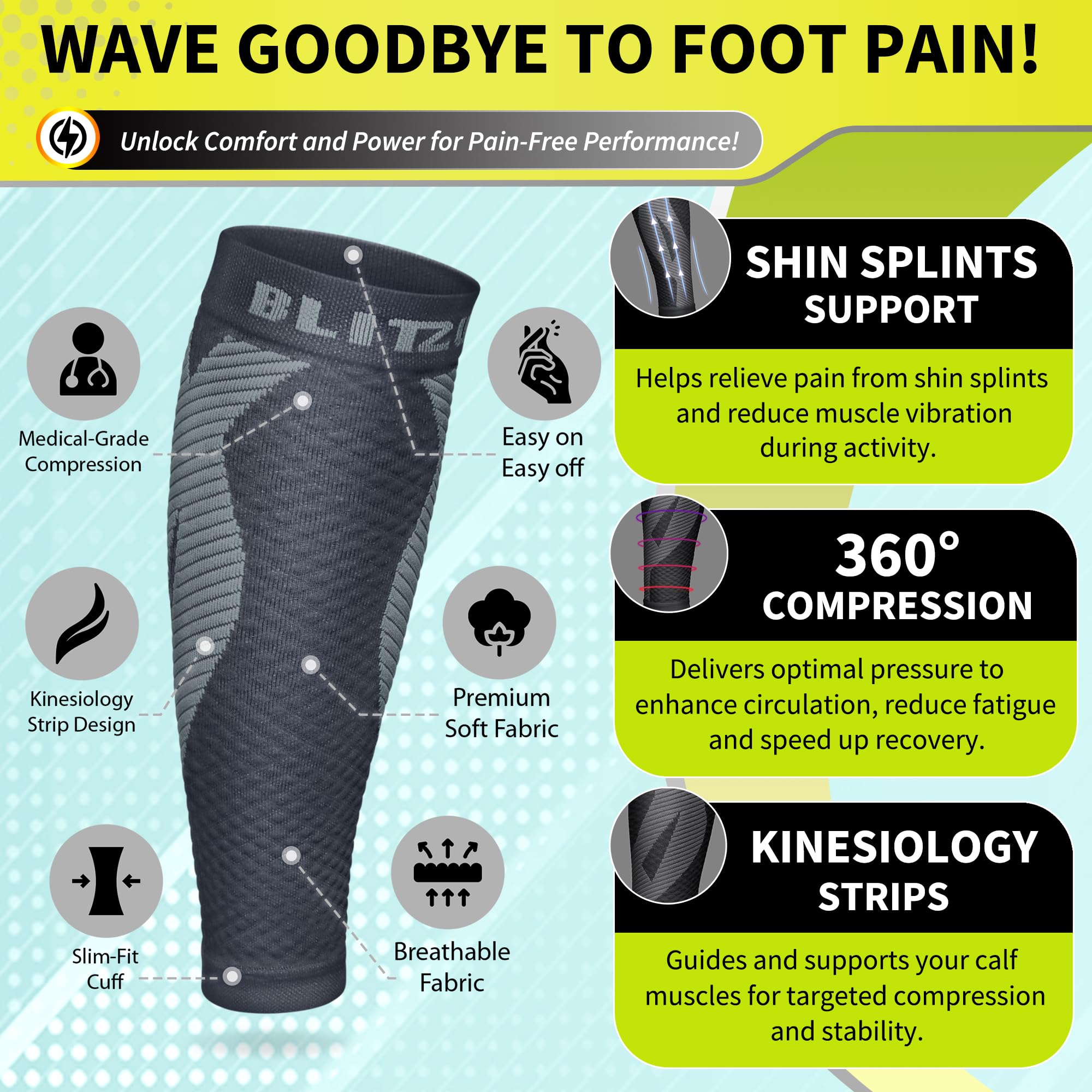 Patented Kinesiology Strips for Targeted Pain Relief: Developed and patented in New York, our calf compression sleeves incorporate advanced kinesiology strips that provide superior support, stability, and pain reduction. Designed using the renowned kinesiology technique, these strips promote natural pain relief and accelerate recovery by improving muscle function and reducing fatigue.