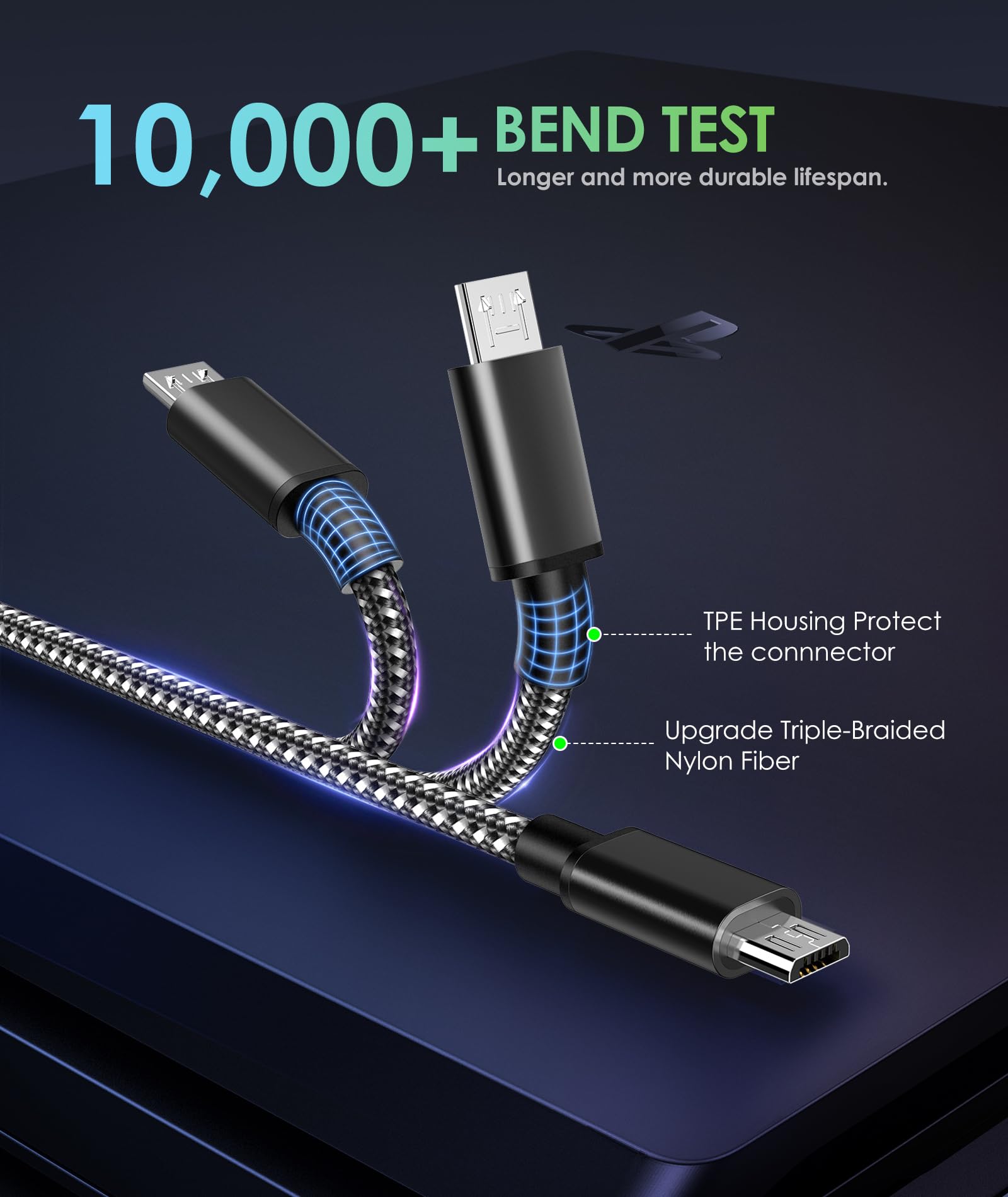 Durable Construction: Our cables are reinforced with ballistic aramid fiber, a triple-braided tangle-resistant nylon exterior, and laser-welded aluminum connectors. Withstand at least 10,000 90-degree bend tests, ensuring durability beyond common USB cables