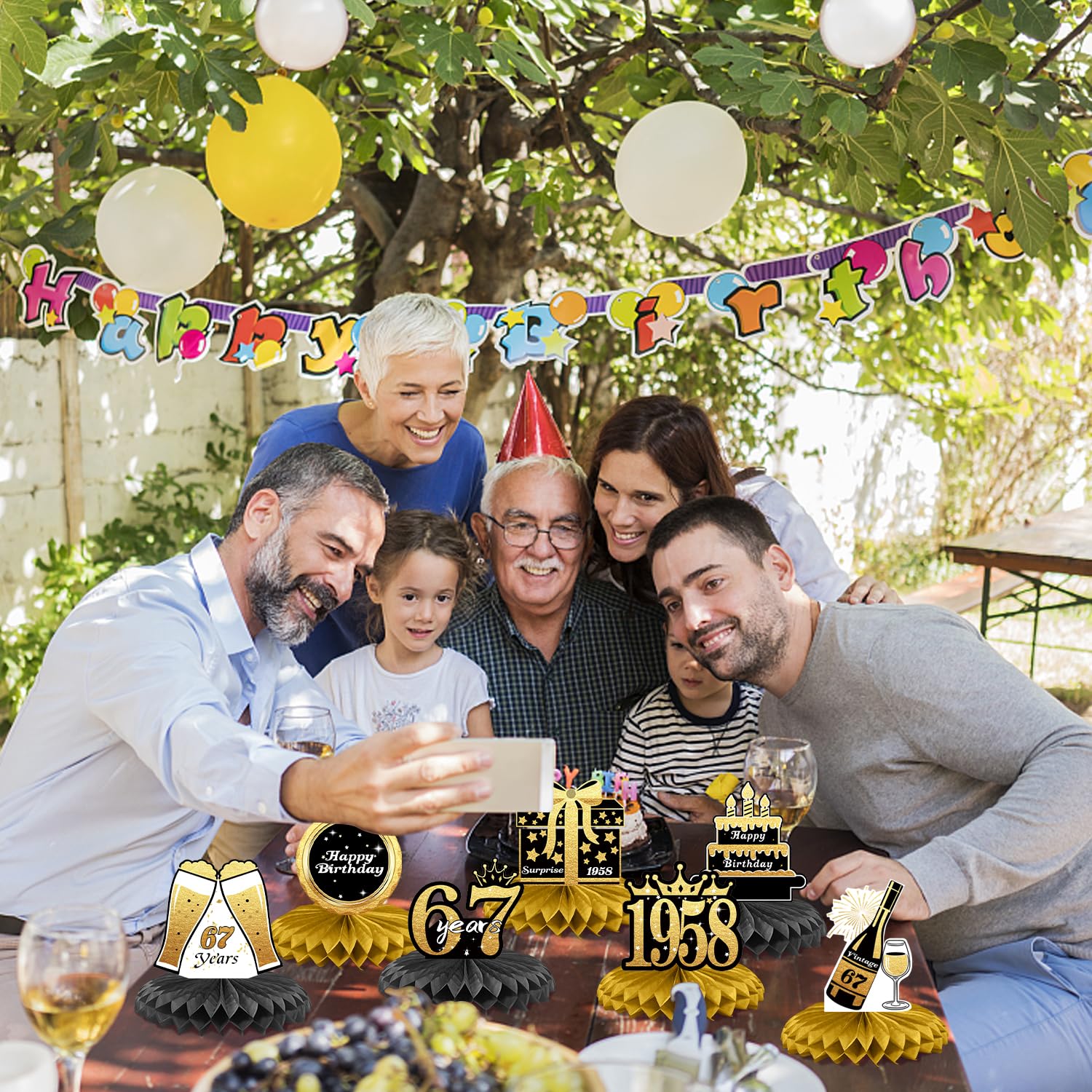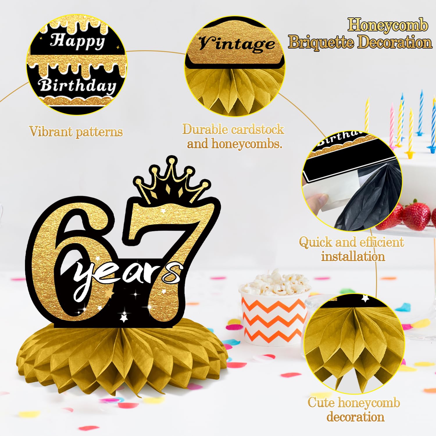 【67th Party Decoration】This versatile honeycomb centerpiece is perfect for mother and dad, friends, and more. It can be used as a thoughtful birthday decoration, stylish photo prop, party centerpiece, or keepsake for the special day.