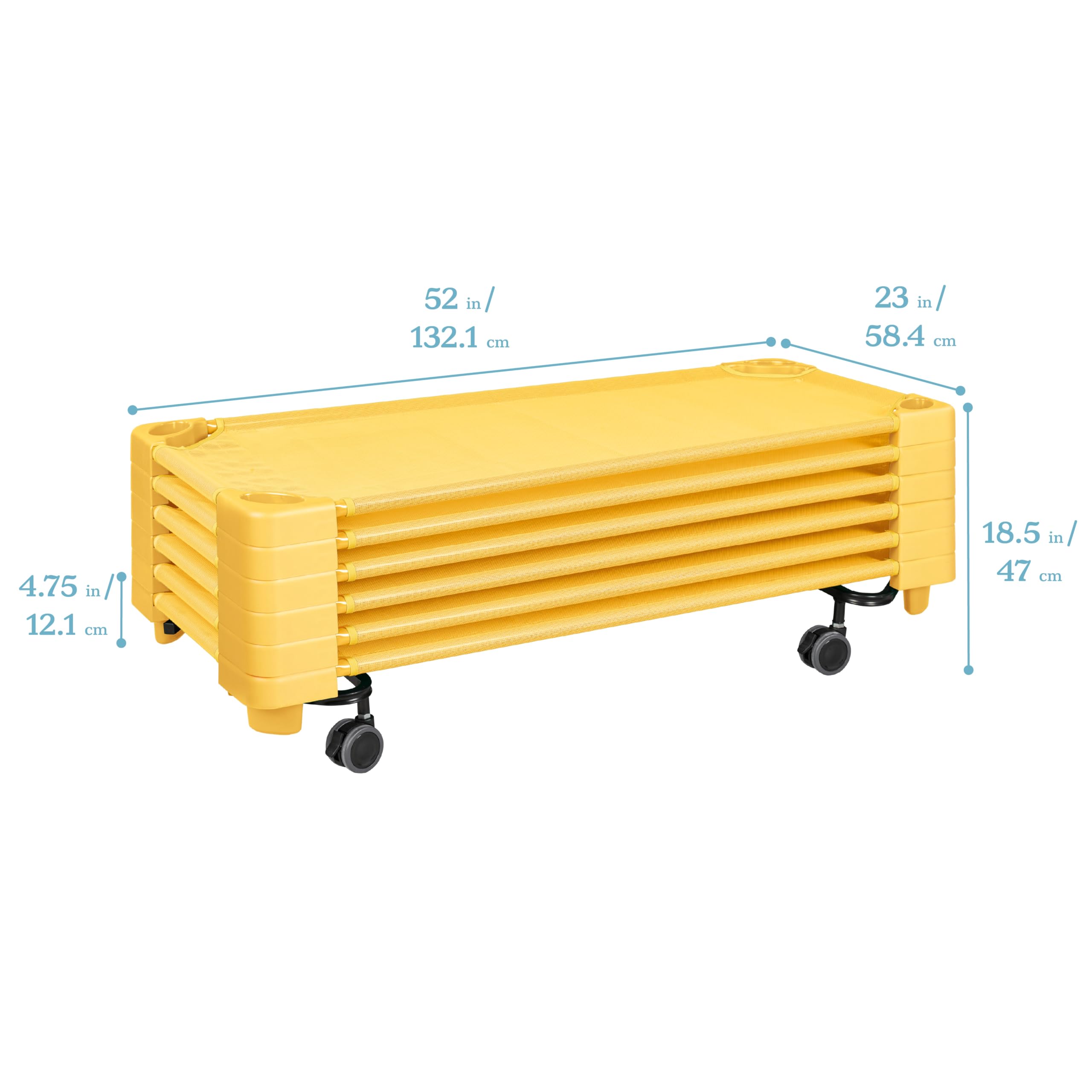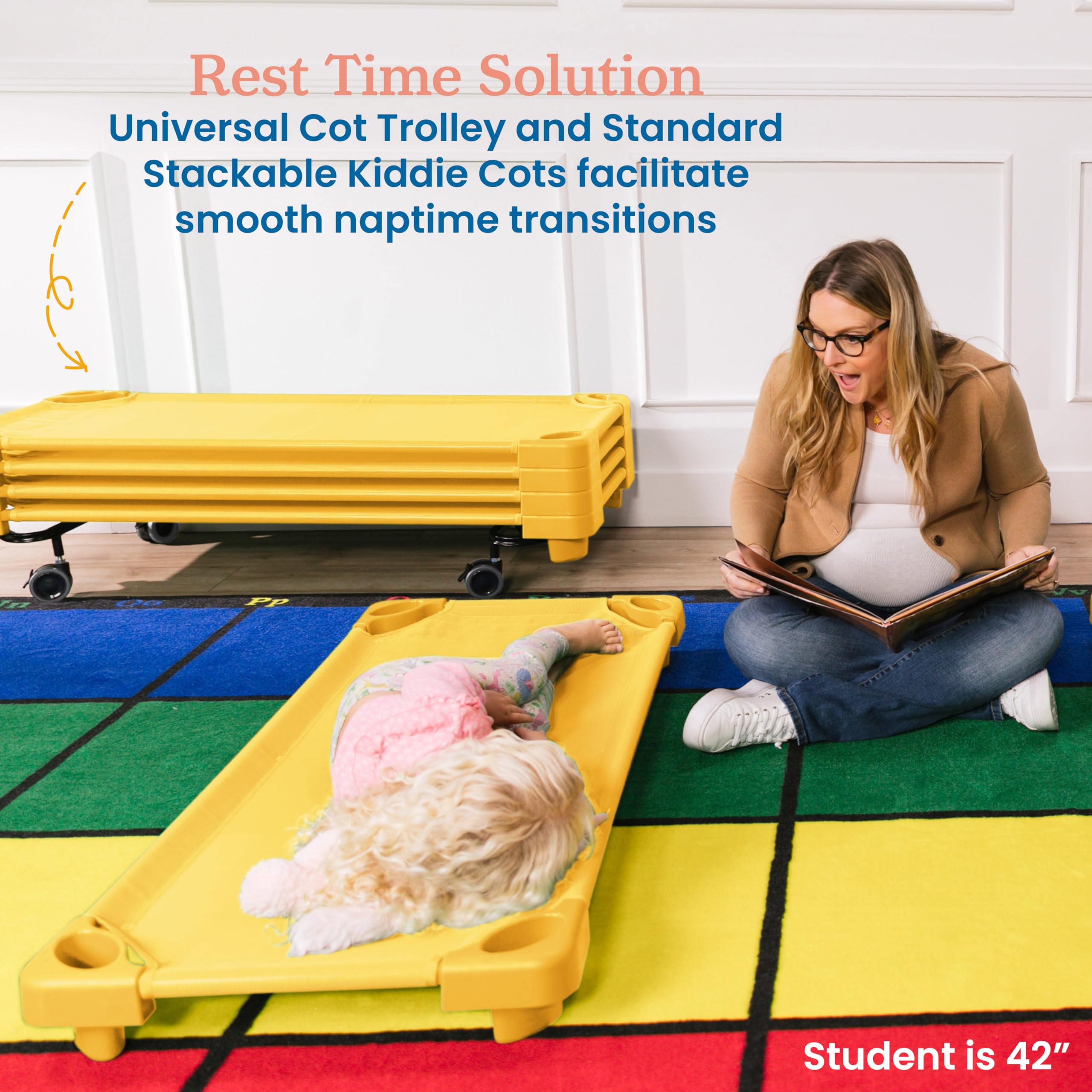 Mobile Cart: A nap cot carrier is designed for vertical classroom storage; storage cart has an open-ended design simplifying stacking, maximizing daycare, preschool, and classroom space
